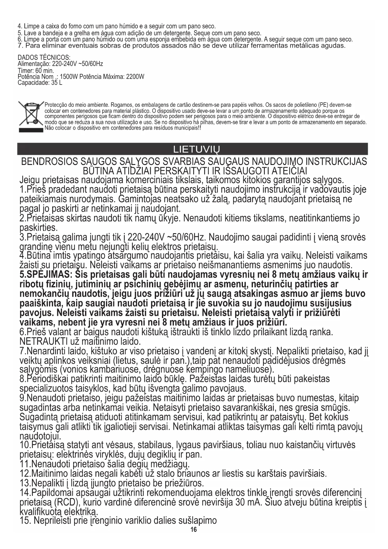 Alimentação: 220-240V ~50/60Hz 6.Prieš valant ar baigus naudoti kištuką ištraukti iš tinklo lizdo prilaikant lizdą ranka. NETRAUKTI už maitinimo laido. 8.Periodiškai patikrinti maitinimo laido būklę. Pažeistas laidas turėtų būti pakeistas specializuotos taisyklos, kad būtų išvengta galimo pavojaus. Jeigu prietaisas naudojama komerciniais tikslais, taikomos kitokios garantijos sąlygos. 10.Prietaisą statyti ant vėsaus, stabilaus, lygaus paviršiaus, toliau nuo kaistančių virtuvės prietaisų: elektrinės viryklės, dujų degiklių ir pan. 11.Nenaudoti prietaiso šalia degių medžiagų. 12.Maitinimo laidas negali kabėti už stalo briaunos ar liestis su karštais paviršiais. 2.Prietaisas skirtas naudoti tik namų ūkyje. Nenaudoti kitiems tikslams, neatitinkantiems jo paskirties. BENDROSIOS SAUGOS SĄLYGOS SVARBIAS SAUGAUS NAUDOJIMO INSTRUKCIJAS BŪTINA ATIDŽIAI PERSKAITYTI IR IŠSAUGOTI ATEIČIAI 9.Nenaudoti prietaiso, jeigu pažeistas maitinimo laidas ar prietaisas buvo numestas, kitaip sugadintas arba netinkamai veikia. Netaisyti prietaiso savarankiškai, nes gresia smūgis. Sugadintą prietaisą atiduoti atitinkamam servisui, kad patikrintų ar pataisytų. Bet kokius taisymus gali atlikti tik įgaliotieji servisai. Netinkamai atliktas taisymas gali kelti rimtą pavojų naudotojui. 13.Nepalikti į lizdą įjungto prietaiso be priežiūros. 7.Nenardinti laido, kištuko ar viso prietaiso į vandenį ar kitokį skystį. Nepalikti prietaiso, kad jį veiktų aplinkos veiksniai (lietus, saulė ir pan.),taip pat nenaudoti padidėjusios drėgmės sąlygomis (vonios kambariuose, drėgnuose kempingo nameliuose). 1.Prieš pradedant naudoti prietaisą būtina perskaityti naudojimo instrukciją ir vadovautis joje pateikiamais nurodymais. Gamintojas neatsako už žalą, padarytą naudojant prietaisą ne pagal jo paskirti ar netinkamai jį naudojant. 3.Prietaisą galima jungti tik į 220-240V ~50/60Hz. Naudojimo saugai padidinti į vieną srovės grandinę vienu metu nejungti kelių elektros prietaisų. 4.Būtina imtis ypatingo atsargumo naudojantis prietaisu, kai šalia yra vaikų. Neleisti vaikams žaisti su prietaisu. Neleisti vaikams ar prietaiso neišmanantiems asmenims juo naudotis. 5.SPĖJIMAS: Šis prietaisas gali būti naudojamas vyresnių nei 8 metų amžiaus vaikų ir ribotų fizinių, jutiminių ar psichinių gebėjimų ar asmenų, neturinčių patirties ar nemokančių naudotis, jeigu juos prižiūri už jų saugą atsakingas asmuo ar jiems buvo paaiškinta, kaip saugiai naudoti prietaisą ir jie suvokia su jo naudojimu susijusius pavojus. Neleisti vaikams žaisti su prietaisu. Neleisti prietaisą valyti ir prižiūrėti vaikams, nebent jie yra vyresni nei 8 metų amžiaus ir juos prižiūri. 14.Papildomai apsaugai užtikrinti rekomenduojama elektros tinkle įrengti srovės diferencinį prietaisą (RCD), kurio vardinė diferencinė srovė neviršija 30 mA. Šiuo atveju būtina kreiptis į kvalifikuotą elektriką.