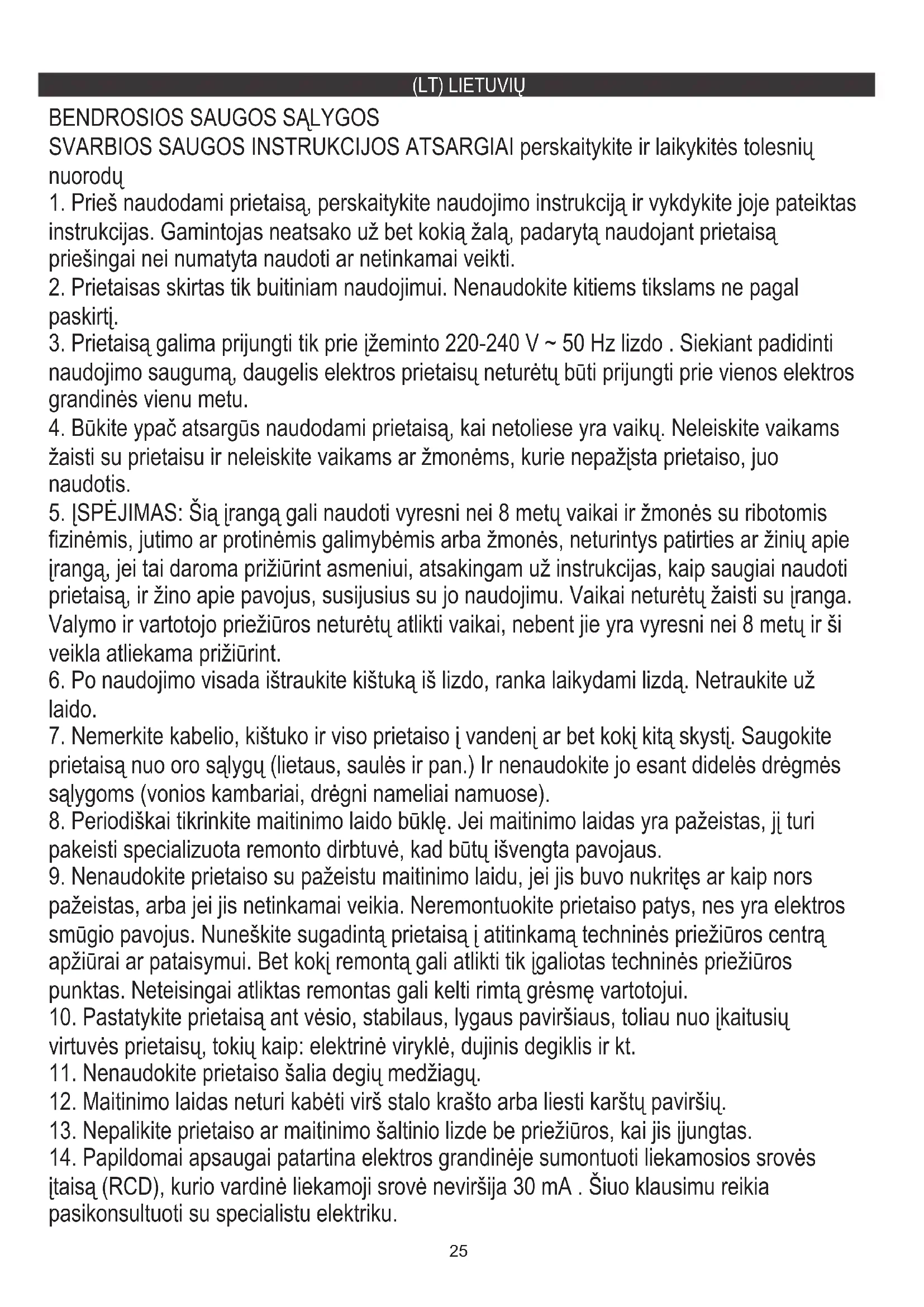 įtaisą (RCD), kurio vardinė liekamoji srovė neviršija 30 mA . Šiuo klausimu reikia pasikonsultuoti su specialistu elektriku. (LT) LIETUVIŲ26
