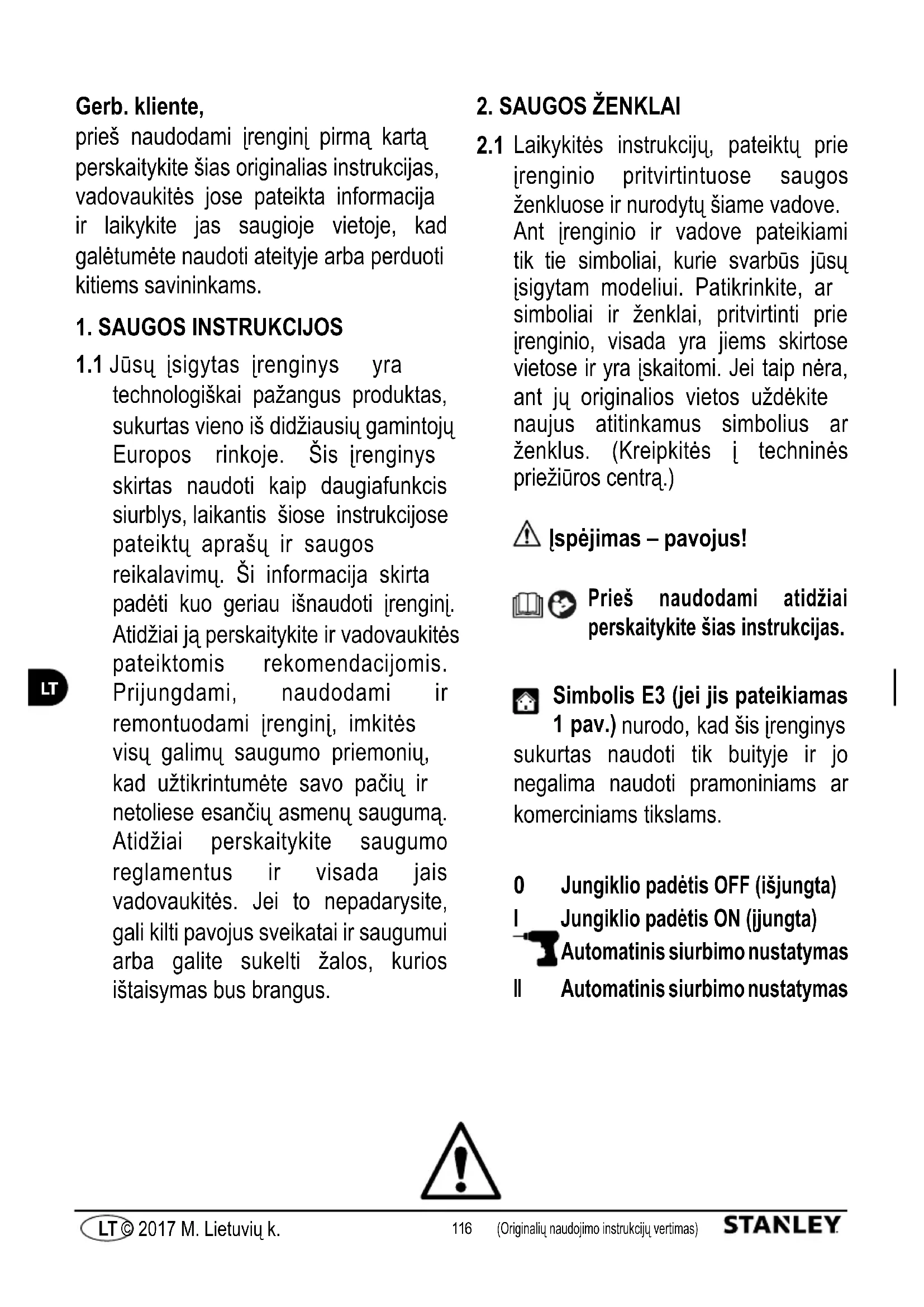 Laikykitės instrukcijų, pateiktų prie įrenginio pritvirtintuose saugos ženkluose ir nurodytų šiame vadove. Ant įrenginio ir vadove pateikiami tik tie simboliai, kurie svarbūs jūsų įsigytam modeliui. Patikrinkite, ar simboliai ir ženklai, pritvirtinti prie įrenginio, visada yra jiems skirtose vietose ir yra įskaitomi. Jei taip nėra, ant jų originalios vietos uždėkite naujus atitinkamus simbolius ar ženklus. (Kreipkitės į techninės priežiūros centrą.) Įspėjimas – pavojus! Prieš naudodami atidžiai perskaitykite šias instrukcijas. Simbolis E3 (jei jis pateikiamas 1 pav.) nurodo, kad šis įrenginys sukurtas naudoti tik buityje ir jo negalima naudoti pramoniniams ar komerciniams tikslams.