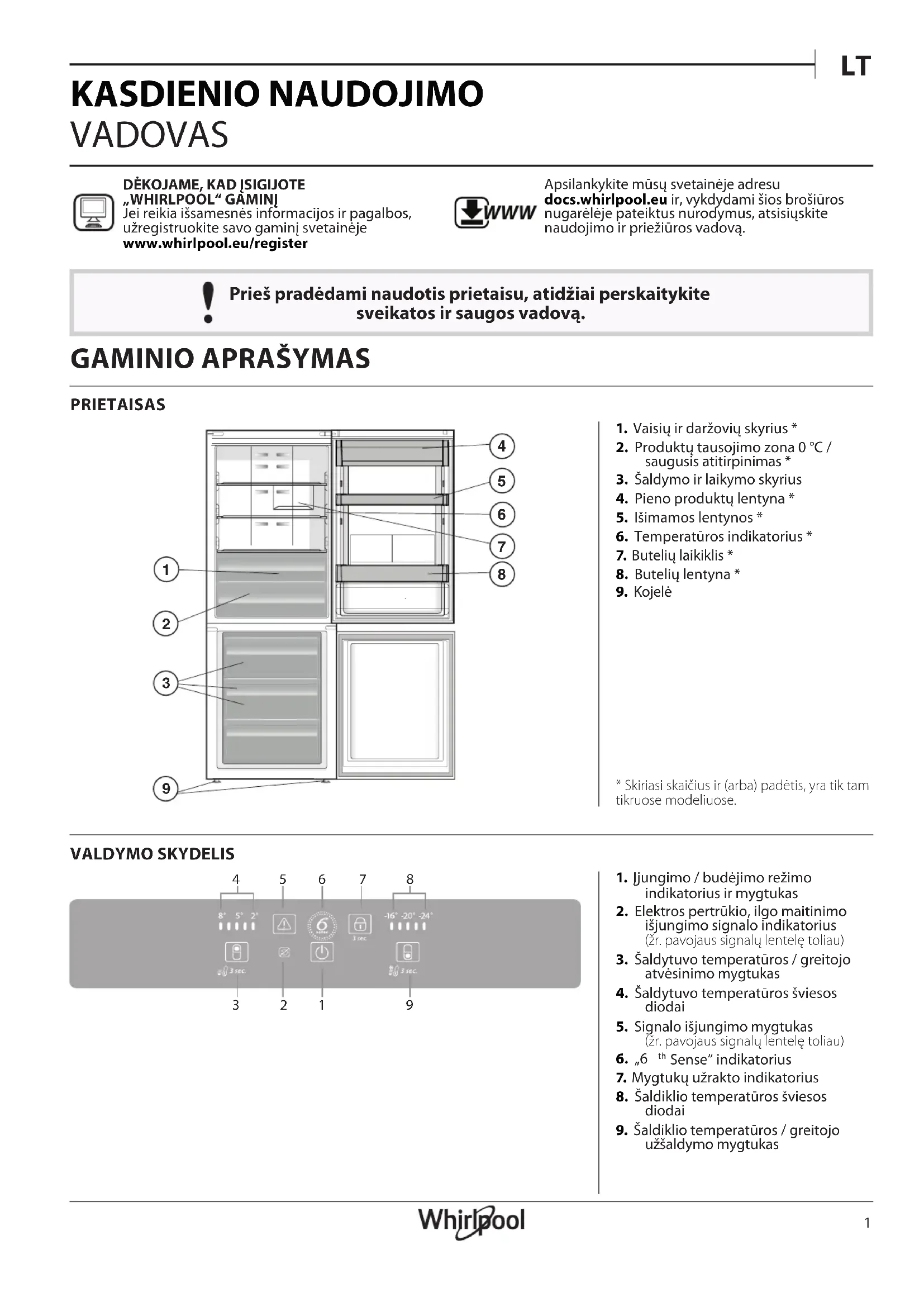 KASDIENIO NAUDOJIMO VADOVAS Prieš pradėdami naudotis prietaisu, atidžiai perskaitykite sveikatos ir saugos vadovą. DĖKOJAME, KAD ĮSIGIJOTE „WHIRLPOOL“ GAMINĮJei reikia išsamesnės informacijos ir pagalbos, užregistruokite savo gaminį svetainėje www . whirlpool . eu / register WWW Apsilankykite mūsų svetainėje adresu docs . whirlpool . eu ir, vykdydami šios brošiūros nugarėlėje pateiktus nurodymus, atsisiųskite naudojimo ir priežiūros vadovą. PRIETAISAS VALDYMO SKYDELIS 1. Vaisių ir daržovių skyrius *2. Produktų tausojimo zona 0 °C / saugusis atitirpinimas *3. Šaldymo ir laikymo skyrius4. Pieno produktų lentyna *5. Išimamos lentynos *6. Temperatūros indikatorius *7. Butelių laikiklis *8. Butelių lentyna *9. Kojelė* Skiriasi skaičius ir (arba) padėtis, yra tik tam tikruose modeliuose.