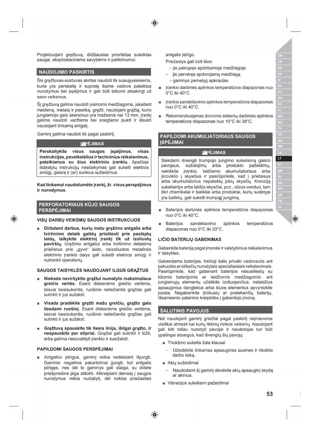 Gabenkite bateriją pagal įmonės ir valstybinius reikalavimus ir taisykles. Gabendama baterijas, trečioji šalis privalo vadovautis ant pakuotės ar etikečių nurodytais specialiaisiais reikalavimais. Pasirūpinkite, kad gabenant baterijos nesusiliestų su kitomis baterijomis ar laidžiomis medžiagomis: ant jungiamųjų elementų uždėkite izoliuojančius, nelaidžius apsauginius dangtelius arba šiuos elementus apvyniokite juosta. Negabenkite įtrūkusių ar pratekančių baterijų. Išsamesnio patarimo kreipkitės į gabentojo įmonę. ŠALUTINIS PAVOJUS Net naudojant gaminį griežtai pagal paskirtį neįmanoma visiškai atmesti kai kurių liktinių rizikos veiksnių. Naudojant gali kilti toliau nurodyti pavojai ir naudotojas turi būti ypatingai atsargus, kad išvengtų šių pavojų: ■ Triukšmo sukelta žala klausai – Užsidėkite tinkamas apsaugines ausines ir ribokite darbo laiką. ■ Akių sužeidimai – Naudodami šį gaminį dėvėkite akių apsauginį skydą ar akinius. ■ Vibracijos sukeliami pažeidimai54 | Lietuviškai – Ribokite buvimą darbo aplinkoje. Vadovaukitės instrukcijomis, pateiktomis rizikos mažinimo dalyje. ■ Elektros smūgis palietus paslėptus laidus – Laikykite gaminį tik už izoliuotų paviršių. ■ Dulkių sukeliama žala – Dulkės, susidarančios naudojant gaminį, gali pakenkti kvėpavimo takams. Užsidėkite tinkamą apsaugos nuo dulkių kaukę su filtrais, saugančiais nuo dalelių, skleidžiamų medžiagos, su kuria dirbate.
