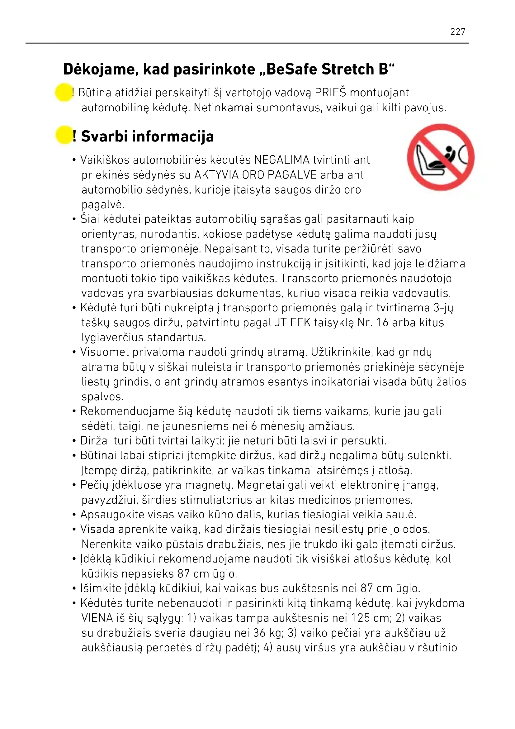 - Vaikiškos automobilinės kėdutės NEGALIMA tvirtinti ant priekinės sėdynės su AKTYVIA ORO PAGALVE arba ant automobilio sėdynės, kurioje įtaisyta saugos diržo oro pagalvė.