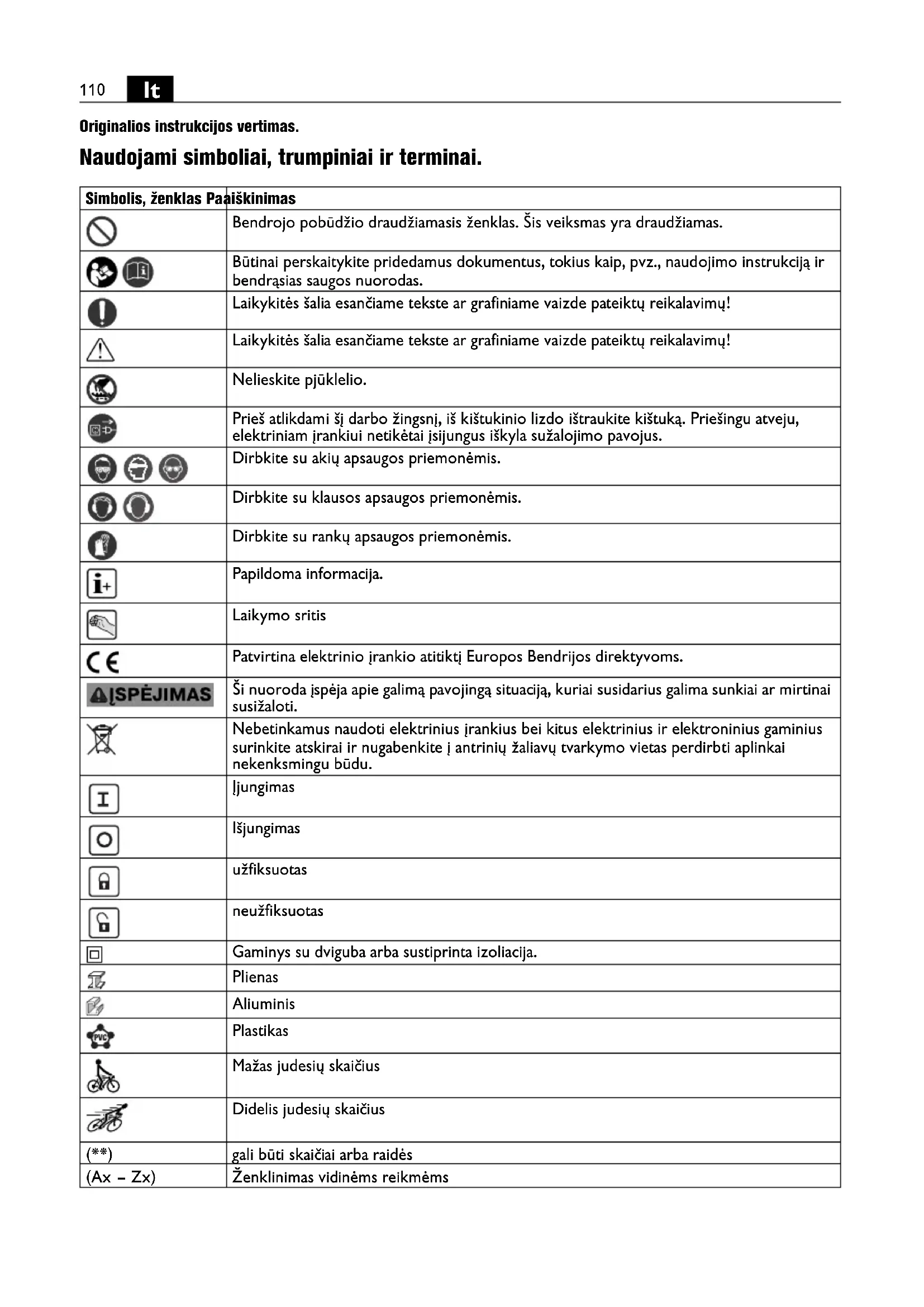 Originalios instrukcijos vertimas. Naudojami simboliai, trumpiniai ir terminai. Simbolis, ženklas Paaiškinimas Bendrojo pobūdžio draudžiamasis ženklas. Šis veiksmas yra draudžiamas. Būtinai perskaitykite pridedamus dokumentus, tokius kaip, pvz., naudojimo instrukciją ir bendrąsias saugos nuorodas. Laikykitės šalia esančiame tekste ar grafiniame vaizde pateiktų reikalavimų! Laikykitės šalia esančiame tekste ar grafiniame vaizde pateiktų reikalavimų! Nelieskite pjūklelio. Prieš atlikdami šį darbo žingsnį, iš kištukinio lizdo ištraukite kištuką. Priešingu atveju, elektriniam įrankiui netikėtai įsijungus iškyla sužalojimo pavojus. Dirbkite su akių apsaugos priemonėmis. Dirbkite su klausos apsaugos priemonėmis. Dirbkite su rankų apsaugos priemonėmis. Papildoma informacija. Laikymo sritis Patvirtina elektrinio įrankio atitiktį Europos Bendrijos direktyvoms. Ši nuoroda įspėja apie galimą pavojingą situaciją, kuriai susidarius galima sunkiai ar mirtinai susižaloti. Nebetinkamus naudoti elektrinius įrankius bei kitus elektrinius ir elektroninius gaminius surinkite atskirai ir nugabenkite į antrinių žaliavų tvarkymo vietas perdirbti aplinkai nekenksmingu būdu. Įjungimas Išjungimas užfiksuotas neužfiksuotas Gaminys su dviguba arba sustiprinta izoliacija. Plienas Aliuminis Plastikas Mažas judesių skaičius Didelis judesių skaičius (**) gali būti skaičiai arba raidės (Ax – Zx) Ženklinimas vidinėms reikmėms OBJ_BUCH-0000000078-004.book Page 110 Wednesday, February 26, 2020 1:28 PM111