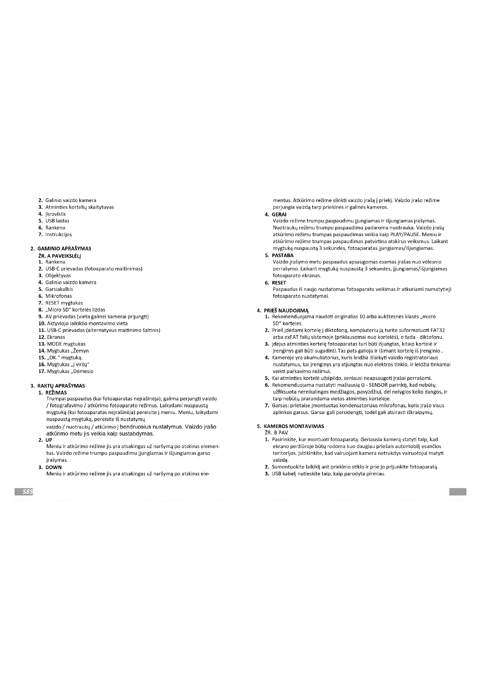 Prieš montuodami laikiklį ant sklo gerai nuriebalinkite paviršius. Nepa- mirškite veng aukštos temperatūros, kuri gali deformuo laikiklį ir sugadin pa diktofoną. PASTABOS: - G-SENSOR - funkcija, kuria įrašai, kuriuose užksuotos perkrovos (pvz., nelygi danga, stabdymas, nuvažiavimas nuo šaligatvio bortelio ar greičio kalnelio ir t. t.), apsaugomi nuo perrašymo. Jei naudotojas naudoja šią funkciją, turėtumėte periodiškai formatuo atmines kortelę kompiuteryje, o paskui fotoaparate. Nes galiausiai kiekvienas duomenų laikmenoje esans failas bus apsaugotas nuo perrašymo ir prietaisas negalės įrašy tolimesnis maršrutas - jis nebus įrašomas į kilpą. Siūlome juklį nustaty pagal savo vairavimo slių ir kelio sąlygas. Šią parink taip pat galite visiškai išjung - tokiu atveju kiekvienas seniausias failas bus perrašomas ir kortelė nebus reikia periodiškai formatuo. - PARKAvimo režimas / MONITORIUS - funkcija, skirta veik, kai automobilis stovi, naudoja akumuliatoriaus energiją*, jei vaizdo registratorius yra visiškai įkrautas (*jei jame yra įmontuotas akumuliatorius). Šiuo atveju kamera po Apkęs smūgį, jis pradeda įrašinė kelių sekundžių trukmės vaizdo įrašą, kol išsikrauna akumuliatorius. Naudodamiesi šia funkcija, nepamirškite, kad suaktyvinus (paleidus) šią funkciją prietaiso akumuliatorius turi bū įkrautas. Ją reikėtų išjung funkcijas, prieš leisdamiesi į kelionę, nes dėl to fotoaparatas gali įsijung ir išsijung ir atsiknai sudary maršruto vaizdo fragmentus. *Dėl pastovaus mainimo šalnio automobilyje ši funkcija gali elgs kitaip, pvz., palikus įjungtą fotoaparatą, gali išsikrau automobilio akumuliatorius. - Judesio apkimo funkcija - funkcija, skirta veik stovint transporto priemonei - reikalauja nuolanio mainimo, todėl kamera turi bū įjungta. Apkus judesį, vaizdo registratorius pradės įrašinė automaškai ir sustabdys įrašymą praėjus kelioms sekundėms po to, kai bus apktas judesys. jokio judesio priešais fotoaparato objektyvą. Atkreipkite dėmesį, kad dėl šios funkcijos gali išsikrau automobilio akumuliatorius. Prieš pradėdami važiuo, turite išjung šią funkciją, nes dėl jos fotoaparatas gali įsi- jung ir išsijung ir atsiknai sudary maršruto lmuotos medžiagos fragmentus. DĖMESIO! Naudokite k originalų įkroviklį, kurio įkrovimo srovė yra 5 V/1,5 A. (Neįjunkite esiogiai į 220/230 V lizdą). Nesilaikydami instrukcijų galite sugadin fotoaparatą arba sukel pavojingų situacijų. Dėl nuolanio gaminio tobulinimo gamintojas pasilieka teisę keis prietaisą ir jo rinkinį be išanksnio įspėjimo. Kai kurios šiame vadove aprašytos funkcijos gali šiek ek skirs nuo krovės.