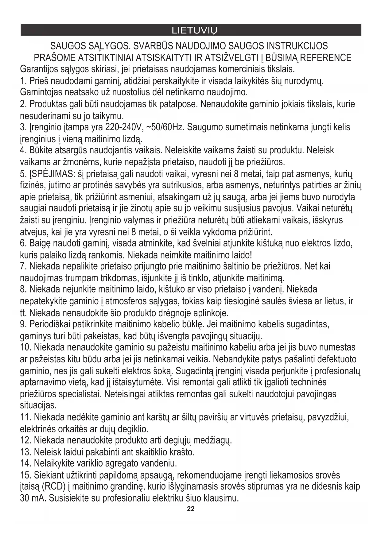 fizinės, jutimo ar protinės savybės yra sutrikusios, arba asmenys, neturintys patirties ar žinių apie prietaisą, tik prižiūrint asmeniui, atsakingam už jų saugą, arba jei jiems buvo nurodyta saugiai naudoti prietaisą ir jie žinotų apie su jo veikimu susijusius pavojus. Vaikai neturėtų žaisti su įrenginiu. Įrenginio valymas ir priežiūra neturėtų būti atliekami vaikais, išskyrus atvejus, kai jie yra vyresni nei 8 metai, o ši veikla vykdoma prižiūrint.