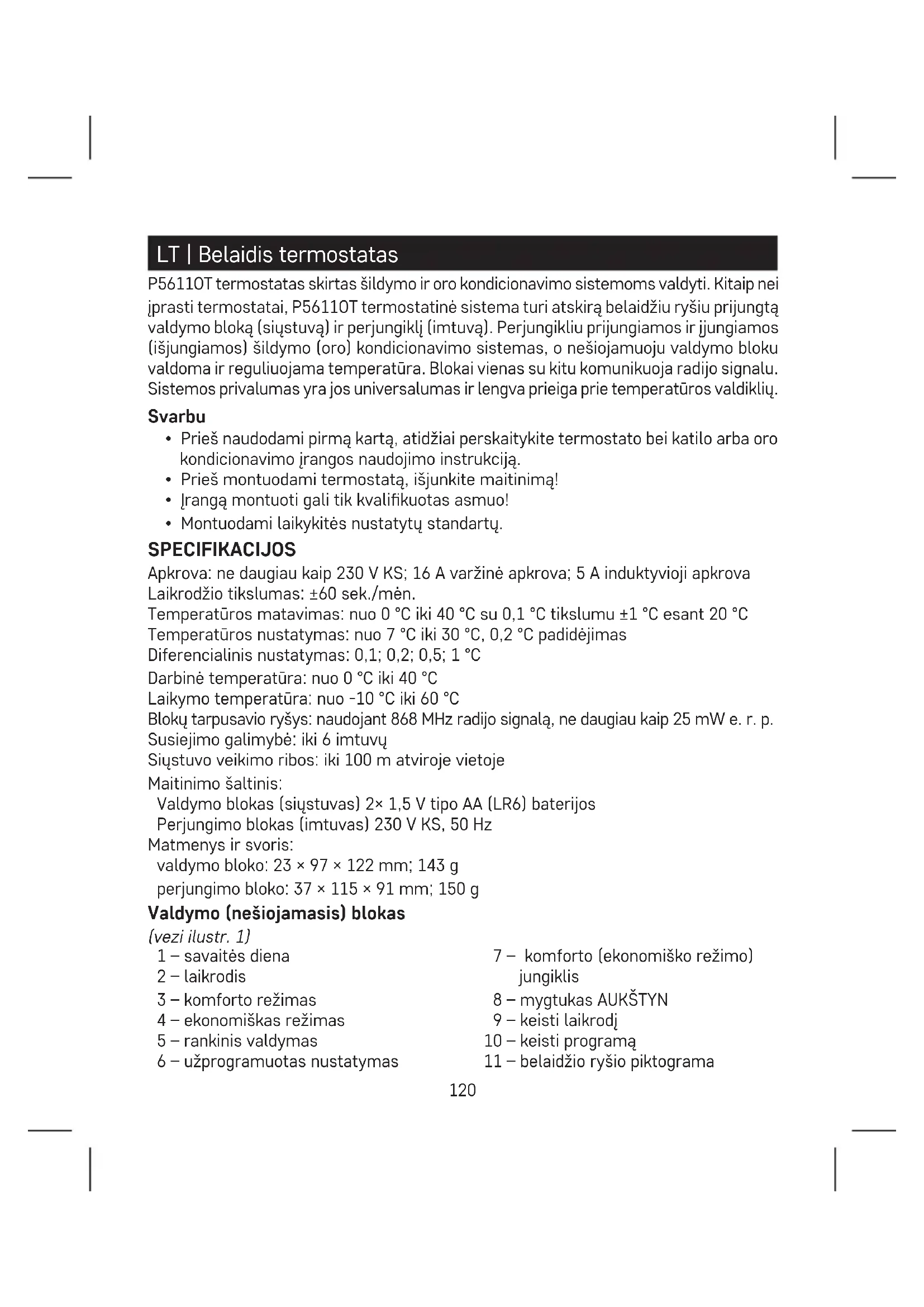 - Montuodami laikykitės nustatytų standartų. SPECIFIKACIJOS Apkrova: ne daugiau kaip 230 V KS; 16 A varžinė apkrova; 5 A induktyvioji apkrova Laikrodžio tikslumas: ±60 sek./mėn. Temperatūros matavimas: nuo 0 °C iki 40 °C su 0,1 °C tikslumu ±1 °C esant 20 °C Temperatūros nustatymas: nuo 7 °C iki 30 °C, 0,2 °C padidėjimas Diferencialinis nustatymas: 0,1; 0,2; 0,5; 1 °C Darbinė temperatūra: nuo 0 °C iki 40 °C Laikymo temperatūra: nuo -10 °C iki 60 °C Blokų tarpusavio ryšys: naudojant 868 MHz radijo signalą, ne daugiau kaip 25 mW e. r. p. Susiejimo galimybė: iki 6 imtuvų Siųstuvo veikimo ribos: iki 100 m atviroje vietoje Maitinimo šaltinis: Valdymo blokas (siųstuvas) 2× 1,5 V tipo AA (LR6) baterijos Perjungimo blokas (imtuvas) 230 V KS, 50 Hz Matmenys ir svoris: valdymo bloko: 23 × 97 × 122 mm; 143 g perjungimo bloko: 37 × 115 × 91 mm; 150 g Valdymo (nešiojamasis) blokas (vezi ilustr. 1) 1 – savaitės diena 2 – laikrodis 3 – komforto režimas 4 – ekonomiškas režimas 5 – rankinis valdymas 6 – užprogramuotas nustatymas 7 – komforto (ekonomiško režimo) jungiklis 8 – mygtukas AUKŠTYN 9 – keisti laikrodį 10 – keisti programą 11 – belaidžio ryšio piktograma121 12 – temperatūros nustatymas 13 – šalčio indikacija 14 – veikimo būsenos simbolis 15 – baterijos būsenos indikacija 16 – dabartinė patalpos temperatūra 17 – dienos prolis 18 – mygtukas ŽEMYN 19 – keisti temperatūrą 20 – apšviesti ekraną 21 – ATKŪRIMAS Valdymo bloko galinio dangtelio nuėmimas (vezi ilustr. 2)