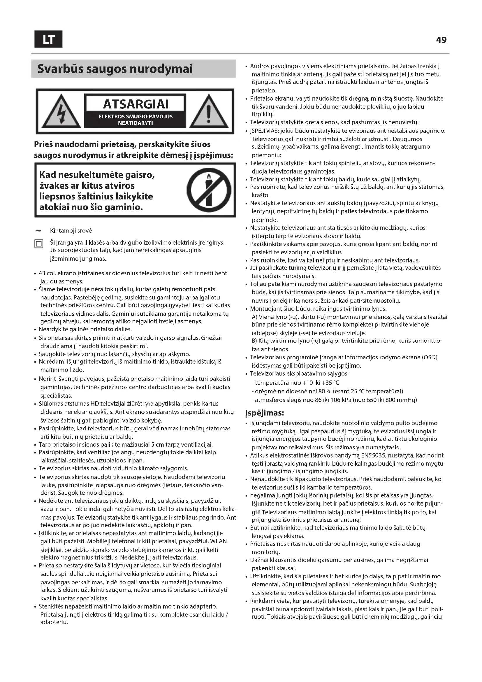 - Neišmeskite šio televizoriaus su nerūšiuotomis buitinėmis atliekomis. Nugabenkite jį į specialų elektrinės ir elektroninės įrangos surinkimo tašką perdirbimui. Taip prisidėsite prie žaliavų išteklių tausojimo ir aplinkos saugojimo. Daugiau informacijos gali suteikti pardavėjas arba vietos valdžios įstaigos. CE pareiškimas: