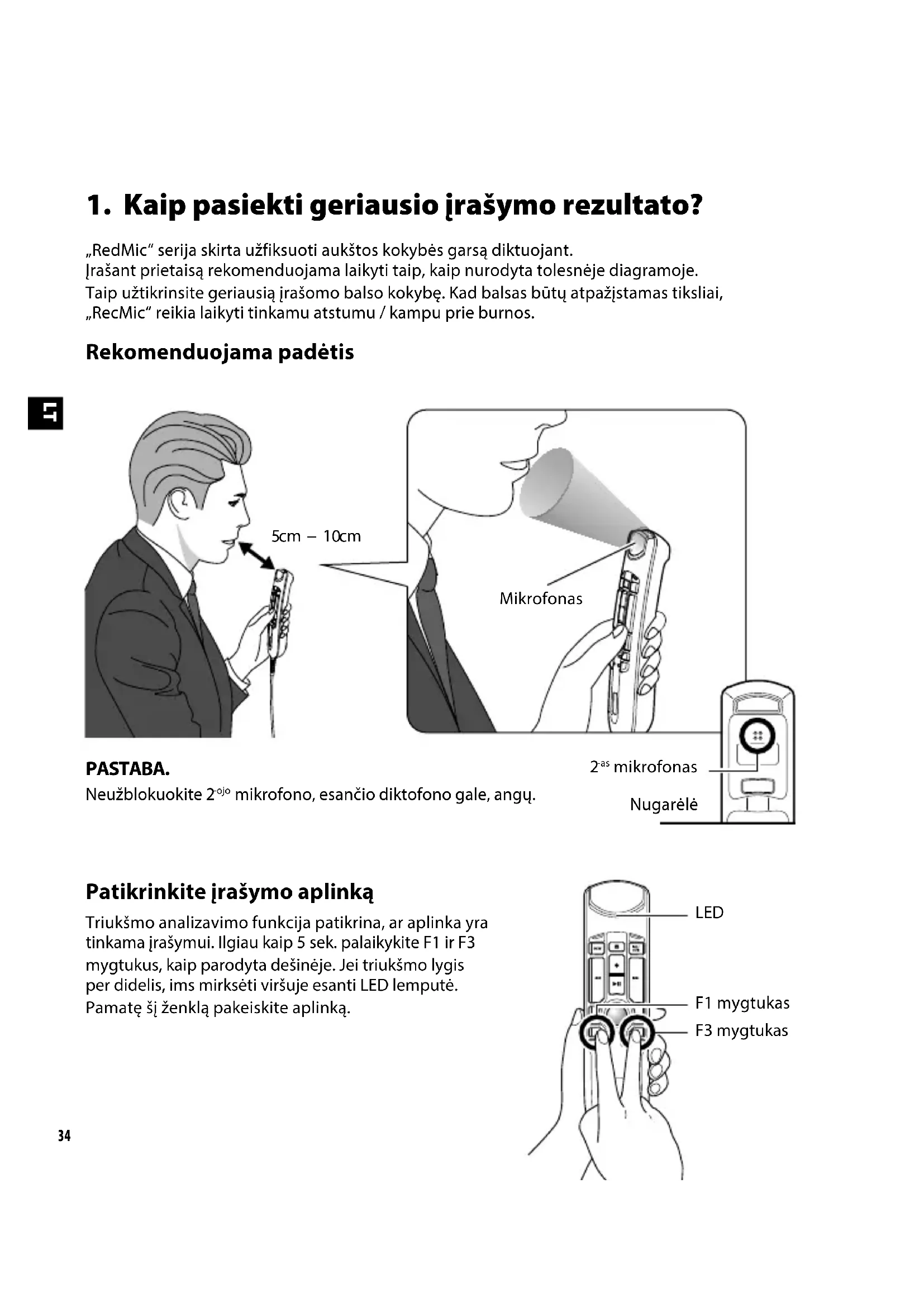 „RedMic“ serija skirta užfiksuoti aukštos kokybės garsą diktuojant. Įrašant prietaisą rekomenduojama laikyti taip, kaip nurodyta tolesnėje diagramoje. Taipužtikrinsite geriausią įrašomo balso kokybę. Kad balsas būtų atpažįstamas tiksliai, „RecMic“reikia laikyti tinkamu atstumu / kampu prie burnos. Rekomenduojama padėtis PASTABA. Neužblokuokite 2 -ojo mikrofono, esančio diktofono gale, angų.