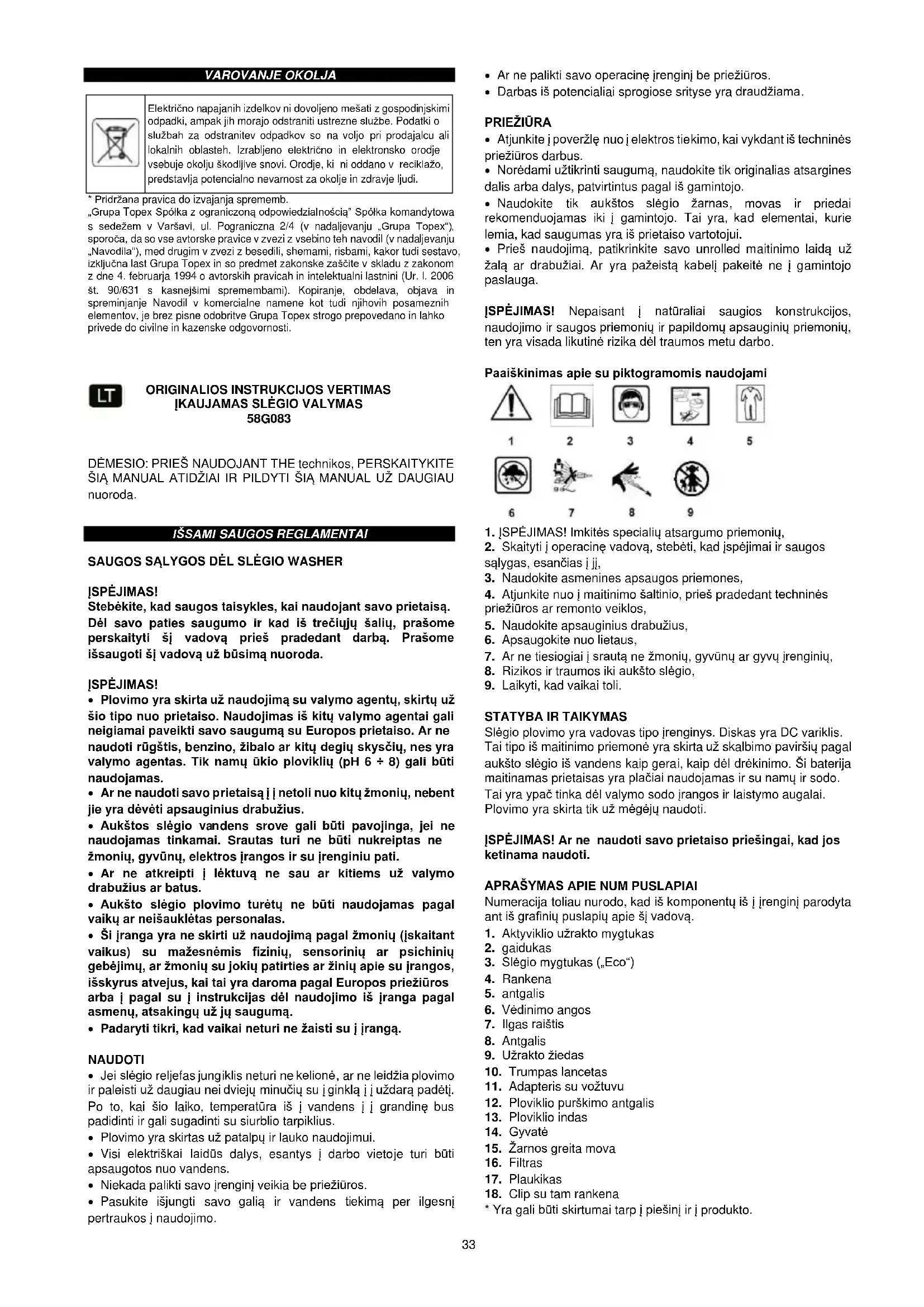 SAUGOS SĄLYGOS DĖL SLĖGIO WASHER ĮSPĖJIMAS! Stebėkite, kad saugos taisykles, kai naudojant savo prietaisą. Dėl savo paties saugumo ir kad iš trečiųjų šalių, prašome perskaityti šį vadovą prieš pradedant darbą. Prašome išsaugoti šį vadovą už būsimą nuoroda. ĮSPĖJIMAS!