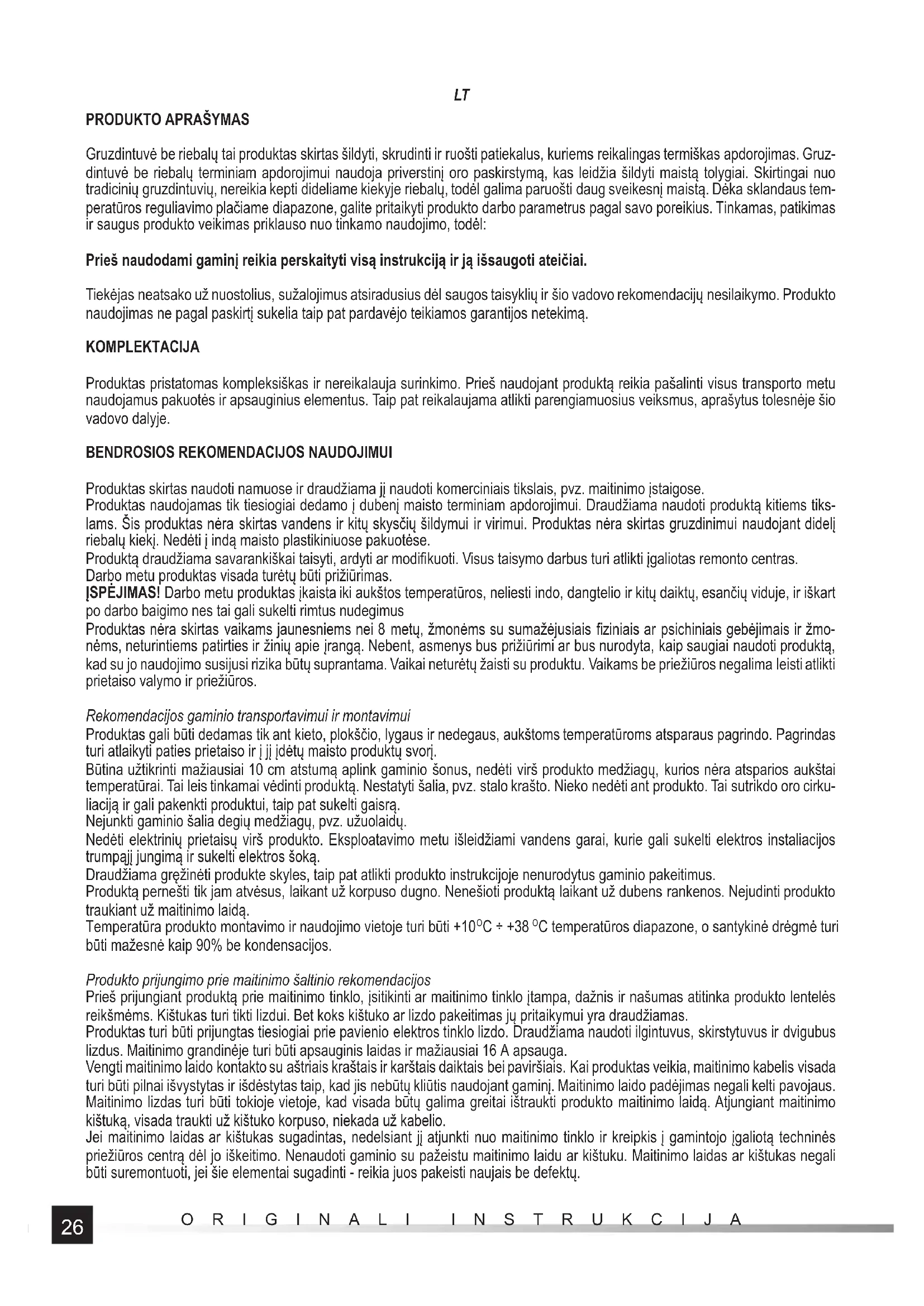 C temperatūros diapazone, o santykinė drėgmė turi būti mažesnė kaip 90% be kondensacijos. Produkto prijungimo prie maitinimo šaltinio rekomendacijos Prieš prijungiant produktą prie maitinimo tinklo, įsitikinti ar maitinimo tinklo įtampa, dažnis ir našumas atitinka produkto lentelės reikšmėms. Kištukas turi tikti lizdui. Bet koks kištuko ar lizdo pakeitimas jų pritaikymui yra draudžiamas. Produktas turi būti prijungtas tiesiogiai prie pavienio elektros tinklo lizdo. Draudžiama naudoti ilgintuvus, skirstytuvus ir dvigubus lizdus. Maitinimo grandinėje turi būti apsauginis laidas ir mažiausiai 16 A apsauga. Vengti maitinimo laido kontakto su aštriais kraštais ir karštais daiktais bei paviršiais. Kai produktas veikia, maitinimo kabelis visada turi būti pilnai išvystytas ir išdėstytas taip, kad jis nebūtų kliūtis naudojant gaminį. Maitinimo laido padėjimas negali kelti pavojaus. Maitinimo lizdas turi būti tokioje vietoje, kad visada būtų galima greitai ištraukti produkto maitinimo laidą. Atjungiant maitinimo kištuką, visada traukti už kištuko korpuso, niekada už kabelio. Jei maitinimo laidas ar kištukas sugadintas, nedelsiant jį atjunkti nuo maitinimo tinklo ir kreipkis į gamintojo įgaliotą techninės priežiūros centrą dėl jo iškeitimo. Nenaudoti gaminio su pažeistu maitinimo laidu ar kištuku. Maitinimo laidas ar kištukas negali būti suremontuoti, jei šie elementai sugadinti - reikia juos pakeisti naujais be defektų.27 ORIGINALI INSTRUKCIJA