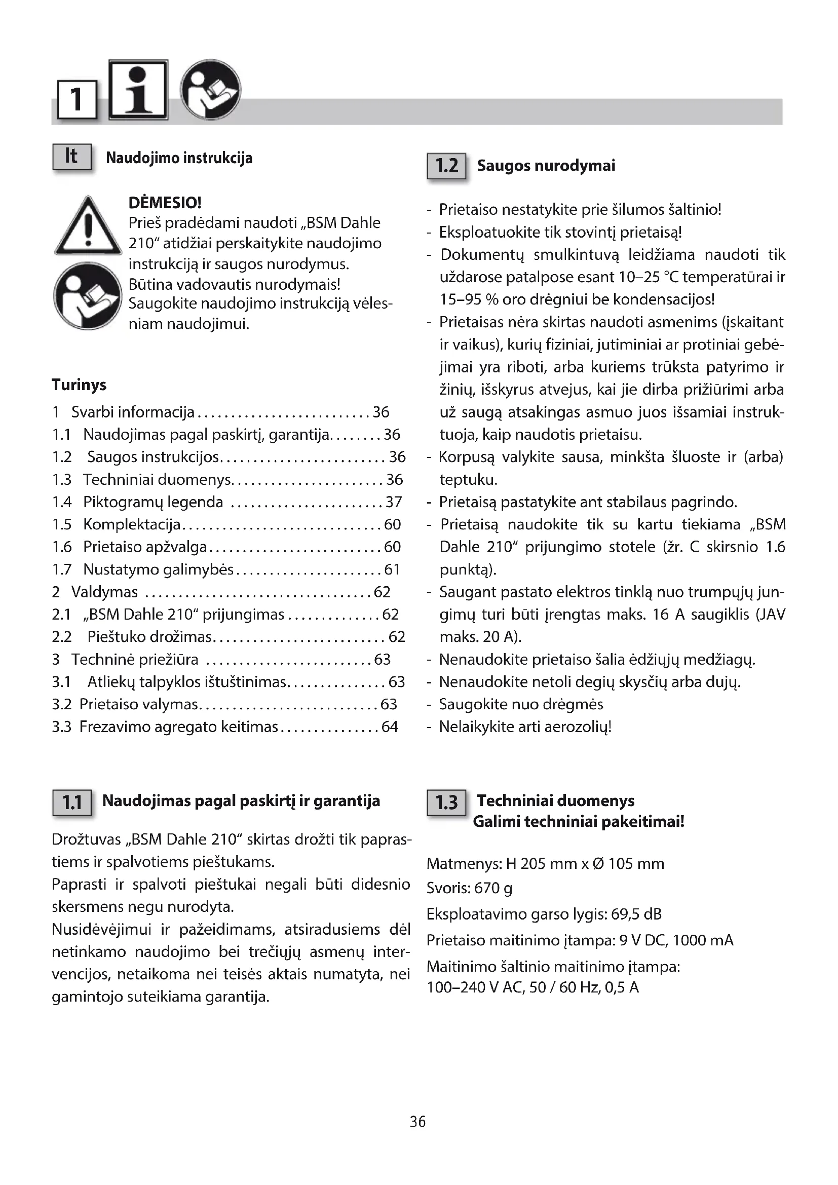 Naudojimo instrukcija DĖMESIO! Prieš pradėdami naudoti „BSM Dahle 210“ atidžiai perskaitykite naudojimo instrukciją ir saugos nurodymus. Būtina vadovautis nurodymais! Saugokite naudojimo instrukciją vėles- niam naudojimui. Turinys 1 Svarbi informacija ..........................36