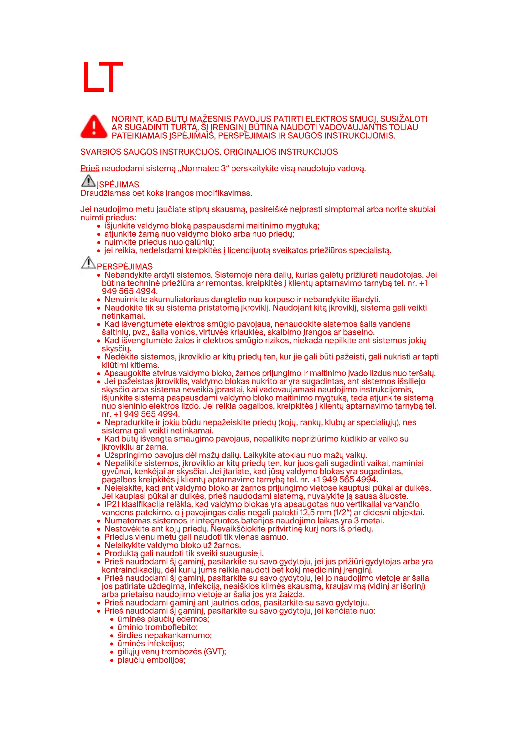 Prieš naudodami sistemą „Normatec 3“ perskaitykite visą naudotojo vadovą. ĮSPĖJIMAS Draudžiamas bet koks įrangos modifikavimas. Jei naudojimo metu jaučiate stiprų skausmą, pasireiškė neįprasti simptomai arba norite skubiai nuimti priedus: