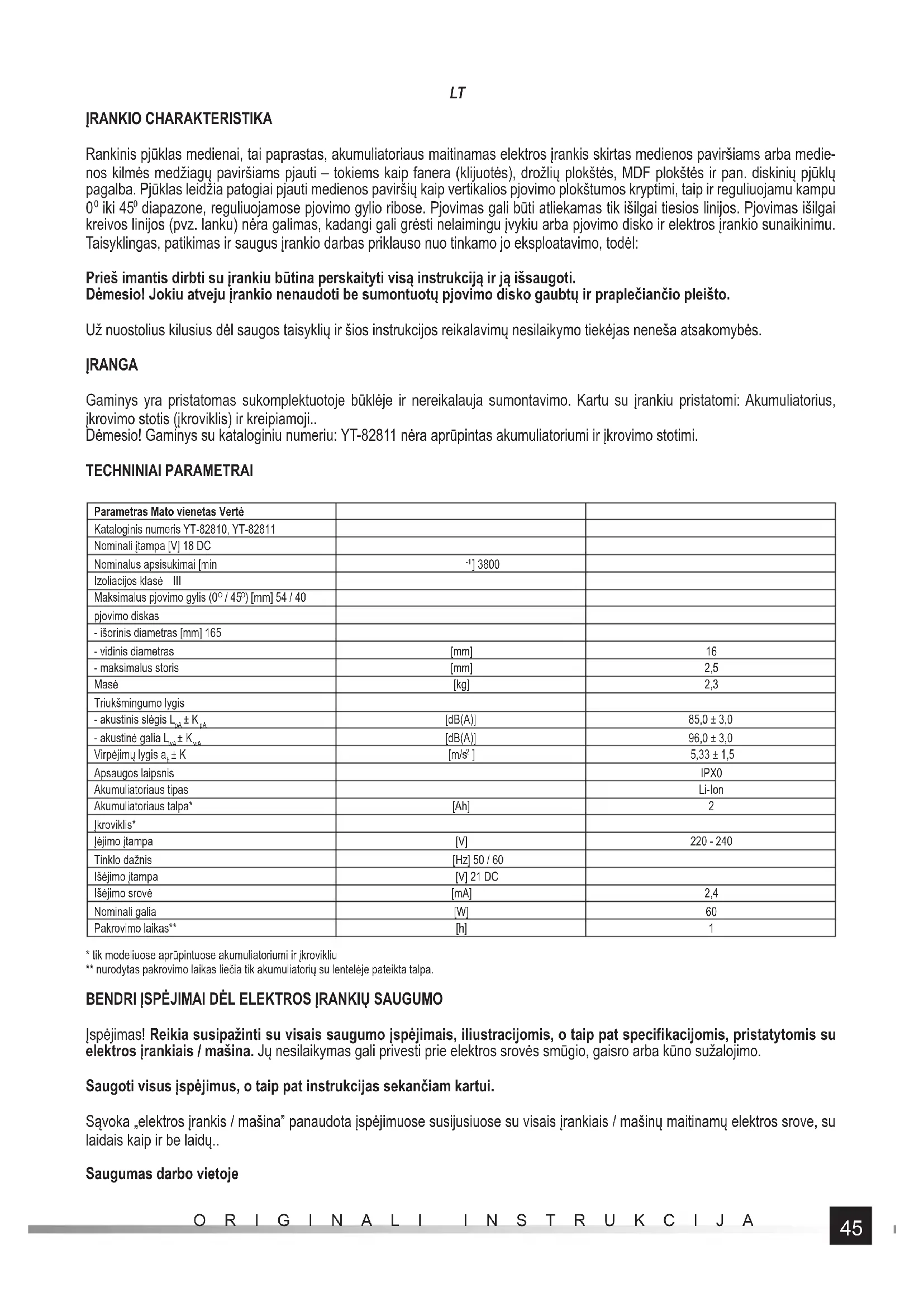 diapazone, reguliuojamose pjovimo gylio ribose. Pjovimas gali būti atliekamas tik išilgai tiesios linijos. Pjovimas išilgai kreivos linijos (pvz. lanku) nėra galimas, kadangi gali grėsti nelaimingu įvykiu arba pjovimo disko ir elektros įrankio sunaikinimu. Taisyklingas, patikimas ir saugus įrankio darbas priklauso nuo tinkamo jo eksploatavimo, todėl: Prieš imantis dirbti su įrankiu būtina perskaityti visą instrukciją ir ją išsaugoti. Dėmesio! Jokiu atveju įrankio nenaudoti be sumontuotų pjovimo disko gaubtų ir praplečiančio pleišto. Už nuostolius kilusius dėl saugos taisyklių ir šios instrukcijos reikalavimų nesilaikymo tiekėjas neneša atsakomybės. ĮRANGA Gaminys yra pristatomas sukomplektuotoje būklėje ir nereikalauja sumontavimo. Kartu su įrankiu pristatomi: Akumuliatorius, įkrovimo stotis (įkroviklis) ir kreipiamoji.. Dėmesio! Gaminys su kataloginiu numeriu: YT-82811 nėra aprūpintas akumuliatoriumi ir įkrovimo stotimi. TECHNINIAI PARAMETRAI Parametras Mato vienetas Vertė Kataloginis numeris YT-82810, YT-82811 Nominali įtampa [V] 18 DC Nominalus apsisukimai [min