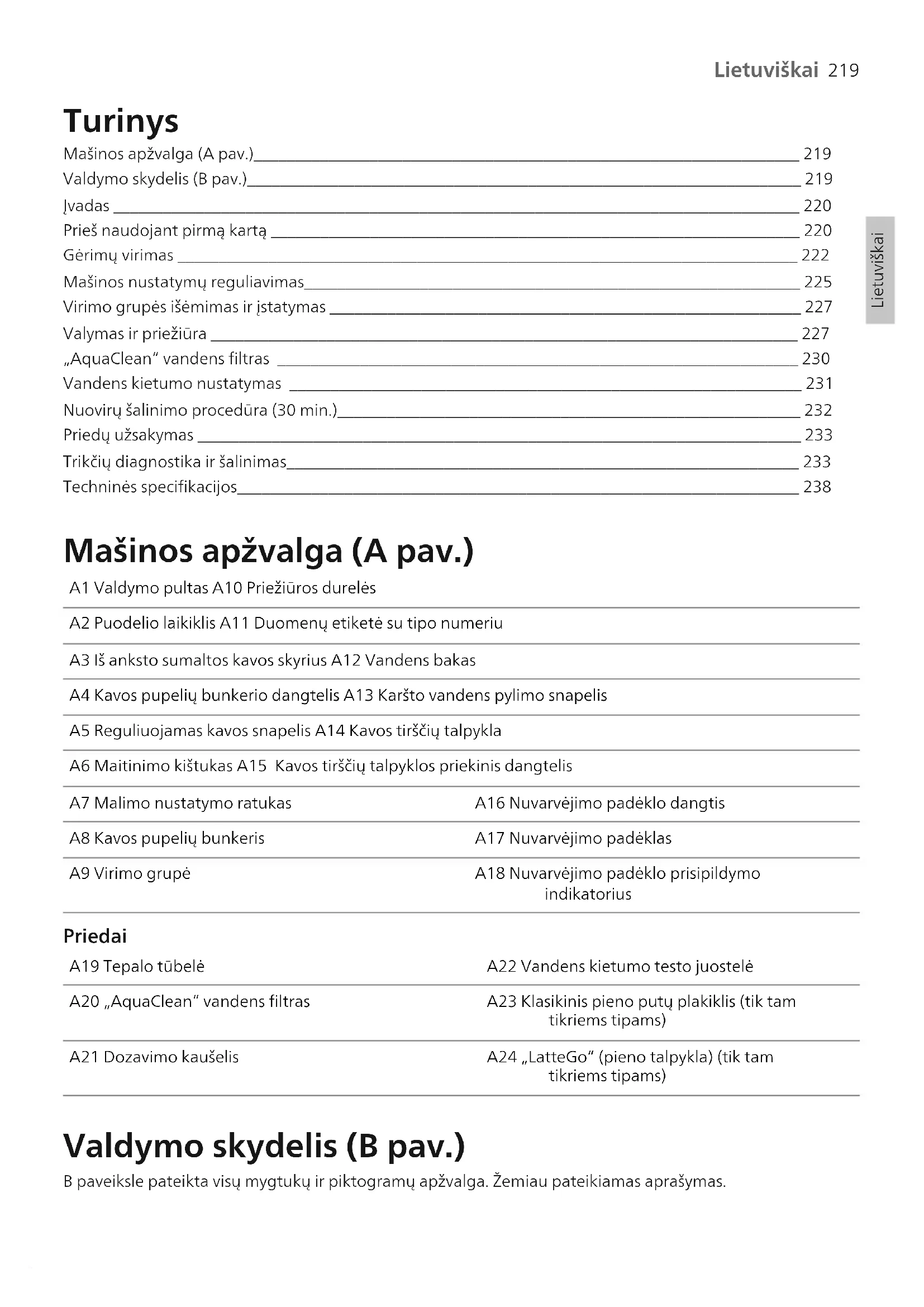 Lietuviškai Lietuviškai Turinys Mašinos apžvalga (A pav.)__________________________________________________________________ 219 Valdymo skydelis (B pav.)___________________________________________________________________ 219 Įvadas ___________________________________________________________________________________ 220 Prieš naudojant pirmą kartą ________________________________________________________________ 220 Gėrimų virimas ___________________________________________________________________________ 222 Mašinos nustatymų reguliavimas____________________________________________________________ 225 Virimo grupės išėmimas ir įstatymas _________________________________________________________ 227 Valymas ir priežiūra _______________________________________________________________________ 227 „AquaClean“ vandens filtras _______________________________________________________________ 230 Vandens kietumo nustatymas ______________________________________________________________ 231 Nuovirų šalinimo procedūra (30 min.)________________________________________________________ 232 Priedų užsakymas _________________________________________________________________________ 233 Trikčių diagnostika ir šalinimas______________________________________________________________ 233 Techninės specifikacijos____________________________________________________________________ 238 Mašinos apžvalga (A pav.) A1 Valdymo pultas A10 Priežiūros durelės A2 Puodelio laikiklis A11 Duomenų etiketė su tipo numeriu A3 Iš anksto sumaltos kavos skyrius A12 Vandens bakas A4 Kavos pupelių bunkerio dangtelis A13 Karšto vandens pylimo snapelis A5 Reguliuojamas kavos snapelis A14 Kavos tirščių talpykla A6 Maitinimo kištukas A15 Kavos tirščių talpyklos priekinis dangtelis A7 Malimo nustatymo ratukas A16 Nuvarvėjimo padėklo dangtis A8 Kavos pupelių bunkeris A17 Nuvarvėjimo padėklas A9 Virimo grupė A18 Nuvarvėjimo padėklo prisipildymo indikatorius Priedai A19 Tepalo tūbelė A22 Vandens kietumo testo juostelė A20 „AquaClean“ vandens filtras A23 Klasikinis pieno putų plakiklis (tik tam tikriems tipams) A21 Dozavimo kaušelis A24 „LatteGo“ (pieno talpykla) (tik tam tikriems tipams) Valdymo skydelis (B pav.) B paveiksle pateikta visų mygtukų ir piktogramų apžvalga. Žemiau pateikiamas aprašymas.220 Lietuviškai Kai kurios funkcijos / piktogramos yra tik tam tikriems tipams. B1 Įjungimo ir išjungimo mygtukas B7 Įspėjimo piktogramos B2 Gėrimų piktogramos* B8 Paleidimo lemputė B3 Aromato stiprumo / iš anksto sumaltos kavos piktograma. B9 Paleidimas / stabdymas mygtukas B4 Gėrimo kiekio piktograma B10 Piktograma „Calc/ Clean“ B5 Pieno kiekio piktograma (tik tam tikriems tipams) B11 „AquaClean“ piktograma B6 Kavos temperatūros piktograma (tik tam tikriems tipams)