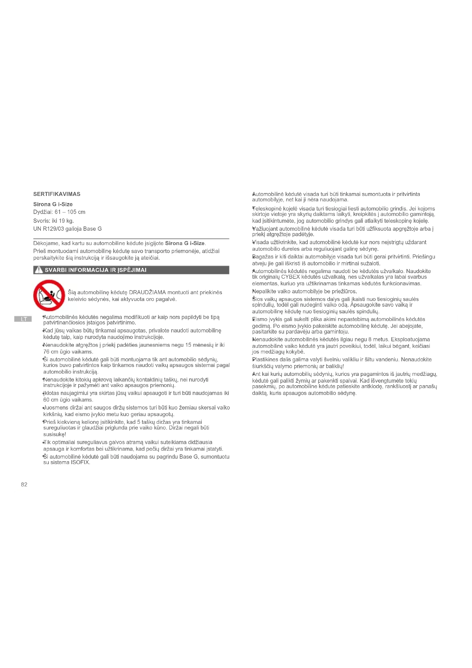 Tai yra sustiprinta vaikų apsaugos sistema I-SIZE. Ji yra patvirtinta pagal JT reglamentą Nr. R129/03, kuris taikomas pagrindui Base G, ir reglamentą Nr. R129/03, ir yra tinkama naudoti su I-SIZE suderinamuose automobiliuose ant gamintojo automobilio instrukcijoje nurodytų sėdynių padėčių. Jei jūsų automobilyje nėra I-SIZE sėdynės padėties, peržiūrėkite automobilių tipų sąrašą. Naujausią automobilių tipų sąrašą galite rasti interneto svetainėje go.cybex-online.com/sirona-g-isize-car-compatibility. Negarantuojama, kad visuose patvirtintuose automobiliuose bus galima naudoti visas sėdėjimo ir gulėjimo padėtis.