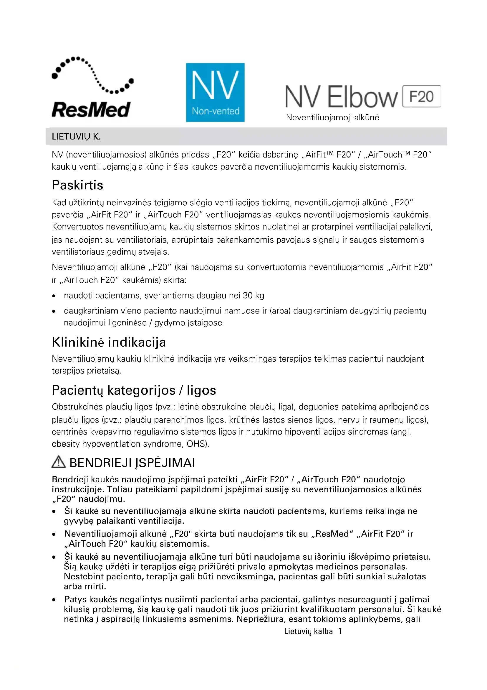 Neventiliuojamoji alkūnė LIETUVIŲ K. NV (neventiliuojamosios) alkūnės priedas „F20“ keičia dabartinę „AirFit™ F20“ / „AirTouch™ F20“ kaukių ventiliuojamąją alkūnę ir šias kaukes paverčia neventiliuojamomis kaukių sistemomis. Paskirtis Kad užtikrintų neinvazinės teigiamo slėgio ventiliacijos tiekimą, neventiliuojamoji alkūnė „F20“ paverčia „AirFit F20“ ir „AirTouch F20“ ventiliuojamąsias kaukes neventiliuojamosiomis kaukėmis. Konvertuotos neventiliuojamų kaukių sistemos skirtos nuolatinei ar protarpinei ventiliacijai palaikyti, jas naudojant su ventiliatoriais, aprūpintais pakankamomis pavojaus signalų ir saugos sistemomis ventiliatoriaus gedimų atvejais. Neventiliuojamoji alkūnė „F20“ (kai naudojama su konvertuotomis neventiliuojamomis „AirFit F20“ ir „AirTouch F20“ kaukėmis) skirta:
