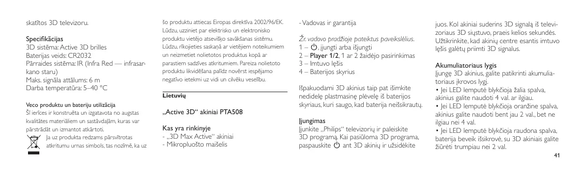 • Les parents doivent surveiller leurs enfants pendant le visionnage en 3D et s’assurer qu’ils ne présentent aucun des symptômes mentionnés ci-dessus. La 3D n’est pas recommandée pour les enfants de moins de 6 ans, leur système visuel n’étant pas complètement développé. • N’utilisez pas les lunettes 3D autrement que pour regarder la télévision en 3D. Spécifications Système 3D : lunettes Active 3D Type de batterie : CR2032 Système de transmission : IR (infrarouge) Distance maximale du signal : 6 m Le symbole de la poubelle barrée sur un produit indique que ce dernier est conforme à la directive européenne 2002/96/CE. Veuillez vous renseigner sur votre système local de gestion des déchets d’équipements électriques et électroniques. Veillez à respecter la réglementation en vigueur et ne mettez pas vos anciens produits au rebut avec vos déchets ménagers. La mise au rebut citoyenne