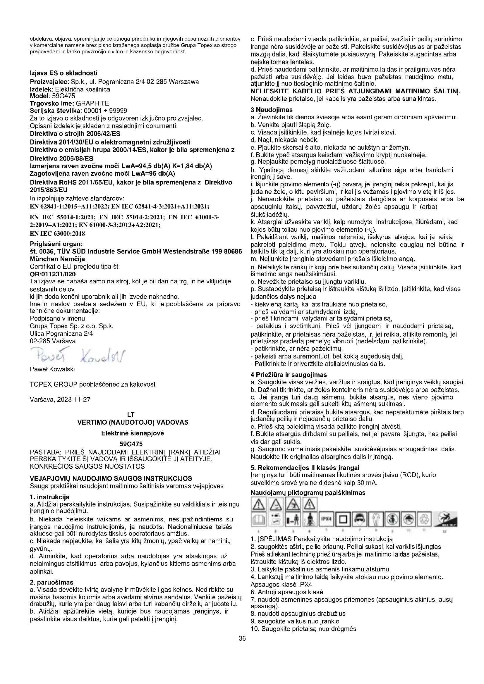 EB atitikties deklaracija Gamintojas: Sp.k., ul. Pograniczna 2/4 02-285 Warszawa Produktas: Elektrinė vejapjovė Modelis: 59G475 Prekybos pavadinimas: GRAPHITE Serijos numeris: 00001 ÷ 99999 Už šią atitikties deklaraciją atsako tik gamintojas. Pirmiau aprašytas gaminys atitinka šiuos dokumentus: Mašinų direktyva 2006/42/EB Elektromagnetinio suderinamumo direktyva 2014/30/ES Triukšmo skleidimo direktyva 2000/14/EB su pakeitimais, padarytais 2005/88/EB Išmatuotas garso galios lygis LwA=94,5 db(A) K=1,84 db(A) Garantuotas garso galios lygis LwA=96 db(A) RoHS direktyva 2011/65/ES su pakeitimais, padarytais Direktyva 2015/863/ES Ir atitinka standartų reikalavimus: EN 62841-1:2015+A11:2022; EN IEC 62841-4-3:2021+A11:2021; EN IEC 55014-1:2021; EN IEC 55014-2:2021; EN IEC 61000-3- 2:2019+A1:2021; EN 61000-3-3:2013+A2:2021; EN IEC 63000:2018 Notifikuotoji įstaiga: Nr. 0036, TÜV SÜD Industrie Service GmbH Westendstraße 199 80686 München Vokietija ES tipo tyrimo sertifikatas Nr: OR/011231/020 Ši deklaracija taikoma tik tokioms mašinoms, kokios jos pateikiamos į rinką, ir neapima sudedamųjų dalių. prideda galutinis naudotojas arba atlieka vėliau. ES reziduojančio asmens, įgalioto rengti techninę dokumentaciją, vardas, pavardė ir adresas: Pasirašyta: Grupa Topex Sp. z o.o. Sp.k. Pograniczna gatvė 2/4 02-285 Varšuva Paweł Kowalski TOPEX GROUP kokybės pareigūnas Varšuva, 2023-11-27