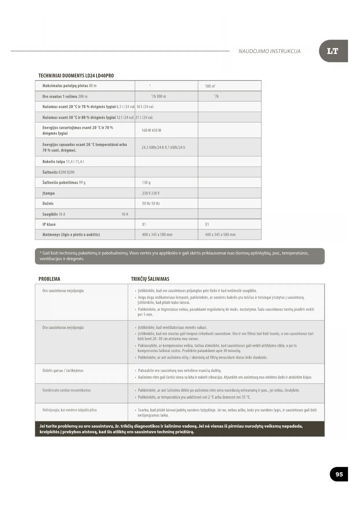 Oro sausintuvas neįsijungia • Įsitikinkite, kad oro sausintuvas prijungtas prie lizdo ir kad neišmušė saugiklio.