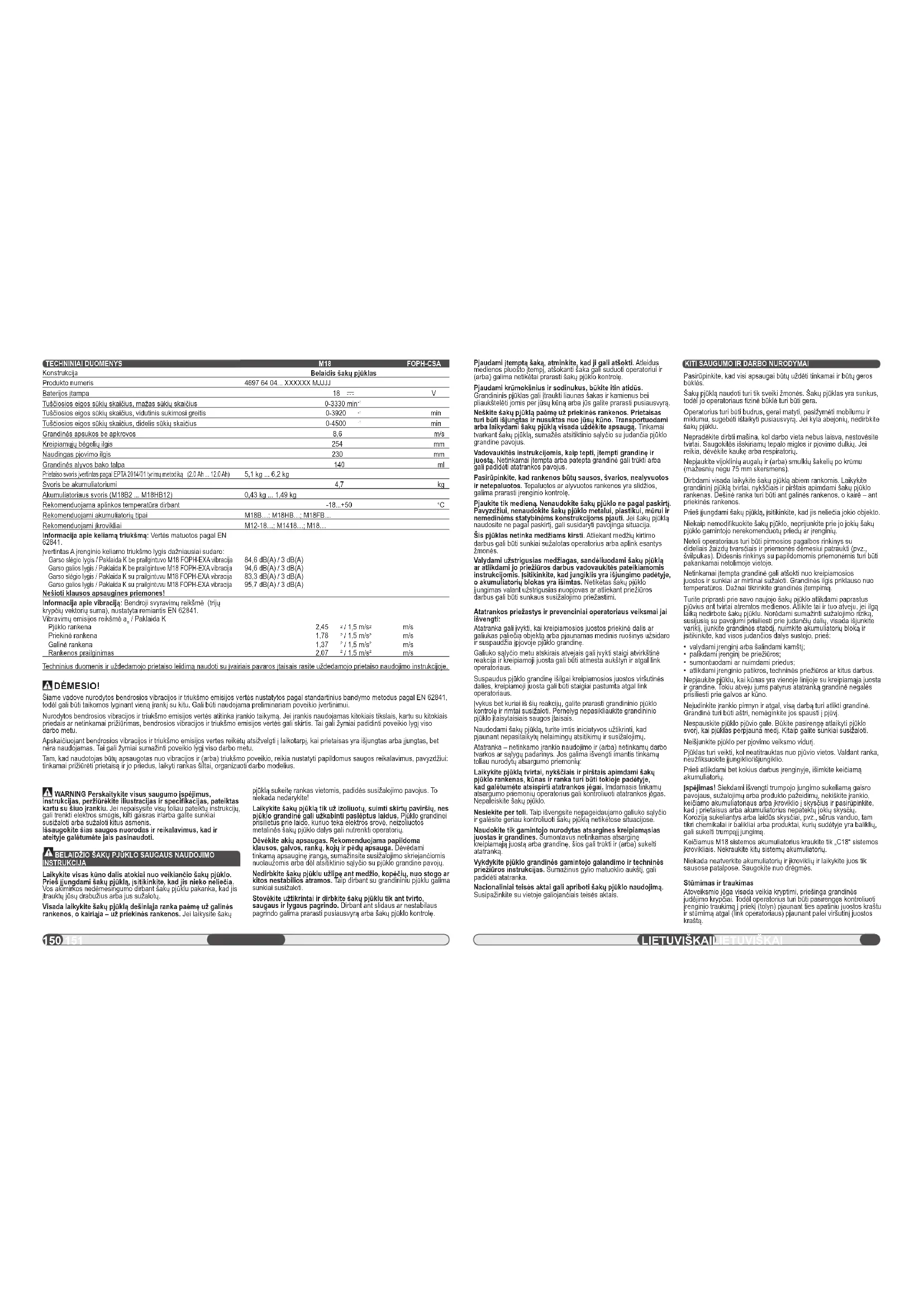 TECHNINIAI DUOMENYS Konstrukcija Produkto numeris Baterijos įtampa Tuščiosios eigos sūkių skaičius, mažas sūkių skaičius Tuščiosios eigos sūkių skaičius, vidutinis sukimosi greitis Tuščiosios eigos sūkių skaičius, didelis sūkių skaičius Grandinės apsukos be apkrovos Kreipiamųjų bėgelių ilgis Naudingas pjovimo ilgis Grandinės alyvos bako talpa Prietaiso svoris įvertintas pagal EPTA 2014/01 tyrimų metodiką (2.0 Ah ... 12.0 Ah) Svoris be akumuliatoriumi Akumuliatoriaus svoris (M18B2 ... M18HB12) Rekomenduojama aplinkos temperatūra dirbant Rekomenduojami akumuliatorių tipai Rekomenduojami įkrovikliai Informacija apie keliamą triukšmą: Vertės matuotos pagal EN