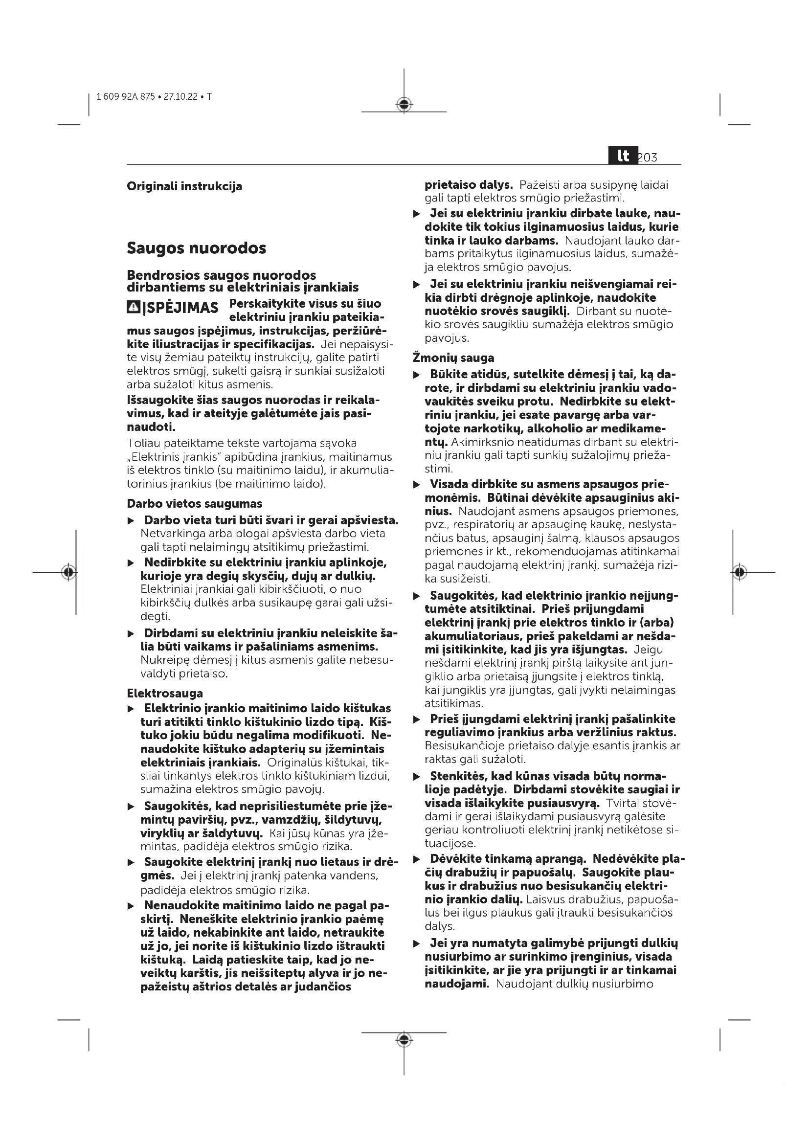 (Drožlių plokščių pjovimo duomenys galioja tik20mm storio ruošiniams.) Šioje instrukcijoje pateiktas vibracijos lygis ir triukšmo emisija buvo išmatuoti pagal standarti- zuotą matavimo metodą, ir juos galima naudoti elektriniams įrankiams palyginti. Jie taip pat skirti vibracijos ir triukšmo emisijai iš anksto įvertinti. Nurodytas vibracijos lygis ir triukšmo emisijos vertė atspindi pagrindinius elektrinio įrankio nau- dojimo atvejus. Tačiau jeigu elektrinis įrankis nau- dojamas kitokiai paskirčiai, su kitokiais darbo įran- kiais arba jeigu jis nepakankamai techniškai pri- žiūrimas, vibracijos lygis ir triukšmo emisijos ver- tė gali kisti. Tokiu atveju vibracijos ir triukšmo emisija per visą darbo laikotarpį gali žymiai padi- dėti. Norint tiksliai įvertinti vibracijos ir triukšmo emisi- ją per tam tikrą darbo laiką, reikia atsižvelgti ir į laiką, per kurį elektrinis įrankis buvo išjungtas arba, nors ir veikė, bet nebuvo naudojamas. Tai įvertinus, vibracijos ir triukšmo emisija per visą darbo laiką žymiai sumažės. Dirbančiajam nuo vibracijos poveikio apsaugoti paskirkite papildomas apsaugos priemones, pvz.: elektrinių ir darbo įrankių techninę priežiūrą, ra- nkų šildymą, darbo eigos organizavimą. AkumuliatoriusLietuvių k. Akumuliatoriaus įkrovimasLietuvių k. u Naudokite tik techninių duomenų skyriuje nurodytus kroviklius. Tik šie krovikliai yra pri- derinti prie Jūsų elektriniame prietaise naudo- jamo ličio jonų akumuliatoriaus. Nuoroda: laikantis tarptautinių transportavimo teisės aktų, ličio jonų akumuliatoriai tiekiami dali- nai įkrauti. Kad akumuliatorius veiktų visa galia, prieš pirmąjį naudojimą akumuliatorių visiškai įkraukite. Akumuliatoriaus įdėjimasLietuvių k. Įkrautą akumuliatorių stumkite į akumuliatoriaus laikiklį, kol pajusite, kad užsifiksavo. Akumuliatoriaus išėmimasLietuvių k. Norėdami išimti akumuliatorių, paspauskite aku- muliatoriaus atblokavimo klavišus ir išimkite aku- muliatorių. Traukdami nenaudokite jėgos. Akumuliatoriuje yra 2fiksavimo pakopos, kurios saugo, kad netikėtai paspaudus akumuliatoriaus atblokavimo klavišą, akumuliatorius neiškristų. Į elektrinį prietaisą įstatytą akumuliatorių tinkamoje padėtyje palaiko spyruoklė. Akumuliatoriaus įkrovos būklės indikatoriusLietuvių k. Žali akumuliatoriaus įkrovos būklės indikato- riairodo akumuliatoriausįkrovos būklę. Dėl sau- gumo, įkrovos būklę galima pažiūrėti tik tada, kai elektrinis įrankis neveikia. Jei norite, kad būtų parodyta įkrovos būklė, pa- spauskite įkrovos būklės mygtuką arba . Tai galima ir tada, kai akumuliatorius yra išimtas. Jei paspaudus mygtuką nešviečia nei vienas šviesadiodis indikatorius, vadinasi akumuliatorius yra pažeistas ir jį reikia pakeisti. 206 lt 1 609 92A 875 • 27.10.22 • TAkumuliatoriaus tipas GBA 18V...Lietuvių k. Šviesos diodas Talpa Šviečia nuolat 3xžali 60–100% Šviečia nuolat 2xžali 30–60% Šviečia nuolat 1xžalias 5–30% Mirksi 1xžalias 0–5% Akumuliatoriaus tipas ProCORE18V...Lietuvių k. Šviesos diodas Talpa Šviečia nuolat 5xžali 80–100% Šviečia nuolat 4xžali 60–80% Šviečia nuolat 3xžali 40–60% Šviečia nuolat 2xžali 20–40% Šviečia nuolat 1xžalias 5–20% Mirksi 1xžalias 0–5% Nuorodos, kaip optimaliai elgtis su akumuliatoriumiLietuvių k. Saugokite akumuliatorių nuo drėgmės ir vande- ns. Akumuliatorių sandėliuokite tik nuo −20°C iki 50°C temperatūroje. Pvz., nepalikite akumuliato- riaus vasarą automobilyje. Akumuliatoriaus ventiliacines angas valykite minkštu, švariu ir sausu teptuku. Pastebimas įkrauto akumuliatoriaus veikimo laiko sutrumpėjimas rodo, kad akumuliatorius susidė- vėjo ir jį reikia pakeisti. Laikykitės pateiktų šalinimo nurodymų. MontavimasLietuvių k. u Prieš atliekant bet kokius elektrinio įrankio priežiūros darbus (atliekant techninę prie- žiūrą ar keičiant įrankį ir t. t.), o taip pat elektrinį įrankį transportuojant ir sandė- liuojant, būtina iš jo išimti akumuliatorių. Priešingu atveju galite susižeisti, netyčia nu- spaudę įjungimo-išjungimo jungiklį. Pjūklelio įdėjimas ir keitimasLietuvių k. u Montuodami ar keisdami darbo įrankį mū- vėkite apsaugines pirštines. Darbo įrankiai yra aštrūs ir po ilgesnio naudojimo gali įkaisti. u Keisdami pjūklelį atkreipkite dėmesį, kad pjūklelio įtvare nebūtų ruošinio likučių (pvz., medžio ar metalo drožlių). Pjovimo disko pasirinkimasLietuvių k. Naudokite tik pjūklelius su 1/2" universaliu kote- liu. Pjūklelis neturi būti ilgesnis nei reikia numaty- tam pjūviui atlikti. Pjūklelio įdėjimas (žr.Apav.)Lietuvių k. Sukite fiksuojamąją įvorę(3)apie 90° rodyklės kryptimi ir tvirtai laikykite. Įstatykite pjūklelį(1)į pjūklelio įtvarą(10). Fiksuojamąją įvorę atleiskite. u Patikrinkite, ar pjūklelis tvirtai įsistatė, t.y. jį patraukite. Netvirtai įstatytas pjūklelis gali iš- kristi ir sužaloti. Atliekant kai kuriuos darbus pjūklelį (1) galima įstatyti ir apverstą 180° kampu (dantukai nukreipti aukštyn). Pjūklelio išėmimas (žr.Bpav.)Lietuvių k. u Prieš išimdami pjūklelį palaukite, kol jis at- vės. Prisilietus prie karšto pjūklelio iškyla susi- žalojimo pavojus. Sukite fiksuojamąją įvorę(3)apie 90° rodyklės kryptimi ir tvirtai laikykite. Išimkite pjūklelį (1). Dulkių, pjuvenų ir drožlių nusiurbimasLietuvių k. Medžiagų, kurių sudėtyje yra švino, kai kurių rūšių medienos, mineralų ir metalų dulkės gali būti ke- nksmingos sveikatai. Dirbančiajam arba netoli esantiems asmenims nuo sąlyčio su dulkėmis arba jų įkvėpus gali kilti alerginės reakcijos, taip pat jie gali susirgti kvėpavimo takų ligomis. Kai kurios dulkės, pvz., ąžuolo ir buko, yra vėžį sukeliančios, o ypač, kai mediena yra apdorota specialiomis medienos priežiūros priemonėmis (chromatu, medienos apsaugos p