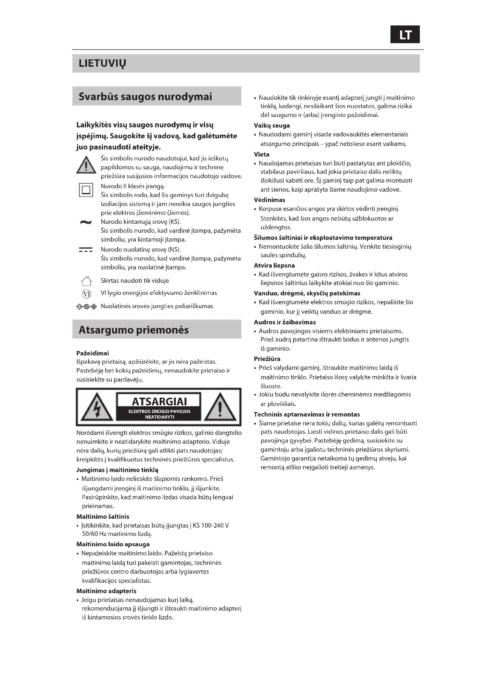 Šis simbolis nurodo naudotojui, kad jis ieškotų papildomos su sauga, naudojimu ir technine priežiūra susijusios informacijos naudotojo vadove.Nurodo II klasės įrangą.Šis simbolis rodo, kad šis gaminys turi dvigubą izoliacijos sistemą ir jam nereikia saugos jungties prie elektros įžeminimo (žemės).Nurodo kintamąją srovę (KS).Šis simbolis nurodo, kad vardinė įtampa, pažymėta simboliu, yra kintamoji įtampa.Nurodo nuolatinę srovę (NS). Šis simbolis nurodo, kad vardinė įtampa, pažymėta simboliu, yra nuolatinė įtampa.Skirtas naudoti tik vidujeVI lygio energijos efektyvumo ženklinimasNuolatinės srovės jungties poliariškumas Atsargumo priemonės PažeidimaiIšpakavę prietaisą, apžiūrėkite, ar jis nėra pažeistas. Pastebėję bet kokių pažeidimų, nenaudokite prietaiso ir susisiekite su pardavėju. ATSARGIAI ELEKTROS SMŪGIO PAVOJUSNEATIDARYTINorėdami išvengti elektros smūgio rizikos, galinio dangtelio nenuimkite ir neatidarykite maitinimo adapterio. Viduje nėra dalių, kurių priežiūrą gali atlikti pats naudotojas; kreipkitės į kvalikuotus techninės priežiūros specialistus.Jungimas į maitinimo tinklą• Maitinimo laido nelieskite šlapiomis rankomis. Prieš išjungdami įrenginį iš maitinimo tinklo, jį išjunkite. Pasirūpinkite, kad maitinimo lizdas visada būtų lengvai prieinamas.Maitinimo šaltinis• Įsitikinkite, kad prietaisas būtų įjungtas į KS 100-240 V 50/60 Hz maitinimo lizdą.Maitinimo laido apsauga• Nepažeiskite maitinimo laido. Pažeistą prietaiso maitinimo laidą turi pakeisti gamintojas, techninės priežiūros centro darbuotojas arba lygiavertės kvalikacijos specialistas.Maitinimo adapteris• Jeigu prietaisas nenaudojamas kurį laiką, rekomenduojama jį išjungti ir ištraukti maitinimo adapterį iš kintamosios srovės tinklo lizdo.• Naudokite tik rinkinyje esantį adapterį jungti į maitinimo tinklą, kadangi, nesilaikant šios nuostatos, galima rizika dėl saugumo ir (arba) įrenginio pažeidimai.Vaikų sauga• Naudodami gaminį visada vadovaukitės elementariais atsargumo principais – ypač netoliese esant vaikams.Vieta• Naudojamas prietaisas turi būti pastatytas ant plokščio, stabilaus paviršiaus, kad jokia prietaiso dalis neliktų išsikišusi kabėti ore. Šį gaminį taip pat galima montuoti ant sienos, kaip aprašyta šiame naudojimo vadove.Vėdinimas• Korpuse esančios angos yra skirtos vėdinti įrenginį. Stenkitės, kad šios angos nebūtų užblokuotos ar uždengtos.Šilumos šaltiniai ir eksploatavimo temperatūra• Nemontuokite šalia šilumos šaltinių. Venkite tiesioginių saulės spindulių.Atvira liepsna• Kad išvengtumėte gaisro rizikos, žvakes ir kitus atviros liepsnos šaltinius laikykite atokiai nuo šio gaminio.Vanduo, drėgmė, skysčių patekimas• Kad išvengtumėte elektros smūgio rizikos, nepalikite šio gaminio, kur jį veiktų vanduo ar drėgmė.Audros ir žaibavimas• Audros pavojingos visiems elektriniams prietaisams. Prieš audrą patartina ištraukti laidus ir antenos jungtis iš gaminio.Priežiūra• Prieš valydami gaminį, ištraukite maitinimo laidą iš maitinimo tinklo. Prietaiso išorę valykite minkšta ir švaria šluoste.• Jokiu būdu nevalykite išorės cheminėmis medžiagomis ar plovikliais.Techninis aptarnavimas ir remontas• Šiame prietaise nėra tokių dalių, kurias galėtų remontuoti pats naudotojas. Liesti vidines prietaiso dalis gali būti pavojinga gyvybei. Pastebėję gedimą, susisiekite su gamintoju arba įgaliotu techninės priežiūros skyriumi. Gamintojo garantija netaikoma tų gedimų atveju, kai remontą atliko neįgalioti tretieji asmenys.64 Įrangos utilizavimas Informacija naudotojams apie senos įrangos surinkimą ir utilizavimą. Šis simbolis ant gaminio reiškia, kad gaminiui taikoma Europos direktyva 2012/19/ES ir jo negalima išmesti su buitinėmis atliekomis. Šis simbolis reiškia, kad gaminys suprojektuotas ir pagamintas taip, kad jį būtų galima perdirbti ir naudoti pakartotinai. Šie simboliai ant gaminių, pakuotės ir (arba) lydinčiuose dokumentuose reiškia, kad panaudotų elektros ir elektroninių gaminių bei akumuliatorių negalima maišyti su įprastomis buitinėmis atliekomis. Įrenginio naudotojai buityje turi susisiekti su mažmeninės prekybos vieta, kur jį įsigijo, arba į vietos savivaldos instituciją dėl informacijos, kur ir kaip gali nugabenti tokius daiktus perdirbimui. Pareiškimas dėl CE ir UKCA sertikavimo: