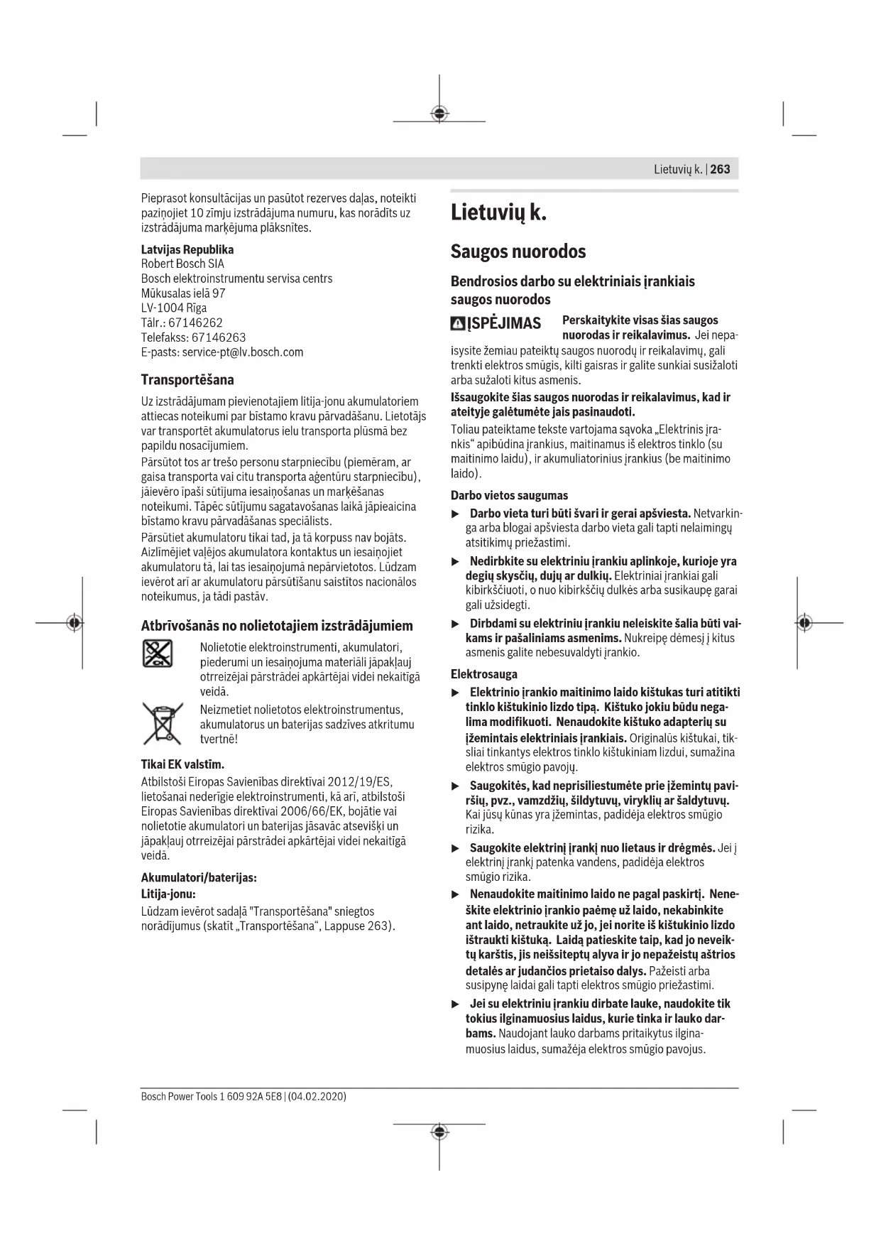 Low Energy modulis GCY30-4, darbojas radio interfeiss. Tāpēc jāievēro vietējie lietošanas ierobežojumi, kādi pastāv, piemēram, lidmašīnās un slimnīcās. Lai panāktu optimālu slīpēšanas rezultātu, vienmērīgi pārvietojiet slīpēšanas darbinstrumentu turp un atpakaļ, nedaudz piespiežot. Pārāk liels spiediens samazina elektroinstrumenta veiktspēju un paātrina slīpēšanas darbinstrumenta nodilumu. u Uzglabājiet slīpēšanas darbinstrumentus tā, lai tie būtu pasargāti no triecieniem. Norādījumi par optimālu apiešanos ar akumulatoru Sargājiet akumulatoru no mitruma un ūdens. Uzglabājiet akumulatoru pie temperatūras no –20 °C līdz 50 °C. Neatstājiet akumulatoru karstumā, piemēram, vasaras laikā neatstājiet to automašīnā. Laiku pa laikam iztīriet akumulatora ventilācijas atvērumus ar mīkstu, tīru un sausu otu. Ja manāmi samazinās instrumenta darbības laiks starp akumulatora uzlādēm, tas norāda, ka akumulators ir nolietojies un to nepieciešams nomainīt. Ievērojiet norādījumus par atbrīvošanos no nolietotajiem izstrādājumiem. Apkalpošana un apkope Apkalpošana un tīrīšana u Veicot jebkurus darbus ar elektroinstrumentu (piemēram, apkalpošanu, darbinstrumentu nomaiņu utt.), kā arī pirms tā transportēšanas vai uzglabāšanas vienmēr izņemiet no elektroinstrumenta akumulatoru. Ieslēdzēja nejauša nospiešana var izraisīt savainojumu. u Lai elektroinstruments darbotos droši un bez atteikumiem, regulāri tīriet tā korpusu un ventilācijas atveres. Klientu apkalpošanas dienests un konsultācijas par lietošanu Klientu apkalpošanas dienests atbildēs uz Jūsu jautājumiem par izstrādājumu remontu un apkalpošanu, kā arī par to rezerves daļām. Kopsalikuma attēlus un informāciju par rezerves daļām Jūs varat atrast interneta vietnē: www.bosch-pt.com Bosch konsultantu grupa palīdzēs Jums vislabākajā veidā rast atbildes uz jautājumiem par mūsu izstrādājumiem un to piederumiem. 1 609 92A 5E8 | (04.02.2020) Bosch Power ToolsLietuvių k. | 263 Pieprasot konsultācijas un pasūtot rezerves daļas, noteikti paziņojiet 10 zīmju izstrādājuma numuru, kas norādīts uz izstrādājuma marķējuma plāksnītes. Latvijas Republika Robert Bosch SIA Bosch elektroinstrumentu servisa centrs Mūkusalas ielā 97 LV-1004 Rīga Tālr.: 67146262 Telefakss: 67146263 E-pasts: service-pt@lv.bosch.com Transportēšana Uz izstrādājumam pievienotajiem litija-jonu akumulatoriem attiecas noteikumi par bīstamo kravu pārvadāšanu. Lietotājs var transportēt akumulatorus ielu transporta plūsmā bez papildu nosacījumiem. Pārsūtot tos ar trešo personu starpniecību (piemēram, ar gaisa transporta vai citu transporta aģentūru starpniecību), jāievēro īpaši sūtījuma iesaiņošanas un marķēšanas noteikumi. Tāpēc sūtījumu sagatavošanas laikā jāpieaicina bīstamo kravu pārvadāšanas speciālists. Pārsūtiet akumulatoru tikai tad, ja tā korpuss nav bojāts. Aizlīmējiet vaļējos akumulatora kontaktus un iesaiņojiet akumulatoru tā, lai tas iesaiņojumā nepārvietotos. Lūdzam ievērot arī ar akumulatoru pārsūtīšanu saistītos nacionālos noteikumus, ja tādi pastāv. Atbrīvošanās no nolietotajiem izstrādājumiem Nolietotie elektroinstrumenti, akumulatori, piederumi un iesaiņojuma materiāli jāpakļauj otrreizējai pārstrādei apkārtējai videi nekaitīgā veidā. Neizmetiet nolietotos elektroinstrumentus, akumulatorus un baterijas sadzīves atkritumu tvertnē! Tikai EK valstīm. Atbilstoši Eiropas Savienības direktīvai 2012/19/ES, lietošanai nederīgie elektroinstrumenti, kā arī, atbilstoši Eiropas Savienības direktīvai 2006/66/EK, bojātie vai nolietotie akumulatori un baterijas jāsavāc atsevišķi un jāpakļauj otrreizējai pārstrādei apkārtējai videi nekaitīgā veidā. Akumulatori/baterijas: Litija-jonu: Lūdzam ievērot sadaļā "Transportēšana" sniegtos norādījumus (skatīt „Transportēšana“, Lappuse263). Lietuvių k. Saugos nuorodos Bendrosios darbo su elektriniais įrankiais saugos nuorodos ĮSPĖJIMAS Perskaitykite visas šias saugos nuorodas ir reikalavimus. Jei nepa- isysite žemiau pateiktų saugos nuorodų ir reikalavimų, gali trenkti elektros smūgis, kilti gaisras ir galite sunkiai susižaloti arba sužaloti kitus asmenis. Išsaugokite šias saugos nuorodas ir reikalavimus, kad ir ateityje galėtumėte jais pasinaudoti. Toliau pateiktame tekste vartojama sąvoka „Elektrinis įra- nkis“ apibūdina įrankius, maitinamus iš elektros tinklo (su maitinimo laidu), ir akumuliatorinius įrankius (be maitinimo laido). Darbo vietos saugumas u Darbo vieta turi būti švari ir gerai apšviesta. Netvarkin- ga arba blogai apšviesta darbo vieta gali tapti nelaimingų atsitikimų priežastimi. u Nedirbkite su elektriniu įrankiu aplinkoje, kurioje yra degių skysčių, dujų ar dulkių. Elektriniai įrankiai gali kibirkščiuoti, o nuo kibirkščių dulkės arba susikaupę garai gali užsidegti. u Dirbdami su elektriniu įrankiu neleiskite šalia būti vai- kams ir pašaliniams asmenims. Nukreipę dėmesį į kitus asmenis galite nebesuvaldyti įrankio. Elektrosauga u Elektrinio įrankio maitinimo laido kištukas turi atitikti tinklo kištukinio lizdo tipą. Kištuko jokiu būdu nega- lima modifikuoti. Nenaudokite kištuko adapterių su įžemintais elektriniais įrankiais. Originalūs kištukai, tik- sliai tinkantys elektros tinklo kištukiniam lizdui, sumažina elektros smūgio pavojų. u Saugokitės, kad neprisiliestumėte prie įžemintų pavi- ršių, pvz., vamzdžių, šildytuvų, viryklių ar šaldytuvų. Kai jūsų kūnas yra įžemintas, padidėja elektros smūgio rizika. u Saugokite elektrinį įrankį nuo lietaus ir drėgmės. Jei į elektrinį įrankį patenka vandens, padidėja elektros smūgio rizika. u Nenaudokite maitinimo laido ne pagal paskirtį. Nene- škite elektrinio įrankio paėmę už laido, nekabinkite ant laido, netraukit