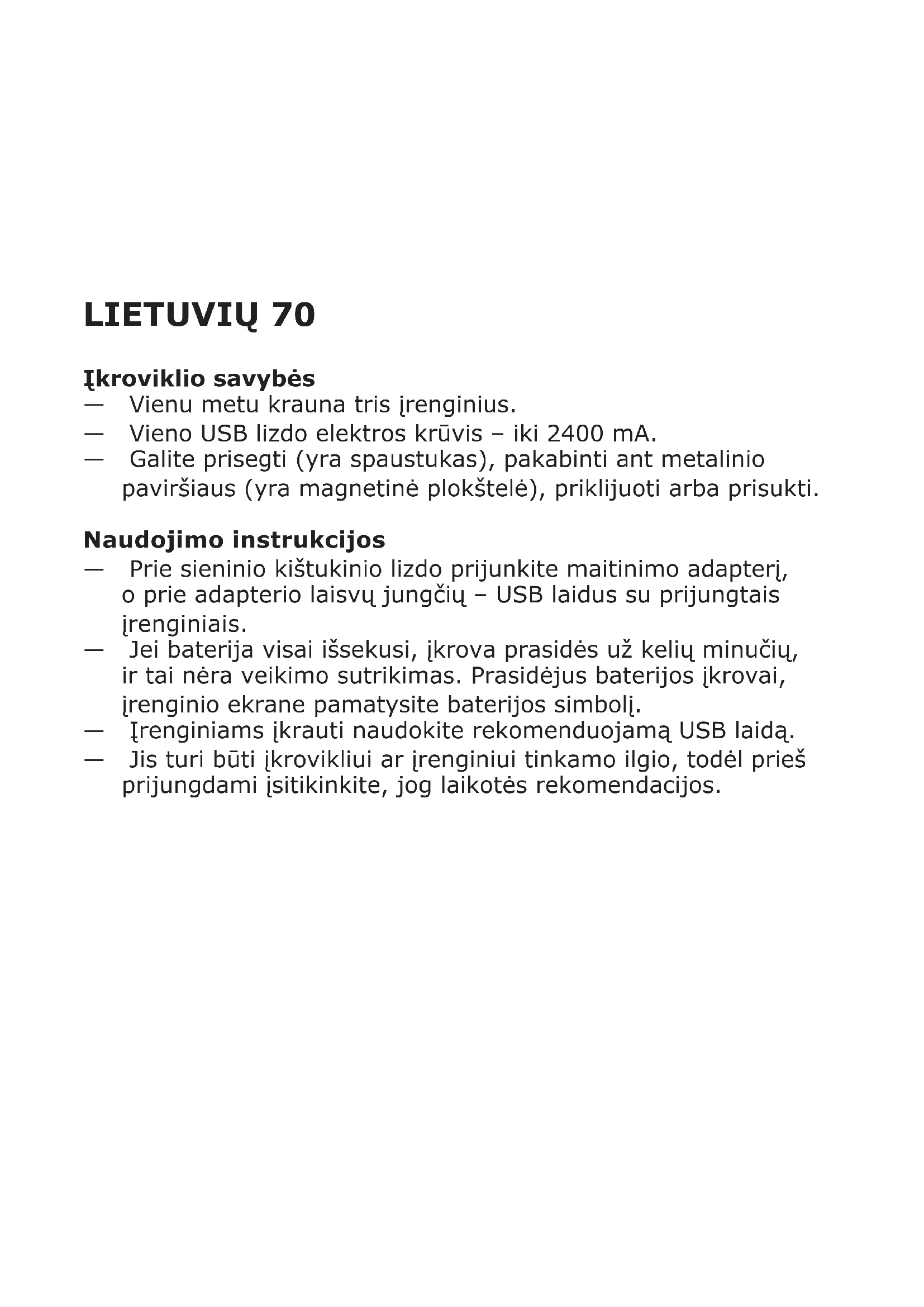 Tips: E1605 LÖRBY Ieeja: 24V DC Izeja: 5V DC Lietošanai vienīgi iekštelpās Maksimālā kopējā slodze: 3400 mA Maksimālā slodze 1 USB izejā: 2400 mA Maksimālais USB vada garums: 1,5 m/4'11" Ražotājs: IKEA of Sweden AB Adrese: Box 702, SE-343 81 Elmhulta, ZVIEDRIJA Nosvītrotais atkritumu konteinera simbols norāda, ka prece jālikvidē atsevišķi no citiem sadzīves atkritumiem. Šī prece jānodod pārstrādei, ņemot vērā vietējos vides aizsardzības noteikumus, kas attiecas uz atkritumu apsaimniekošanu. Nošķirot marķēto preci no sadzīves atkritumiem, jūs palīdzēsiet samazināt atkritumu apjomu, kas nonāk atkritumu sadedzināšanas iekārtās vai atkritumu poligonos, tādējādi samazinot to potenciālo negatīvo ietekmi uz veselību un vidi. Sīkāka informācija IKEA veikalos.LIETUVIŲ 70 Įkroviklio savybės — Vienu metu krauna tris įrenginius. — Vieno USB lizdo elektros krūvis – iki 2400 mA. — Galite prisegti (yra spaustukas), pakabinti ant metalinio paviršiaus (yra magnetinė plokštelė), priklijuoti arba prisukti. Naudojimo instrukcijos — Prie sieninio kištukinio lizdo prijunkite maitinimo adapterį, o prie adapterio laisvų jungčių – USB laidus su prijungtais įrenginiais. — Jei baterija visai išsekusi, įkrova prasidės už kelių minučių, ir tai nėra veikimo sutrikimas. Prasidėjus baterijos įkrovai, įrenginio ekrane pamatysite baterijos simbolį. — Įrenginiams įkrauti naudokite rekomenduojamą USB laidą. — Jis turi būti įkrovikliui ar įrenginiui tinkamo ilgio, todėl prieš prijungdami įsitikinkite, jog laikotės rekomendacijos.71 Naudinga žinoti — Įkrovos greičiui bei efektyvumui turi įtakos USB laido ilgis ir jo kokybė. — Įkraunami įrenginiai gali įkaisti – tai visiškai normalu. Pasibaigus įkrovos laikui, kai baterija bus įkrauta, jie po truputį atvės. — Įkrovos trukmė kinta priklausomai nuo baterijos talpos, jos išsekimo lygio, amžiaus ir aplinkos temperatūros. — Įkroviklio laikymo temperatūra: nuo -20 °C iki 25 °C. — Įkroviklio veikimo temperatūra: nuo 0 °C iki 40 °C. Prieš valydami įkroviklį ir kai nereikalingas, atjunkite jį nuo maitinimo šaltinio. Įkroviklį valykite drėgna šluoste; niekada nemerkite įkroviklio į vandenį ar kitokį skystį. Rekomenduojamos atsargumo priemonės ir techniniai duomenys yra nurodyti ant įkroviklio nugarėlės. Išsaugokite instrukcijas ateičiai.72 PERSPĖJIMAS: — Sieninis kištukinis lizdas turi būti prie įrenginio ir lengvai pasiekiamas. — Naudokite tik sausoje aplinkoje. — Šis gaminys nėra žaislas, todėl vaikams reikėtų drausti su juo žaisti. — Jei laidas pažeistas, gaminį reikia tinkamai išmesti. — Niekada nenaudokite pažeisto, netinkamai veikiančio USB laido įrenginiui įkrauti, nes jis gali pakenkti įkrovikliui ir įrenginiui. Techninė priežiūra Savarankiškai neremontuokite prekės, nes atidarę korpusą galite nukentėti nuo pavojingos įtampos ir kitų priežasčių.73 TECHNINIAI DUOMENYS Tipas: E1605 LÖRBY Įėja: 24 V DC Išėja: 5 V DC Naudoti tik patalpose Didž. el. krūvis: 3400 mA Didž. vieno USB lizdo el. krūvis: 2400 mA Didž. USB laido ilgis: 1,5 m Gamintojas: IKEA of Sweden AB Adresas: p. d. 702, 343 81 Elmhultas, Švedija. Perbraukto atliekų konteinerio simbolis reiškia, kad gaminio atliekų negalima tvarkyti kartu su kitomis buitinėmis atliekomis. Gaminys turi būti perdirbamas pagal šalies aplinkosaugos reikalavimus. Atskirdami taip pažymėtą gaminį nuo buitinių atliekų padėsite sumažinti atliekų kiekius išvežamus į sąvartynus ar deginimo vietas, ir galimą neigiamą poveikį žmogaus sveikatai bei gamtai. Daugiau informacijos jums suteiks parduotuvėje IKEA.PORTUGUÊS 74 Características do carregador — Carrega 3 dispositivos simultaneamente. — Uma única entrada USB fornece até 2400 mA de carga. — Pode xar-se com o clipe incluído, com a placa magnética integrada, com a etiqueta adesiva ou com parafusos. Instruções de utilização — Ligue o adaptador de corrente a uma tomada, insira os cabos USB um a um nas entradas livres e a outra extremidade ao dispositivo que quer carregar. — Se a bateria estiver totalmente descarregada, pode demorar alguns minutos antes de iniciar o carregamento, algo que é normal. Pode vericar quando a bateria começar a ser carregada quando o símbolo de bateria surgir no telemóvel. — Ao carregar, use apenas um cabo USB recomendado para o seu dispositivo. — Certique-se de que não excede o tamanho máximo do cabo USB recomendado para o seu aparelho ou dispositivo.75 Convém saber — O comprimento e a qualidade do cabo USB inuenciam a velocidade e o desempenho do carregamento. — Os dispositivos podem aquecer durante o carregamento, o que é normal, arrefecendo gradualmente quando estiverem totalmente carregados. — A duração do carregamento pode variar com base na capacidade da bateria do dispositivo, com o nível de carga, com a idade da bateria e com a temperatura ambiente. — Temperatura de armazenamento do carregador: entre -20°C e 25°C. — Temperatura de funcionamento do carregador: entre 0°C e 40°C. Desligue o carregador da tomada antes de o limpar e sempre que não estiver a ser utilizado. Para limpar o carregador, use um pano húmido. Nunca o coloque dentro de água. Consulte as medidas de prevenção recomendadas e os dados técnicos na parte de trás do carregador. Guarde estas instruções para uso futuro.76 ATENÇÃO: — A tomada deve estar localizada perto do equipamento e deve estar acessível. — Usar apenas em zonas secas. — As crianças devem ser supervisionadas para garantir que não brincam com o produto. — Se o cabo estiver danicado, o aparelho não deve ser utilizado. — Nunca utilize um cabo USB danicado ou defeituoso para o carregamento, pois isso pode danicar o aparelho e prejudicar o seu dispositivo. Serviços relacionados com o produto Não tente reparar o produto sozin