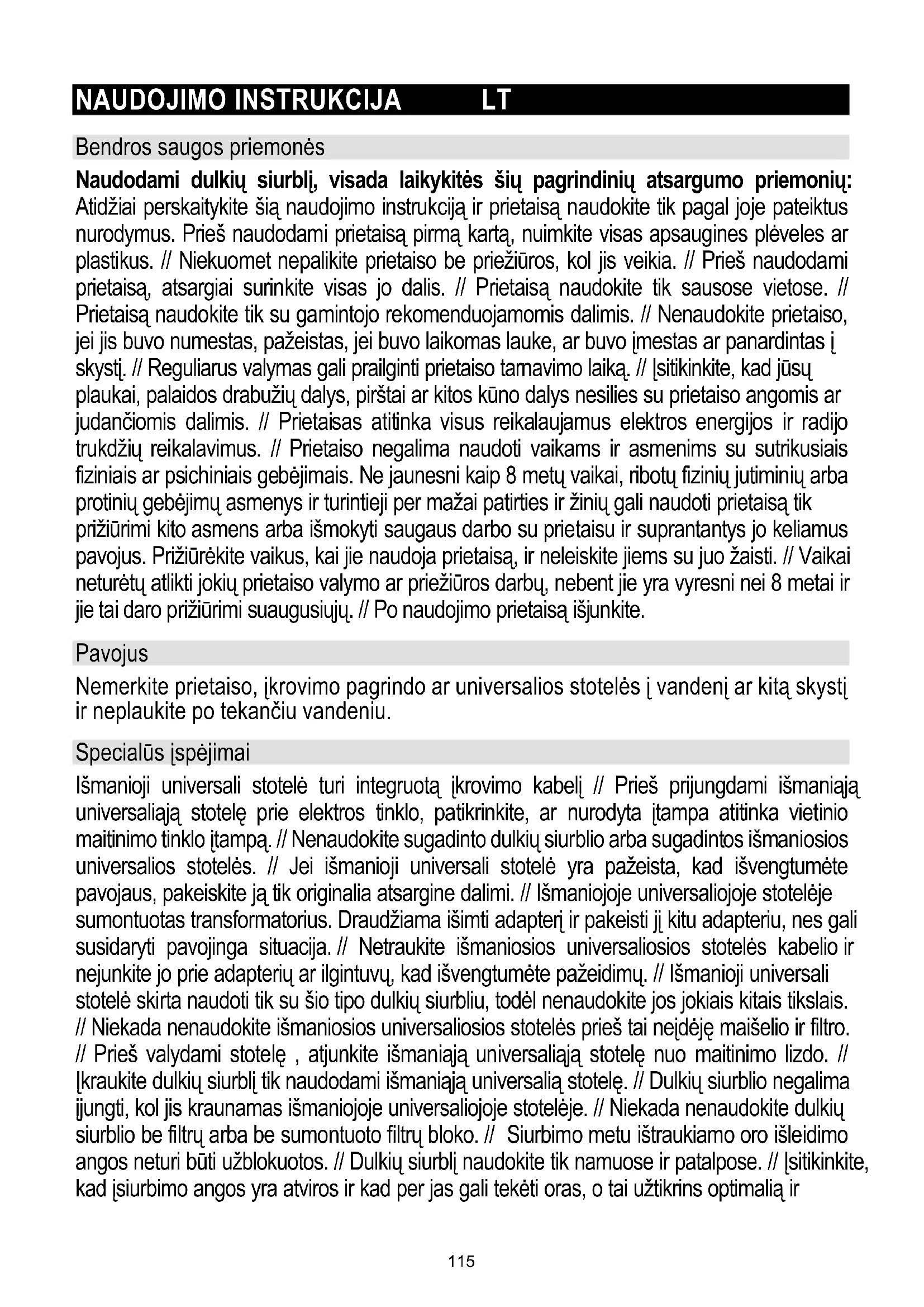 Bendros saugos priemonės Naudodami dulkių siurblį, visada laikykitės šių pagrindinių atsargumo priemonių: Atidžiai perskaitykite šią naudojimo instrukciją ir prietaisą naudokite tik pagal joje pateiktus nurodymus. Prieš naudodami prietaisą pirmą kartą, nuimkite visas apsaugines plėveles ar plastikus. // Niekuomet nepalikite prietaiso be priežiūros, kol jis veikia. // Prieš naudodami prietaisą, atsargiai surinkite visas jo dalis. // Prietaisą naudokite tik sausose vietose. // Prietaisą naudokite tik su gamintojo rekomenduojamomis dalimis. // Nenaudokite prietaiso, jei jis buvo numestas, pažeistas, jei buvo laikomas lauke, ar buvo įmestas ar panardintas į skystį. // Reguliarus valymas gali prailginti prietaiso tarnavimo laiką. // Įsitikinkite, kad jūsų plaukai, palaidos drabužių dalys, pirštai ar kitos kūno dalys nesilies su prietaiso angomis ar judančiomis dalimis. // Prietaisas atitinka visus reikalaujamus elektros energijos ir radijo trukdžių reikalavimus. // Prietaiso negalima naudoti vaikams ir asmenims su sutrikusiais fiziniais ar psichiniais gebėjimais. Ne jaunesni kaip 8 metų vaikai, ribotų fizinių jutiminių arba protinių gebėjimų asmenys ir turintieji per mažai patirties ir žinių gali naudoti prietaisą tik prižiūrimi kito asmens arba išmokyti saugaus darbo su prietaisu ir suprantantys jo keliamus pavojus. Prižiūrėkite vaikus, kai jie naudoja prietaisą, ir neleiskite jiems su juo žaisti. // Vaikai neturėtų atlikti jokių prietaiso valymo ar priežiūros darbų, nebent jie yra vyresni nei 8 metai ir jie tai daro prižiūrimi suaugusiųjų. // Po naudojimo prietaisą išjunkite. Pavojus Nemerkite prietaiso, įkrovimo pagrindo ar universalios stotelės į vandenį ar kitą skystį ir neplaukite po tekančiu vandeniu. Specialūs įspėjimai Išmanioji universali stotelė turi integruotą įkrovimo kabelį // Prieš prijungdami išmaniąją universaliąją stotelę prie elektros tinklo, patikrinkite, ar nurodyta įtampa atitinka vietinio maitinimo tinklo įtampą. // Nenaudokite sugadinto dulkių siurblio arba sugadintos išmaniosios universalios stotelės. // Jei išmanioji universali stotelė yra pažeista, kad išvengtumėte pavojaus, pakeiskite ją tik originalia atsargine dalimi. // Išmaniojoje universaliojoje stotelėje sumontuotas transformatorius. Draudžiama išimti adapterį ir pakeisti jį kitu adapteriu, nes gali susidaryti pavojinga situacija. // Netraukite išmaniosios universaliosios stotelės kabelio ir nejunkite jo prie adapterių ar ilgintuvų, kad išvengtumėte pažeidimų. // Išmanioji universali stotelė skirta naudoti tik su šio tipo dulkių siurbliu, todėl nenaudokite jos jokiais kitais tikslais. // Niekada nenaudokite išmaniosios universaliosios stotelės prieš tai neįdėję maišelio ir filtro. // Prieš valydami stotelę , atjunkite išmaniąją universaliąją stotelę nuo maitinimo lizdo. // Įkraukite dulkių siurblį tik naudodami išmaniąją universalią stotelę. // Dulkių siurblio negalima įjungti, kol jis kraunamas išmaniojoje universaliojoje stotelėje. // Niekada nenaudokite dulkių siurblio be filtrų arba be sumontuoto filtrų bloko. // Siurbimo metu ištraukiamo oro išleidimo angos neturi būti užblokuotos. // Dulkių siurblį naudokite tik namuose ir patalpose. // Įsitikinkite, kad įsiurbimo angos yra atviros ir kad per jas gali tekėti oras, o tai užtikrins optimalią ir