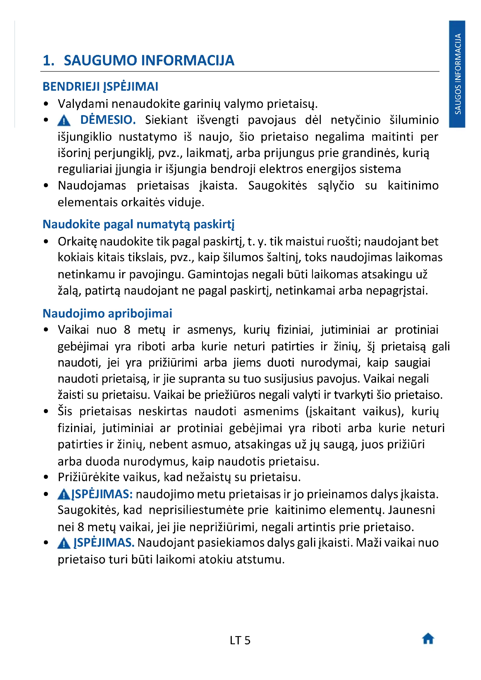 - ĮSPĖJIMAS. Naudojant pasiekiamos dalys gali įkaisti. Maži vaikai nuo prietaiso turi būti laikomi atokiu atstumu.LT 6 SAUGOS INFORMACIJA