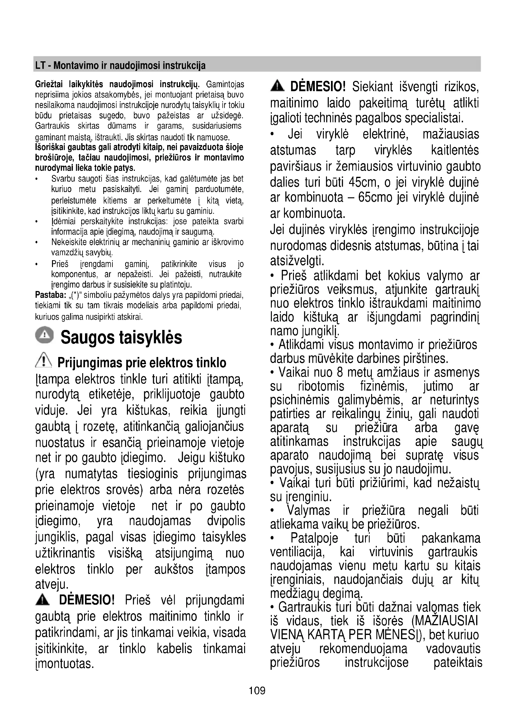 - Prieš įrengdami gaminį, patikrinkite visus jo komponentus, ar nepažeisti. Jei pažeisti, nutraukite įrengimo darbus ir susisiekite su platintoju. Pastaba: „(*)“ simboliu pažymėtos dalys yra papildomi priedai, tiekiami tik su tam tikrais modeliais arba papildomi priedai, kuriuos galima nusipirkti atskirai. Saugos taisyklės Prijungimas prie elektros tinklo Įtampa elektros tinkle turi atitikti įtampą, nurodytą etiketėje, priklijuotoje gaubto viduje. Jei yra kištukas, reikia įjungti gaubtą į rozetę, atitinkančią galiojančius nuostatus ir esančią prieinamoje vietoje net ir po gaubto įdiegimo. Jeigu kištuko (yra numatytas tiesioginis prijungimas prie elektros srovės) arba nėra rozetės prieinamoje vietoje net ir po gaubto įdiegimo, yra naudojamas dvipolis jungiklis, pagal visas įdiegimo taisykles užtikrinantis visišką atsijungimą nuo elektros tinklo per aukštos įtampos atveju. DĖMESIO! Prieš vėl prijungdami gaubtą prie elektros maitinimo tinklo ir patikrindami, ar jis tinkamai veikia, visada įsitikinkite, ar tinklo kabelis tinkamai įmontuotas. DĖMESIO! Siekiant išvengti rizikos, maitinimo laido pakeitimą turėtų atlikti įgalioti techninės pagalbos specialistai.