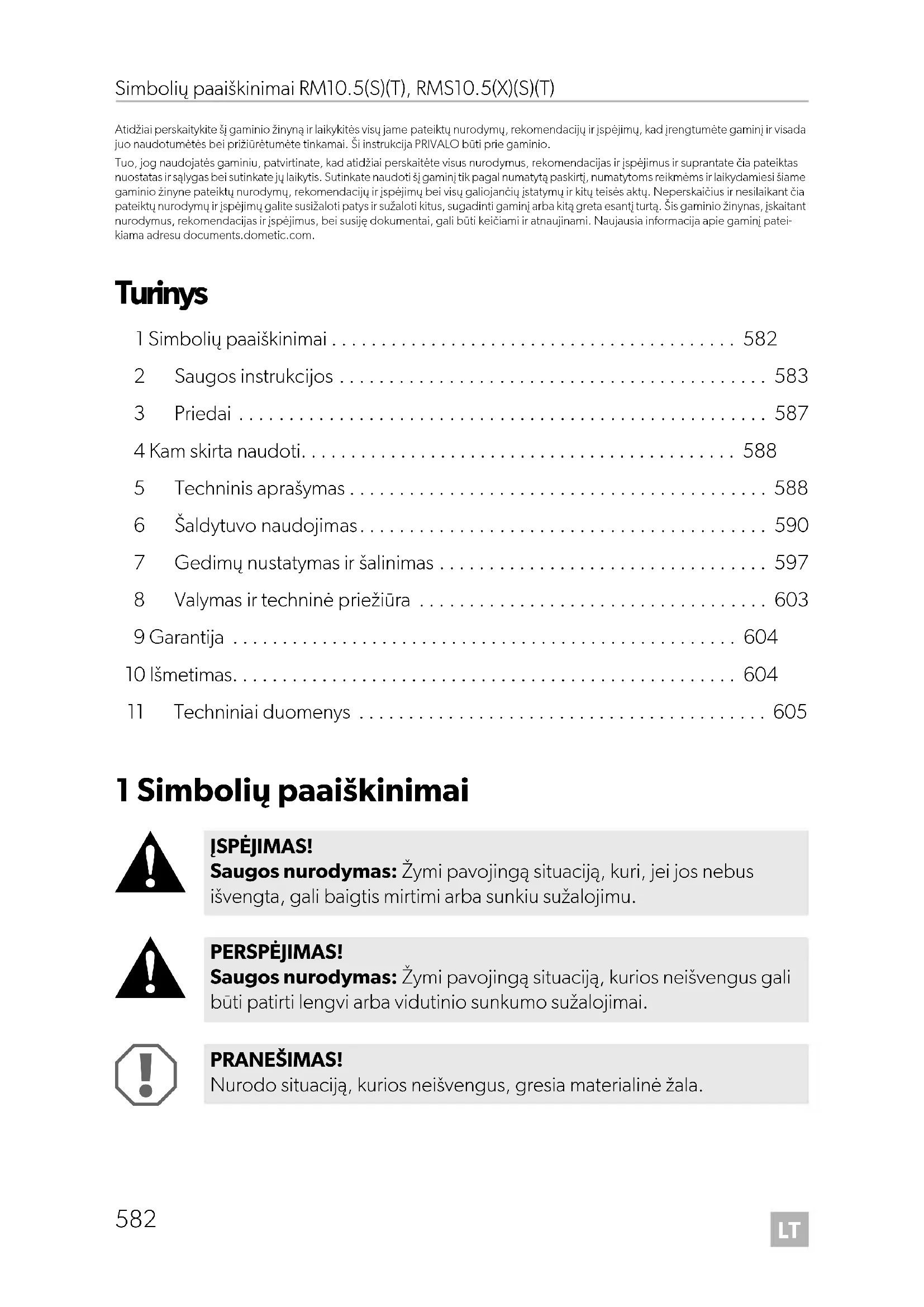 - Atidžiai perskaitykite šį gaminio žinyną ir laikykitės visų jame pateiktų nurodymų, rekomendacijų ir įspėjimų, kad įrengtumėte gaminį ir visada juo naudotumėtės bei prižiūrėtumėte tinkamai. Ši instrukcija PRIVALO būti prie gaminio. Tuo, jog naudojatės gaminiu, patvirtinate, kad atidžiai perskaitėte visus nurodymus, rekomendacijas ir įspėjimus ir suprantate čia pateiktas nuostatas ir sąlygas bei sutinkate jų laikytis. Sutinkate naudoti šį gaminį tik pagal numatytą paskirtį, numatytoms reikmėms ir laikydamiesi šiame gaminio žinyne pateiktų nurodymų, rekomendacijų ir įspėjimų bei visų galiojančių įstatymų ir kitų teisės aktų. Neperskaičius ir nesilaikant čia pateiktų nurodymų ir įspėjimų galite susižaloti patys ir sužaloti kitus, sugadinti gaminį arba kitą greta esantį turtą. Šis gaminio žinynas, įskaitant nurodymus, rekomendacijas ir įspėjimus, bei susiję dokumentai, gali būti keičiami ir atnaujinami. Naujausia informacija apie gaminį patei- kiama adresu documents.dometic.com. Turinys 1 Simbolių paaiškinimai p. 582