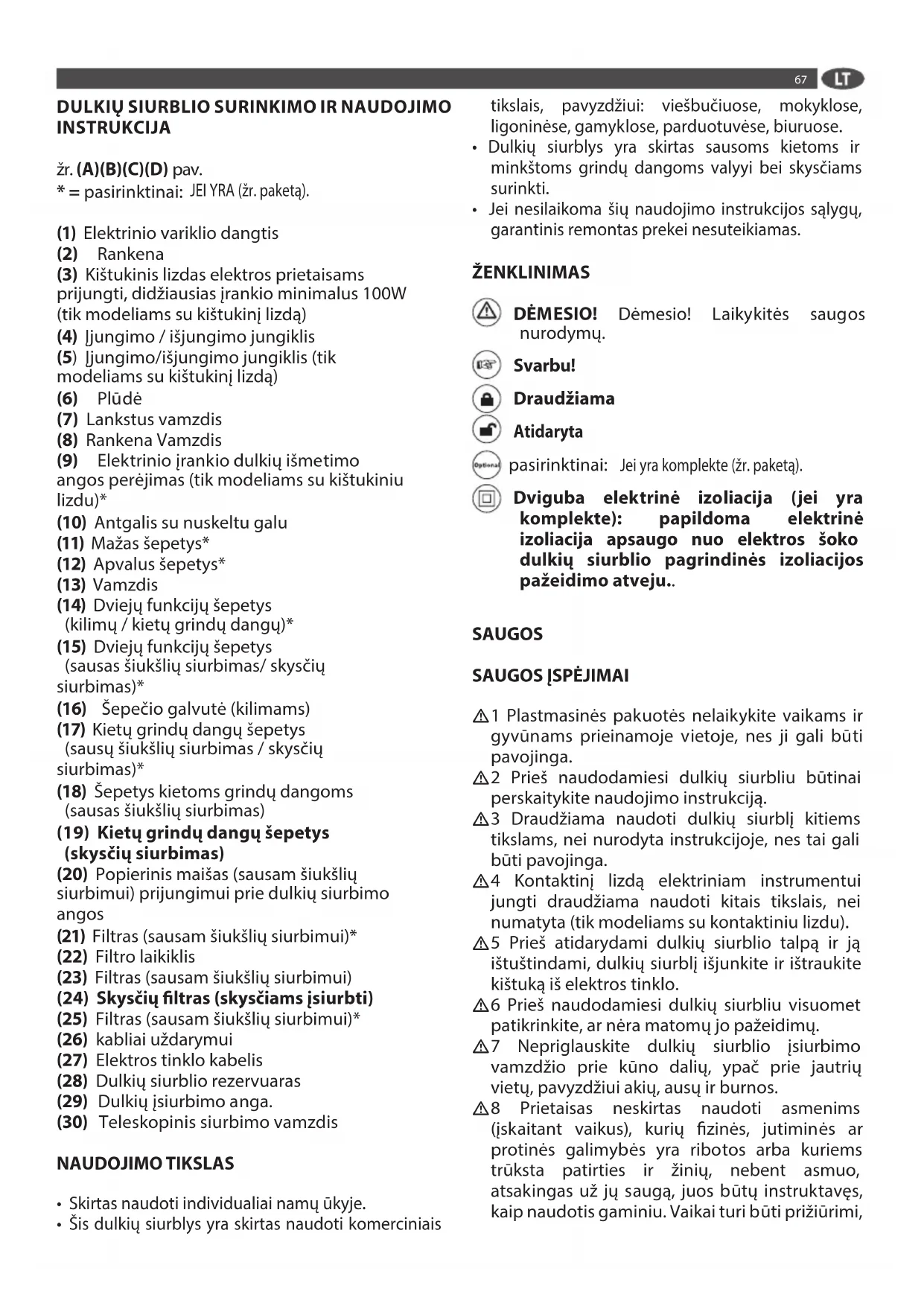 - = pasirinktinai: JEI YRA (žr. paketą). (1) Elektrinio variklio dangtis (2) Rankena (3) Kištukinis lizdas elektros prietaisams prijungti, didžiausias įrankio minimalus 100W (tik modeliams su kištukinį lizdą) (4) Įjungimo / išjungimo jungiklis (5) Įjungimo/išjungimo jungiklis (tik modeliams su kištukinį lizdą) (6) Plūdė (7) Lankstus vamzdis (8) Rankena Vamzdis (9) Elektrinio įrankio dulkių išmetimo angos perėjimas (tik modeliams su kištukiniu lizdu)* (10) Antgalis su nuskeltu galu (11) Mažas šepetys* (12) Apvalus šepetys* (13) Vamzdis (14) Dviejų funkcijų šepetys (kilimų / kietų grindų dangų)* (15) Dviejų funkcijų šepetys (sausas šiukšlių siurbimas/ skysčių siurbimas)* (16) Šepečio galvutė (kilimams) (17) Kietų grindų dangų šepetys (sausų šiukšlių siurbimas / skysčių siurbimas)* (18) Šepetys kietoms grindų dangoms (sausas šiukšlių siurbimas) (19) Kietų grindų dangų šepetys (skysčių siurbimas) (20) Popierinis maišas (sausam šiukšlių siurbimui) prijungimui prie dulkių siurbimo angos (21) Filtras (sausam šiukšlių siurbimui)* (22) Filtro laikiklis (23) Filtras (sausam šiukšlių siurbimui) (24) Skysčių ltras (skysčiams įsiurbti) (25) Filtras (sausam šiukšlių siurbimui)* (26) kabliai uždarymui (27) Elektros tinklo kabelis (28) Dulkių siurblio rezervuaras (29) Dulkių įsiurbimo anga. (30) Teleskopinis siurbimo vamzdis NAUDOJIMO TIKSLAS