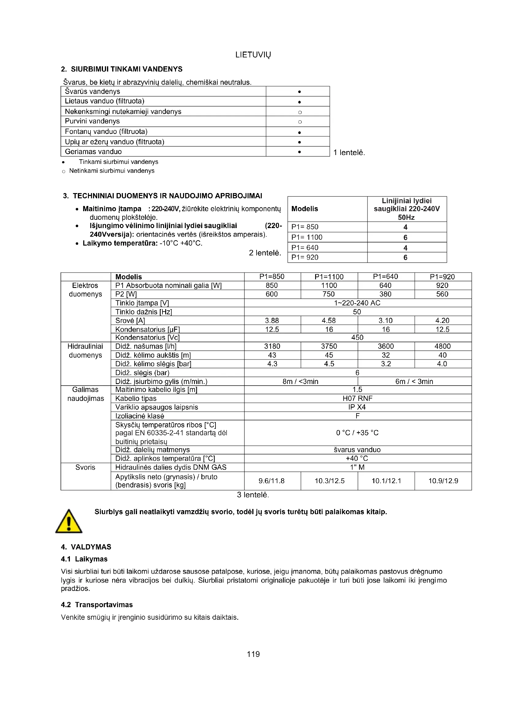 Tinklo įtampa turi atitikti įtampą nurodytą ant gamyklinės variklio duomenų plokštelės. Variklis privalo būti įžemintas. Vadovaukitės techninių duomenų lentelėje ir šio vadovo 3 lentelėje pateiktais parametrais. Siurblio maitinimo kabelio ilgis riboja įrengimo atstumą, jeigu reiktų ilgintuvo, įsitikinkite, kad jis yra tokio paties tipo (pvz., H05 RN-F arba H07 RN-F, priklausomai nuo įrengimo), žr. 3 lentelę.