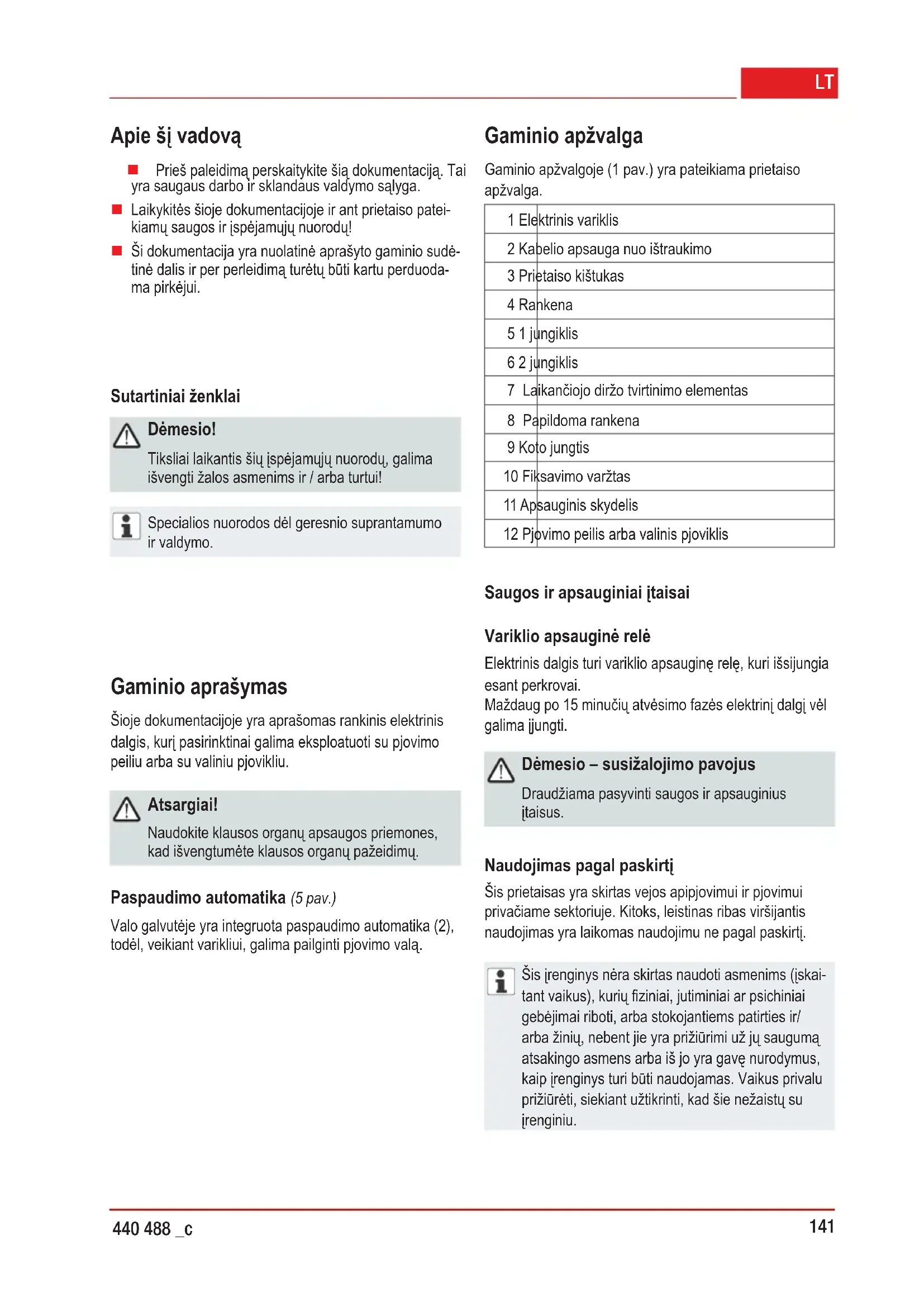 440 488 _c Apie šį vadovą Priešpaleidimąperskaitykitešiądokumentaciją.Tai yrasaugausdarboirsklandausvaldymosąlyga. Laikykitėsšiojedokumentacijojeirantprietaisopatei- kiamųsaugosirįspėjamųjųnuorodų! Šidokumentacijayranuolatinėaprašytogaminiosudė- tinėdalisirperperleidimąturėtųbūtikartuperduoda- mapirkėjui. Sutartiniai ženklai Dėmesio! Tiksliailaikantisšiųįspėjamųjųnuorodų,galima išvengtižalosasmenimsir/arbaturtui! Specialiosnuorodosdėlgeresniosuprantamumo ir valdymo. Gaminio aprašymas Šioje dokumentacijoje yra aprašomas rankinis elektrinis dalgis,kurįpasirinktinaigalimaeksploatuotisupjovimo peiliu arba su valiniu pjovikliu. Atsargiai! Naudokiteklausosorganųapsaugospriemones, kadišvengtumėteklausosorganųpažeidimų. Paspaudimo automatika (5 pav.) Valogalvutėjeyraintegruotapaspaudimoautomatika(2), todėl,veikiantvarikliui,galimapailgintipjovimovalą. Gaminio apžvalga Gaminioapžvalgoje(1pav.)yrapateikiamaprietaiso apžvalga. 1 Elektrinis variklis 2 Kabelio apsauga nuo ištraukimo 3 Prietaiso kištukas 4 Rankena 5 1 jungiklis 6 2 jungiklis 7 Laikančiojodiržotvirtinimoelementas 8 Papildoma rankena 9 Koto jungtis 10 Fiksavimovaržtas 11 Apsauginis skydelis 12 Pjovimo peilis arba valinis pjoviklis Saugos ir apsauginiai įtaisai Variklio apsauginė relė Elektrinisdalgisturivariklioapsauginęrelę,kuriišsijungia esant perkrovai. Maždaugpo15minučiųatvėsimofazėselektrinįdalgįvėl galimaįjungti. Dėmesio – susižalojimo pavojus Draudžiamapasyvintisaugosirapsauginius įtaisus. Naudojimas pagal paskirtį Šis prietaisas yra skirtas vejos apipjovimui ir pjovimui privačiamesektoriuje.Kitoks,leistinasribasviršijantis naudojimasyralaikomasnaudojimunepagalpaskirtį. Šisįrenginysnėraskirtasnaudotiasmenims(įskai- tantvaikus),kuriųziniai,jutiminiaiarpsichiniai gebėjimairiboti,arbastokojantiemspatirtiesir/ arbažinių,nebentjieyraprižiūrimiužjųsaugumą atsakingoasmensarbaišjoyragavęnurodymus, kaipįrenginysturibūtinaudojamas.Vaikusprivalu prižiūrėti,siekiantužtikrinti,kadšienežaistųsu įrenginiu.142 Originali eksploatacijos instrukcija Dėmesio! Prietaisądraudžiamaeksploatuotikomerciniais tikslais. Ant prietaiso esančių simbolių reikšmė Dėmesio! Skaitykitenaudojimoinstrukciją Naudokite apsauginius akinius, klausos organųapsaugospriemones Mūvėkiteapsauginespirštines Avėkiteapsauginiusbatus Neprileiskitežmonių.Saugosatstumas bent 10 m Pavojusdėlišsviedžiamųdaiktų Nedelsdamiatjunkitekištukąnuotinklo, jeiilginamasiskabelisbuvopažeistas arbatrūko! Saugokiteprietaisąnuolietausir šlapumo Atstumastarpprietaisoirpašalinių asmenųturibūtibent15m Saugos nuorodos Dėmesio! Pjovimoįrankiosukimasis,išjungusvariklį,dar tęsiasi! Priešnaudojimąpatikrinkite,artinklokabeliaiirilgintu- vaineturipažeidimųarbasenėjimopožymių. Ilgintuvuslaikykiteatokiainuopjovimoįrankių. Jeinaudojimometubūtųpažeistaslaidas,jįnedelsda- mi atjunkite nuo tinklo.