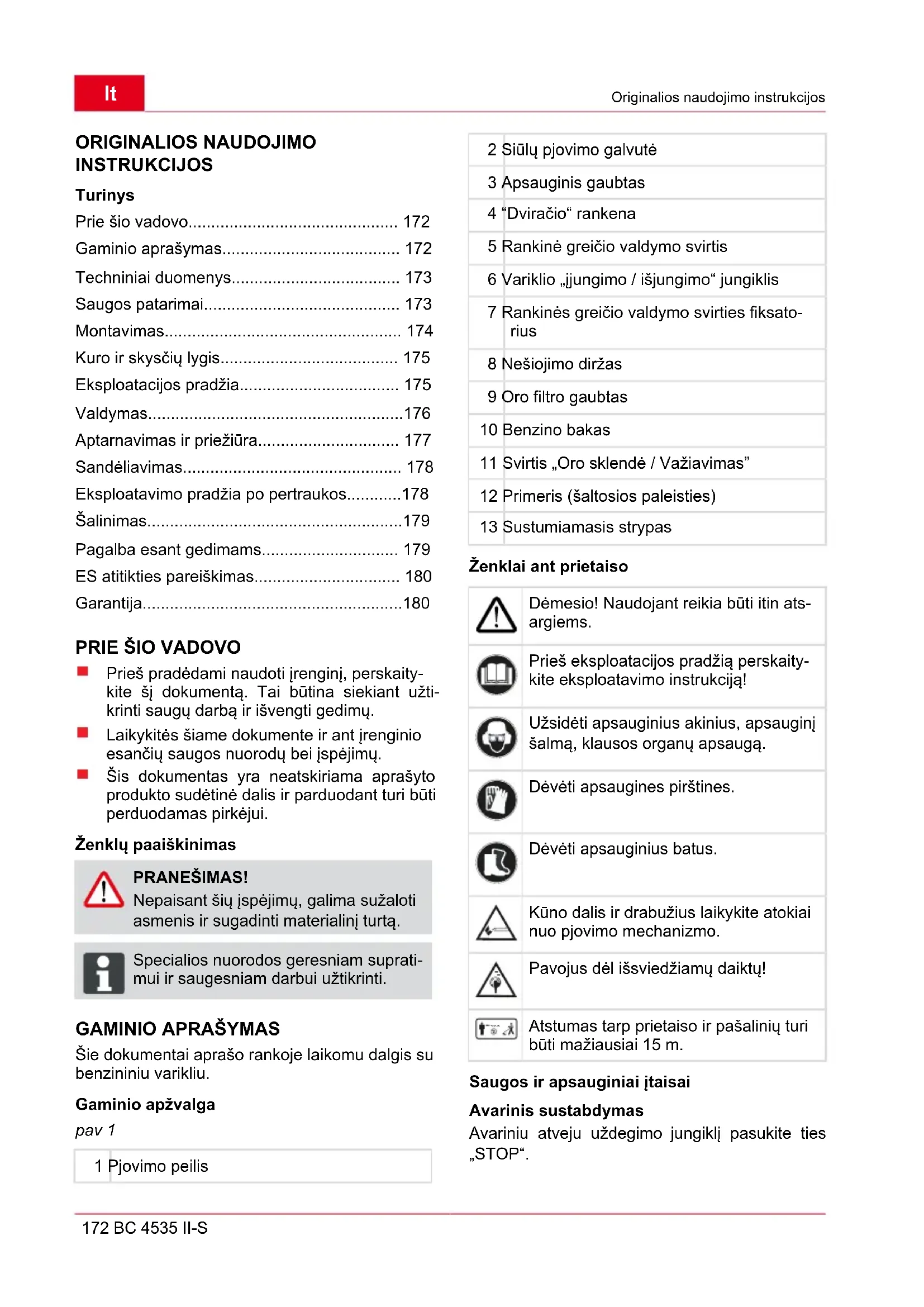 Šie dokumentai aprašo rankoje laikomu dalgis su benzininiu varikliu. Gaminio apžvalga pav 1 1 Pjovimo peilis 2 Siūlų pjovimo galvutė 3 Apsauginis gaubtas 4 “Dviračio“ rankena 5 Rankinė greičio valdymo svirtis 6 Variklio „įjungimo / išjungimo“ jungiklis 7 Rankinės greičio valdymo svirties fiksato- rius 8 Nešiojimo diržas 9 Oro filtro gaubtas 10 Benzino bakas 11 Svirtis „Oro sklendė / Važiavimas” 12 Primeris (šaltosios paleisties) 13 Sustumiamasis strypas Ženklai ant prietaiso Dėmesio! Naudojant reikia būti itin ats- argiems. Prieš eksploatacijos pradžią perskaity- kite eksploatavimo instrukciją! Užsidėti apsauginius akinius, apsauginį šalmą, klausos organų apsaugą. Dėvėti apsaugines pirštines. Dėvėti apsauginius batus. Kūno dalis ir drabužius laikykite atokiai nuo pjovimo mechanizmo. Pavojus dėl išsviedžiamų daiktų! 15m(50ft) Atstumas tarp prietaiso ir pašalinių turi būti mažiausiai 15 m. Saugos ir apsauginiai įtaisai Avarinis sustabdymas Avariniu atveju uždegimo jungiklį pasukite ties „STOP“.Gaminio aprašymas 440 247_a 173 Apsauginis skydas nuo akmenų Naudotoją saugo nuo išsviedžiamų daiktų. Inte- gruotas peilis pjovimo siūlą patrumpina iki leistino ilgio. PRANEŠIMAS! Pavojus susižeisti! Negalima montuoti saugos ir apsauginių įrenginių, spaudžiant juos per jėgą. Sustumiamasis strypas Naudojant sustumiamąjį strypą lengva surinkti variklinį dalgį, išimti baigus pjauti, o laikant jis neužima daug vietos. Naudojimas pagal paskirtį Prietaisas skirtas pjauti vejos plotus privačiose valdose. Kitoks naudojimas nei čia nurodytas yra naudojimas ne pagal paskirtį. Galimi netinkamo naudojimo atvejai PRANEŠIMAS! Draudžiama naudoti prietaisą komerci- niais tikslais. TECHNINIAI DUOMENYS BC 4535 II Variklio tipas 2-taktis, oru aušina- mas Cilindro darbinis tūris 42,7 cm³ Galia 1,1 kW Sausoji masė 7,6 kg Darbinė masė be ben- zino 9,0 kg Degalų bako talpa 1,1 l Uždegimo sistema elektroninė Uždegimo žvakė L8RTC Pavara Išcentrinė sankaba Rankena „Dviračio” rankena Garso galios lygis 113 dB ± LpA 3 bdB Garso slėgio lygis 102 dB Vibracija ≤ 15 m/s