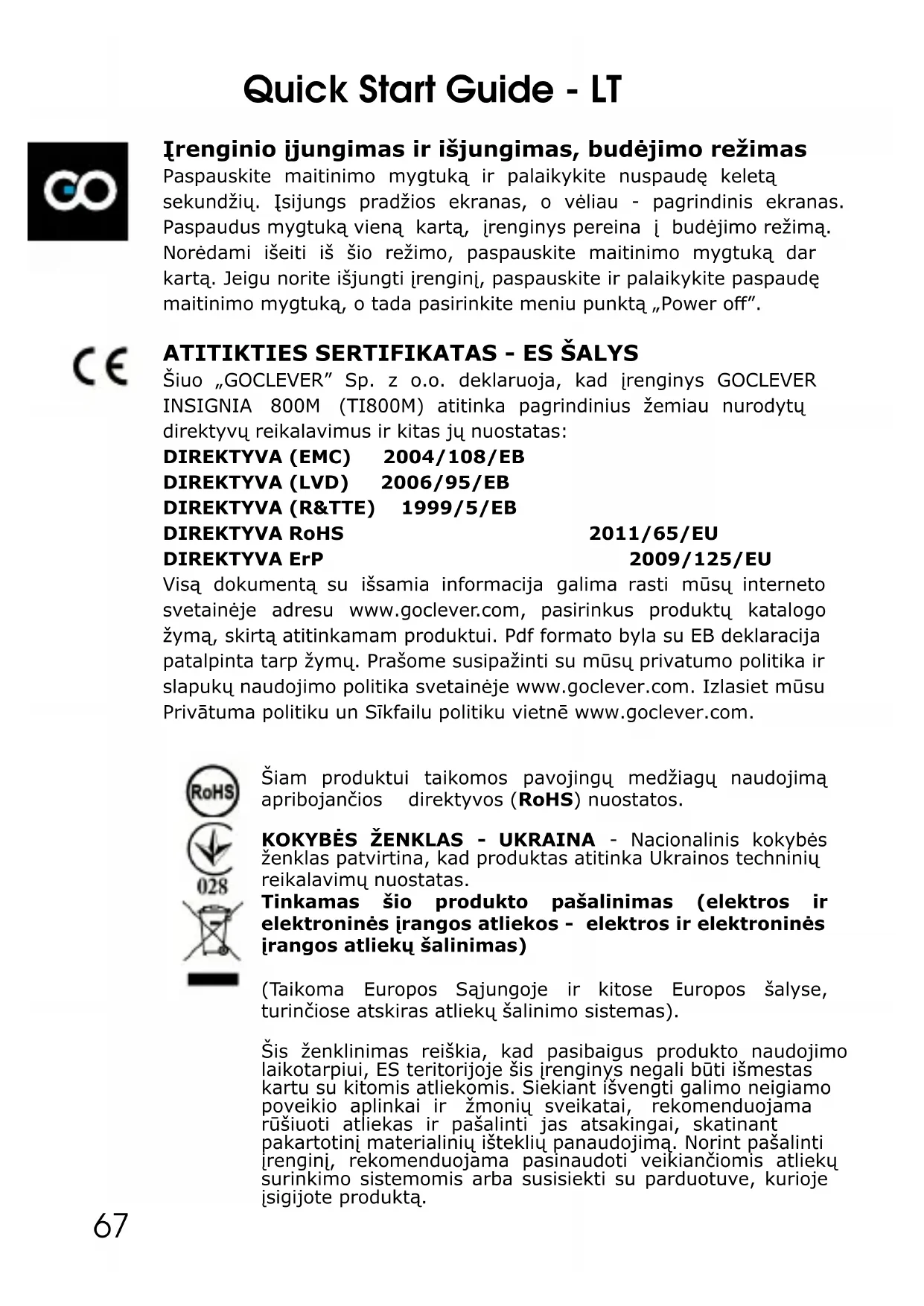 Šiuo „GOCLEVER” Sp. z o.o. deklaruoja, kad įrenginys GOCLEVER INSIGNIA 800M (TI800M) atitinka pagrindinius žemiau nurodytų direktyvų reikalavimus ir kitas jų nuostatas: