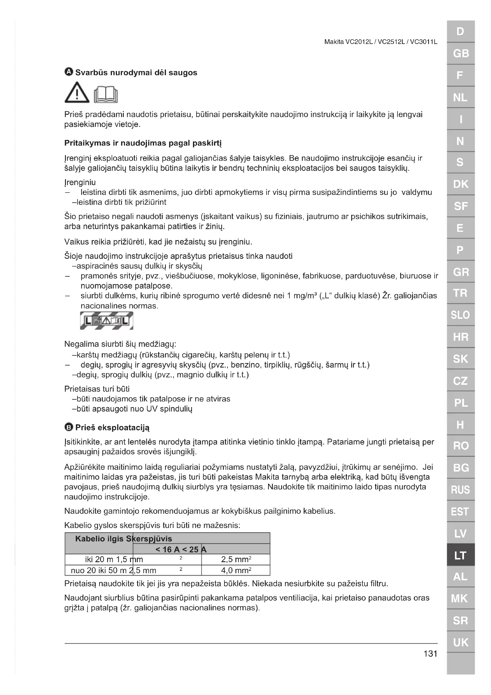 NAUDOJIMO INSTRUKCIJA VC2512L MAKITA