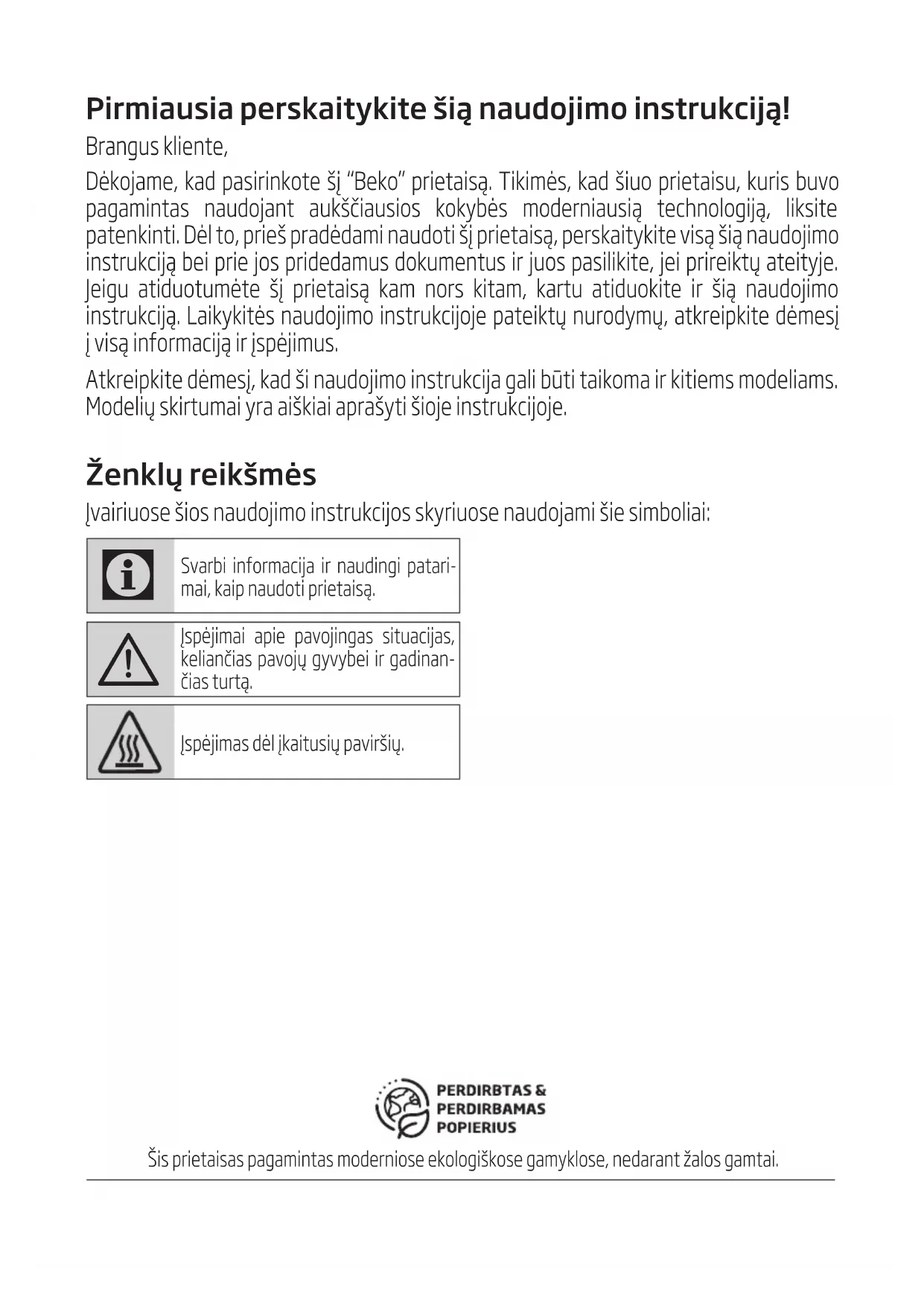 ir atitarnavusio gaminio sutvarkymas: Šis gaminys atitinka ES EEĮA direktyvą (2012/19/ES). Šis gaminys žymimas elektros ir elektroninės įrangos atliekų (EEĮA) simboliu.Šis simbolis reiškia, kad, kai produktas tampa nebenaudojamas, jo negalima šalinti kartu su kitomis buitinėmis atli-ekomis. Panaudotą prietaisą būtina pristatyti į elektros ir elektroninių prietaisų surinkimo ir perdirbimo punktą. Norėdami sužinoti, apie surinkimo ir perdirbimo punktus - susisiekite su vietos institucijomis arba pardavėju. Kiekvienas atliekame svarbų vaidmenį saugodami gamtą ir perdirbdami senus buitinius prietaisus. Atitinkamas panaudotų buitinių prietaisų šalinimas padeda išvengti neigiamos žalos gamtai ir žmogaus sveikatai.