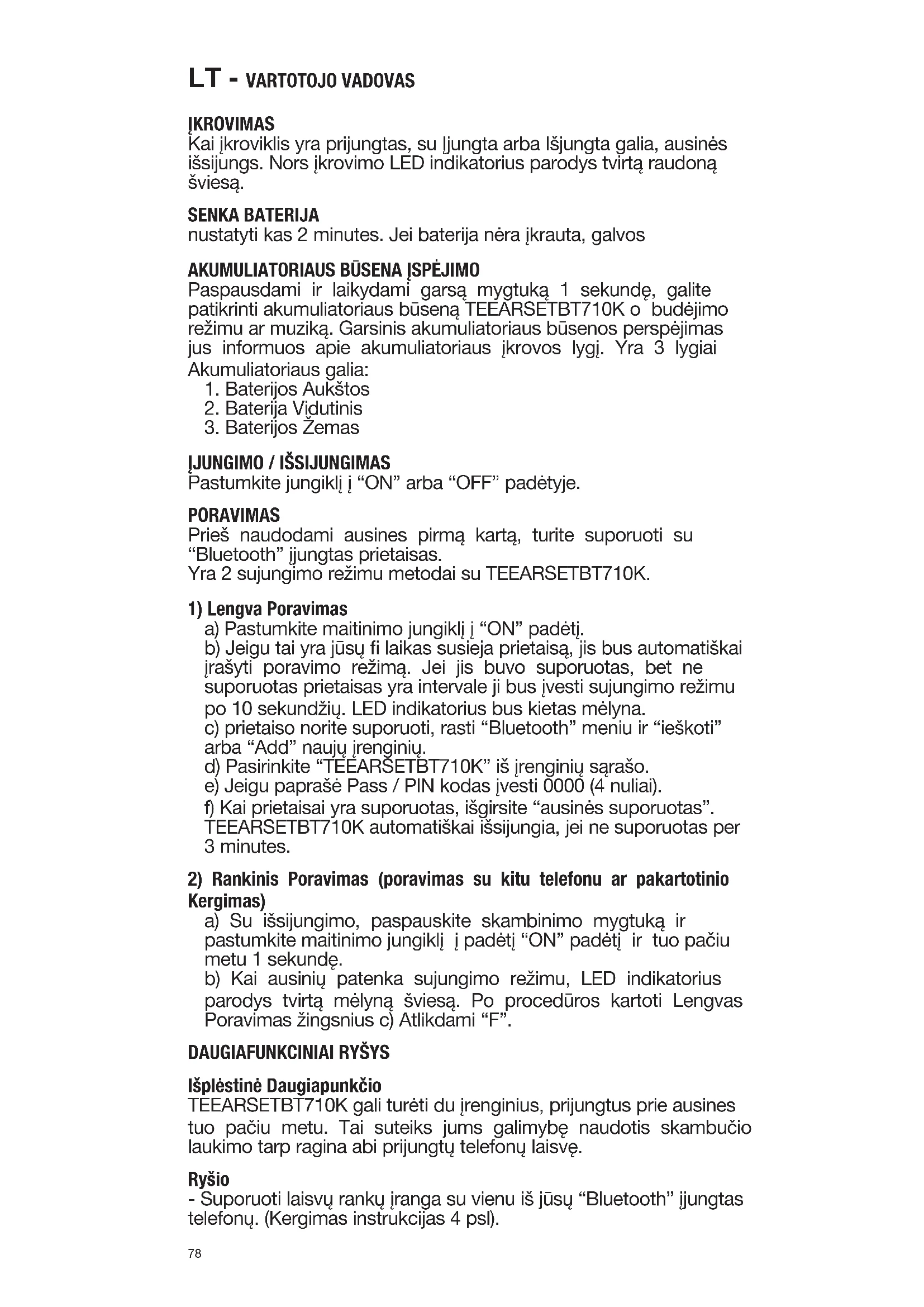 Pastumkite jungiklį į “ON” arba “OFF” padėtyje. PORAVIMAS Prieš naudodami ausines pirmą kartą, turite suporuoti su “Bluetooth” įjungtas prietaisas. Yra 2 sujungimo režimu metodai su TEEARSETBT710K.