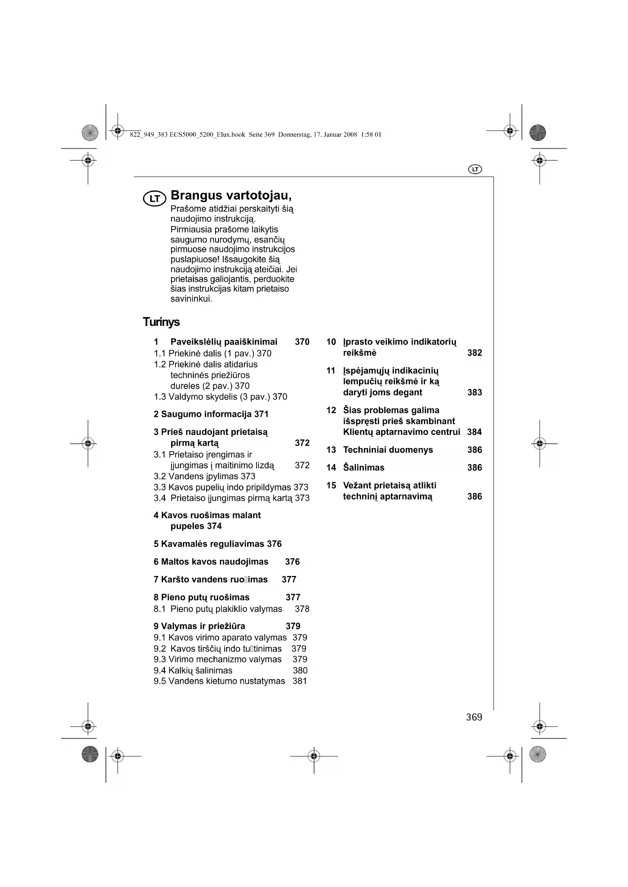 10 Įprasto veikimo indikatorių reikšmė 382 11 Įspėjamųjų indikacinių lempučių reikšmė ir ką daryti joms degant 38312 Šias problemas galima išspręsti prieš skambinant Klientų aptarnavimo centrui 38413 Techniniai duomenys 38614 Šalinimas 386 15 Vežant prietaisą atlikti techninį aptarnavimą 386 822_949_383 ECS5000_5200_Elux.book Seite 369 Donnerstag, 17. Januar 2008 1:58 01