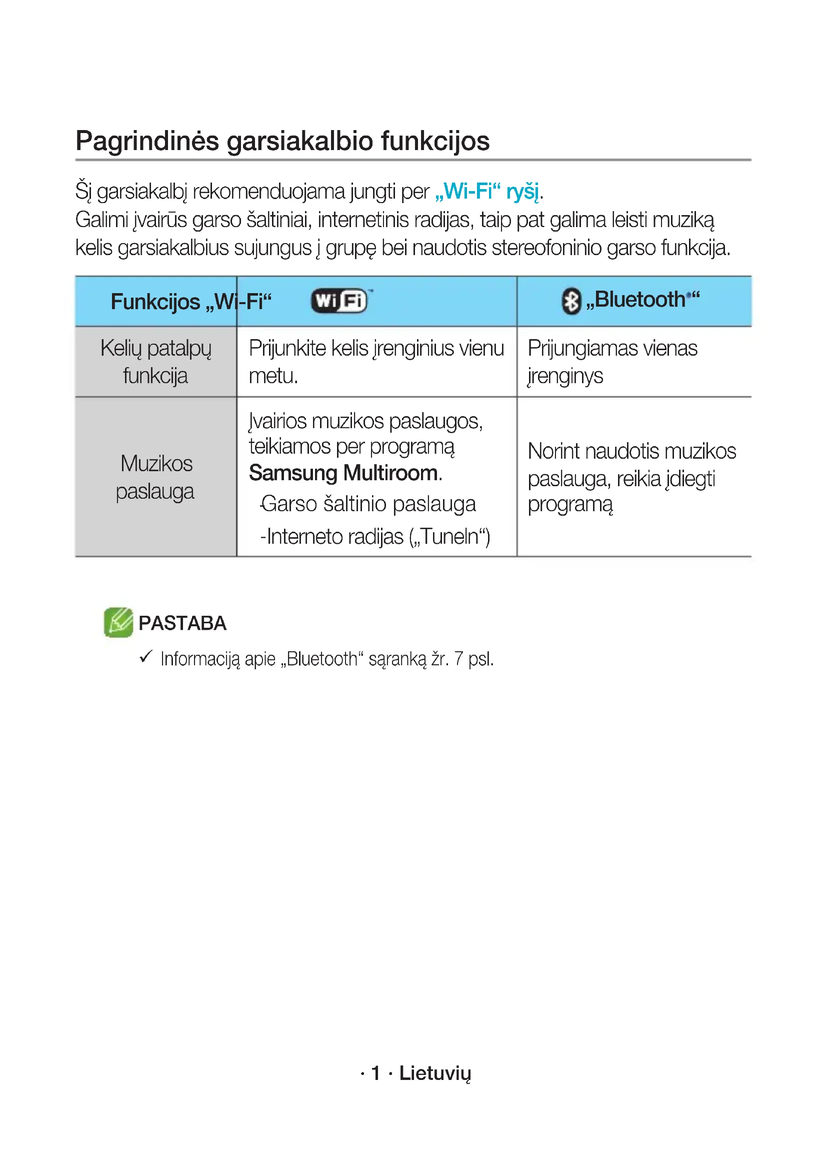 Ja savienojumu neizdodas izveidot, skatiet sadaļu “Pārbaudes punktu saraksts pirms savienojuma izveides” 9. un 10. lpp. WAM3501-EN_15p-LAT-QSG-0901.indd 15 2016-09-01 4:57:08· 1 · Lietuvių Pagrindinės garsiakalbio funkcijos Šį garsiakalbį rekomenduojama jungti per „Wi-Fi“ ryšį. Galimi įvairūs garso šaltiniai, internetinis radijas, taip pat galima leisti muziką kelis garsiakalbius sujungus į grupę bei naudotis stereofoninio garso funkcija. Funkcijos „Wi-Fi“ „Bluetooth