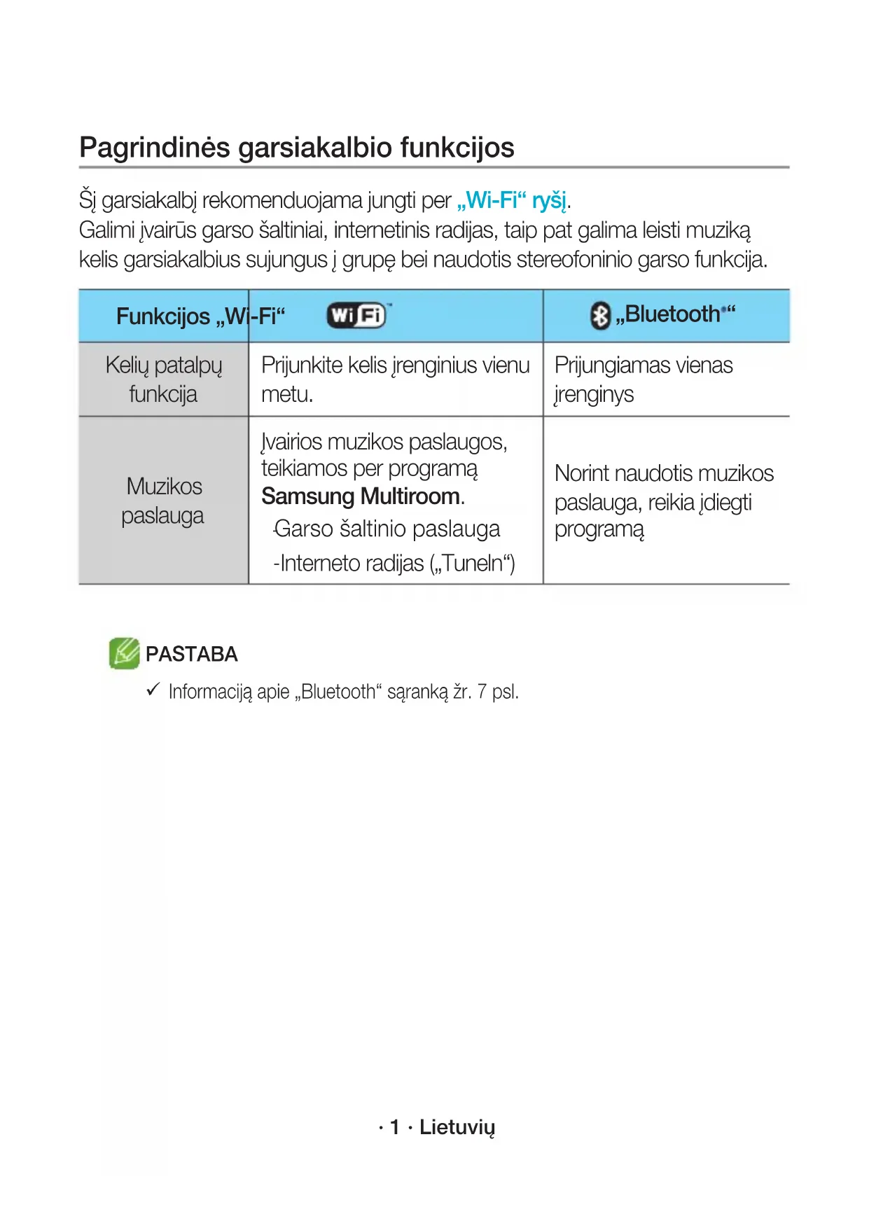 Ja savienojumu neizdodas izveidot, skatiet sadaļu “Pārbaudes punktu saraksts pirms savienojuma izveides” 9. un 10. lpp. WAM1501-EN_15p-LAT-QSG-0901.indd 15 2016-09-01 5:07:28· 1 · Lietuvių Pagrindinės garsiakalbio funkcijos Šį garsiakalbį rekomenduojama jungti per „Wi-Fi“ ryšį. Galimi įvairūs garso šaltiniai, internetinis radijas, taip pat galima leisti muziką kelis garsiakalbius sujungus į grupę bei naudotis stereofoninio garso funkcija. Funkcijos „Wi-Fi“ „Bluetooth