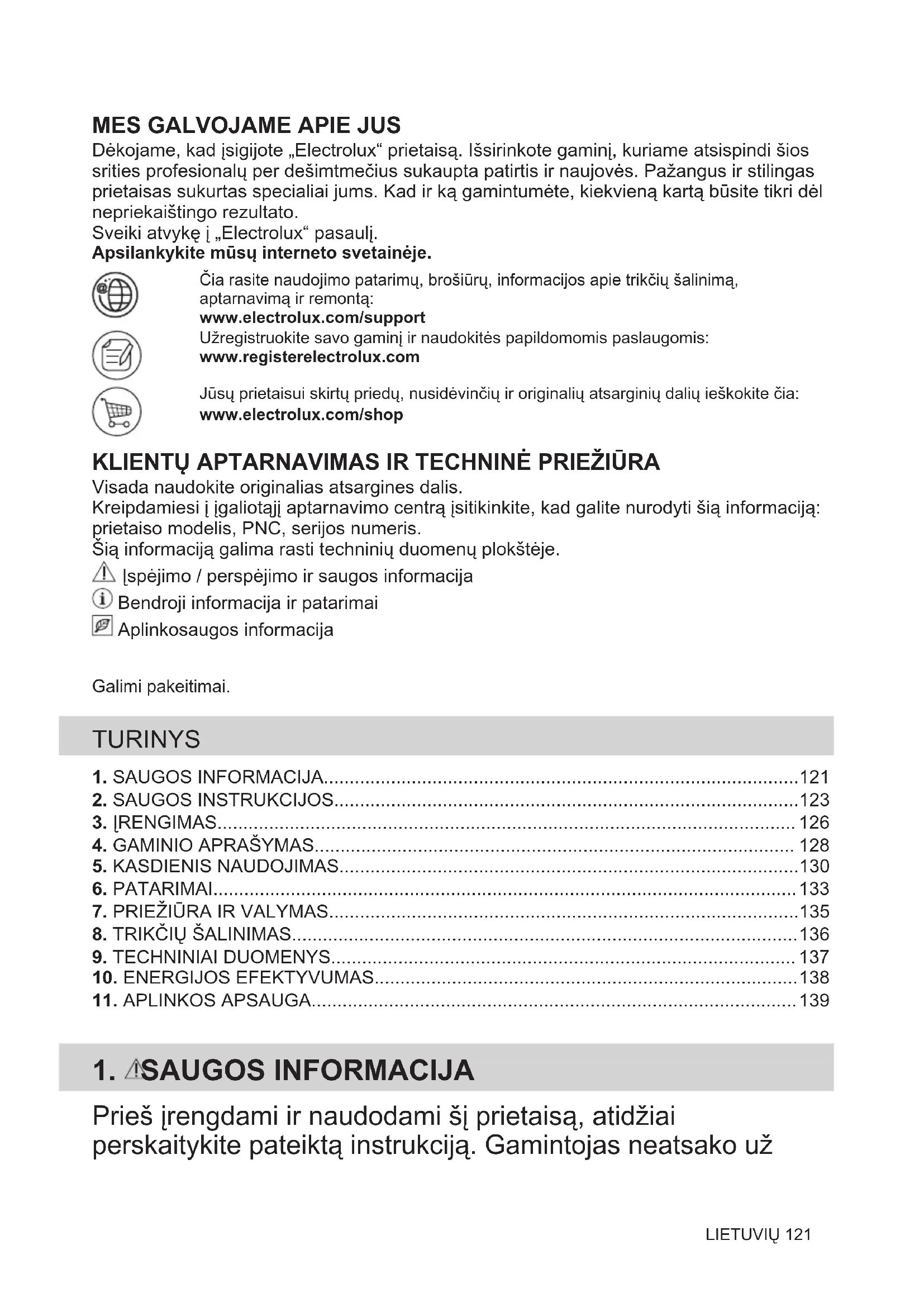 Dėkojame, kad įsigijote „Electrolux“ prietaisą. Išsirinkote gaminį, kuriame atsispindi šios srities profesionalų per dešimtmečius sukaupta patirtis ir naujovės. Pažangus ir stilingas prietaisas sukurtas specialiai jums. Kad ir ką gamintumėte, kiekvieną kartą būsite tikri dėl nepriekaištingo rezultato. Sveiki atvykę į „Electrolux“ pasaulį. Apsilankykite mūsų interneto svetainėje.Čia rasite naudojimo patarimų, brošiūrų, informacijos apie trikčių šalinimą,aptarnavimą ir remontą:www.electrolux.com/supportUžregistruokite savo gaminį ir naudokitės papildomomis paslaugomis:www.registerelectrolux.comJūsų prietaisui skirtų priedų, nusidėvinčių ir originalių atsarginių dalių ieškokite čia:www.electrolux.com/shop KLIENTŲ APTARNAVIMAS IR TECHNINĖ PRIEŽIŪRA Visada naudokite originalias atsargines dalis. Kreipdamiesi į įgaliotąjį aptarnavimo centrą įsitikinkite, kad galite nurodyti šią informaciją: prietaiso modelis, PNC, serijos numeris. Šią informaciją galima rasti techninių duomenų plokštėje. Įspėjimo / perspėjimo ir saugos informacija Bendroji informacija ir patarimai Aplinkosaugos informacija Galimi pakeitimai. TURINYS