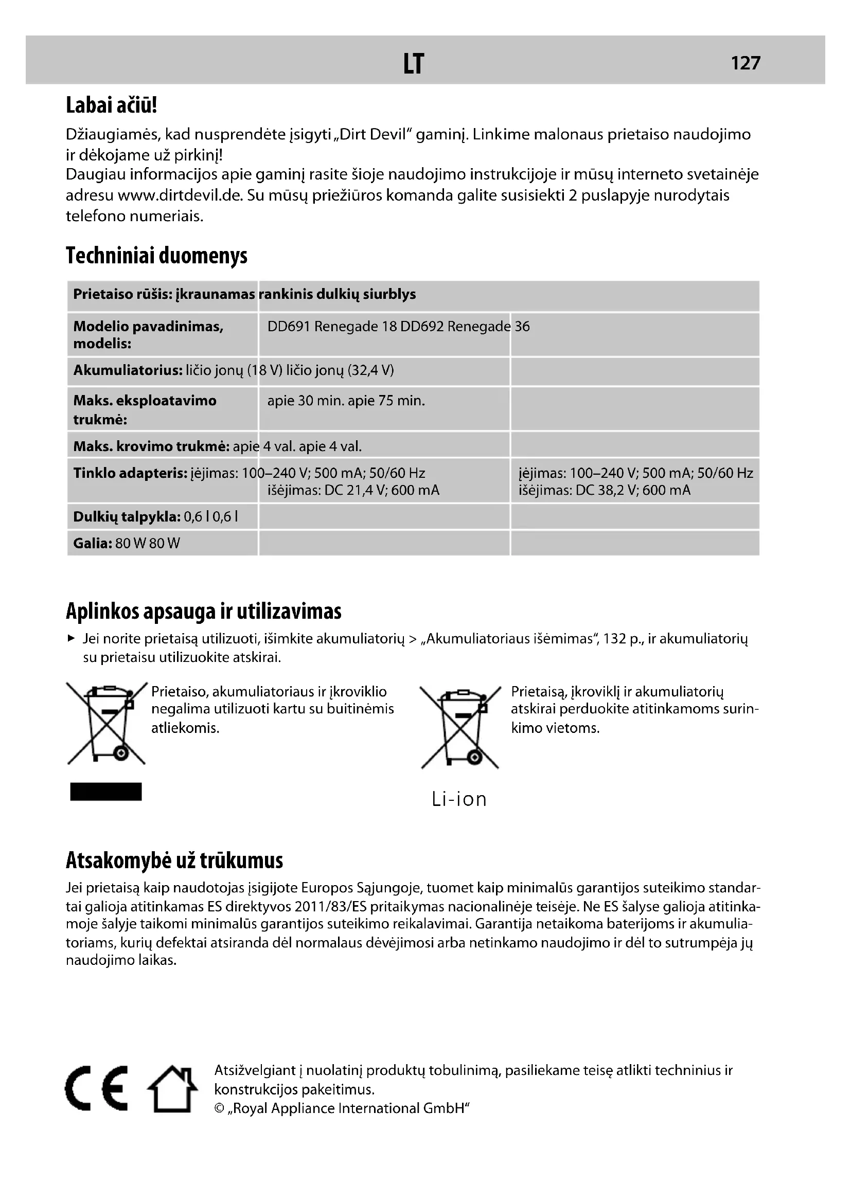 Jei norite prietaisą utilizuoti, išimkite akumuliatorių > „Akumuliatoriaus išėmimas“, 132 p., ir akumuliatorių su prietaisu utilizuokite atskirai.Prietaiso, akumuliatoriaus ir įkroviklio negalima utilizuoti kartu su buitinėmis atliekomis.Prietaisą, įkroviklį ir akumuliatorių atskirai perduokite atitinkamoms surin-kimo vietoms. Atsakomybė už trūkumus Jei prietaisą kaip naudotojas įsigijote Europos Sąjungoje, tuomet kaip minimalūs garantijos suteikimo standar- tai galioja atitinkamas ES direktyvos 2011/83/ES pritaikymas nacionalinėje teisėje. Ne ES šalyse galioja atitinka- moje šalyje taikomi minimalūs garantijos suteikimo reikalavimai. Garantija netaikoma baterijoms ir akumulia- toriams, kurių defektai atsiranda dėl normalaus dėvėjimosi arba netinkamo naudojimo ir dėl to sutrumpėja jų naudojimo laikas. Li-ion Atsižvelgiant į nuolatinį produktų tobulinimą, pasiliekame teisę atlikti techninius ir konstrukcijos pakeitimus.© „Royal Appliance International GmbH“ Techniniai duomenys Prietaiso rūšis: įkraunamas rankinis dulkių siurblysModelio pavadinimas, modelis:DD691 Renegade 18 DD692 Renegade 36Akumuliatorius: ličio jonų (18 V) ličio jonų (32,4 V)Maks. eksploatavimo trukmė:apie 30 min. apie 75 min.Maks. krovimo trukmė: apie 4 val. apie 4 val.Tinklo adapteris: įėjimas: 100–240 V; 500 mA; 50/60 Hzišėjimas: DC 21,4 V; 600 mAįėjimas: 100–240 V; 500 mA; 50/60 Hzišėjimas: DC 38,2 V; 600 mADulkių talpykla: 0,6 l 0,6 lGalia: 80 W 80 W Labai ačiū! Džiaugiamės, kad nusprendėte įsigyti „Dirt Devil“ gaminį. Linkime malonaus prietaiso naudojimo ir dėkojame už pirkinį! Daugiau informacijos apie gaminį rasite šioje naudojimo instrukcijoje ir mūsų interneto svetainėje adresu www.dirtdevil.de. Su mūsų priežiūros komanda galite susisiekti 2 puslapyje nurodytais telefono numeriais.LT