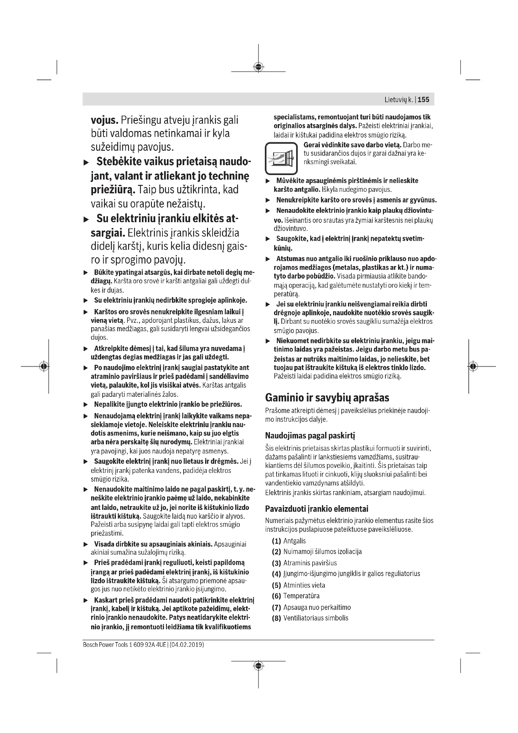 50 150 – Ruošinio vėsinimas – Dažų džiovinimas 1 250 350 Plastikinių vamzdžių formavi- mas 2 350 400 Plastiko suvirinimas 3 450 500 Lako šalinimas 4 550 400 Minkštasis litavimas A) ekrane nerodoma Norėdami iškviesti derinį, pakartotinai spauskite atminties mygtuką(11), kol rodmenyje(5) atsiras pageidaujamas nu- meris. Individualaus derinio išsaugojimas: – Paspaudę atminties mygtuką(11), pasirinkite pageidau- jamą atminties vietą. Bosch Power Tools 1 609 92A 4UE | (04.02.2019)158 | Lietuvių k. – Nustatykite pageidaujamą temperatūrą ir oro kiekį. At- minties vieta(5) mirksi ir tokiu būdu rodo, kad buvo pa- keistas išsaugotas derinys. – Paspauskite atminties mygtuką(11) ir laikykite jį pa- spaustą. Atminties vieta(5) apie 2sekundes mirksi. Kai ji pradeda šviesti nuolat, naujas derinys yra išsaugotas. Darbo patarimai u Prieš atliekant bet kokius elektrinio įrankio reguliavi- mo ar priežiūros darbus reikia ištraukti kištuką iš elektros tinklo lizdo. Nuoroda: nepriartinkite antgalio(1) per daug arti prie apdir- bamo ruošinio. Susikaupęs karštas oras gali sukelti elektrinio prietaiso perkaitimą. Apsauginio nuo karščio gaubto nuėmimas Norėdami atlikti darbus sunkiai prieinamose vietose, sukda- mi galite nuimti apsauginį nuo karščio gaubtą(2). u Saugokitės karšto antgalio! Kai dirbama be apsauginio nuo karščio gaubto, gresia didesnis nudegimo pavojus. Nuimant arba uždedant apsauginį nuo karščio gaubtą(2), prietaisas turi būti išjungtas ir atvėsęs. Kad elektrinis įrankis greičiau atvėstų, trumpam leiskite jam veikti nustatę žemiausią temperatūrą. Prietaiso pastatymas Norėdami palikti elektrinį įrankį atvėsti arba kad galėtumėte dirbti abiem rankom, padėkite jį ant atraminio pavi- ršiaus(3). u Ypač atsargiai dirbkite su pastatytu įrankiu! Karšta tūta ir karšto oro srautas kelia nudegimo pavojų. Elektrinį įrankį pastatykite ant lygaus, stabilaus pagrindo. Įsi- tikinkite, kad jis nenuvirs. Apsaugokite ne darbo zonoje esantį kabelį, kad jis nenuverstų ir nentemptų elektrinio įra- nkio. Jei elektrinio įrankio ketinate nenaudoti ilgesnį laiką, jį išjun- kite ir ištraukite kištuką. Darbo pavyzdžiai (žr.A–Gpav.) Darbo pavyzdžių paveikslus rasite schemų puslapiuose. Atstumas nuo antgalio iki ruošinio priklauso nuo apdoroja- mos medžiagos (metalas, plastikas ar kt.) ir numatyto darbo pobūdžio. Optimali temperatūra konkrečiu atveju nustatoma praktiniais bandymais. Visada pirmiausia atlikite bandomąją operaciją, kad galėtu- mėte nustatyti oro kiekį ir temperatūrą. Pradėkite didesniu atstumu ir žemesne galios pakopa. Tada pagal poreikį pride- rinkite atstumą ir galios pakopą. Jei nesate įsitikinę, kokią medžiagą apdorojate arba koks bus karšto oro poveikis medžiagai, patikrinkite poveikį ne- matomoje vietoje. Visais pavyzdžiuose nurodytais atvejais, išskyrus „Dažų pa- šalinimas nuo lango rėmo“, prietaisą galima naudoti ir be pa- pildomos įrangos. Tačiau siūlomų papildomų antgalių naudo- jimas palengvina darbą ir iš esmės pagerina darbo kokybę. u Būkite atsargūs keisdami antgalį! Nelieskite karšto antgalio. Palaukite, kol elektrinis įrankis atvės, ir keis- dami mūvėkite apsauginėmis pirštinėmis. Prisilietę prie karšto antgalio, galite nudegti. Kad elektrinis įrankis greičiau atvėstų, trumpam leiskite jam veikti nustatę žemiausią temperatūrą. Lako pašalinimas, klijų ištirpinimas (žr.Apav.) Uždėkite platųjį antgalį(14) (papildoma įranga). Karštu oru šiek tiek suminkštinkite laką ir švaria mentele jį atkelkite. Il- gai veikiant karščiui lakas apdega ir tada jį pašalinti sunkiau. Daugelis klijų nuo karščio suminkštėja. Pašildę klijus galite atskirti sujungtas jungtis arba pašalinti klijų perteklių. Dažų pašalinimas nuo lango rėmo (žr.Bpav.) u Būtinai uždėkite stiklą apsaugantį antgalį (15) (papil- doma įranga). Gresia stiklo trūkimo pavojus. Dažus nuo profiliuotų paviršių galima pakelti tinkamu gran- dikliu, po to nuvalykite minkštu vieliniu šepečiu. Užšalusių vandentiekio vamzdžių atšildymas (žr.Cpav.) u Prieš pradėdami atšildymą patikrinkite, ar tikrai pasi- rinkote vandentiekio vamzdžius. Vandentiekio vamz- džiai dažnai iš išorės nesiskiria nuo dujų vamzdžių. Jokiu būdu nekaitinkite dujų vamzdžių. Uždėkite kampinį antgalį(16) (papildoma įranga). Užšalu- sias vietas pašildykite pradėdami nuo išleidimo, laikydamiesi įleidimo krypties. Ypač atsargiai kaitinkite plastikinius vamzdžius bei vamzdžių jungtis, kad išvengtumėte pažeidimų. Plastikinių vamzdžių formavimas (žr.Dpav.) Uždėkite reflektorinį antgalį(17) (papildoma įranga). Pla- stikinius vamzdžius pripildykite smėlio ir abiejose pusėse uždarykite, kad apsaugotumėte nuo vamzdžio sulenkimo. Vamzdį šildykite atsargiai ir tolygiai, judindami įrankį į vieną ir į kitą pusę. Plastiko suvirinimas (žr.Epav.) Uždėkite redukcinį antgalį(20) ir suvirinimo antgalį(19) (prietaiso priedai). Suvirinami ruošiniai ir suvirinimo vie- la(18) (prietaiso priedas) turi būti iš vienodos medžiagos (pvz., PVC ir PVC). Suvirinimo vieta turi būti švari ir nesutep- ta alyva arba tepalu. Suvirinimo siūlės vietą įkaitinkite tiek, kad medžiaga būtų plastiška. Atkreipkite dėmesį į tai, kad plastiko plastiškos ir skystos būsenų temperatūrų skirtumas yra nedidelis. Priglauskite suvirinimo vielą(18) ir leiskite jai sutekėti į tar- pelį, kad susidarytų tolygi suvirinimo siūlė. Minkštasis litavimas (žr.Fpav.) Taškiniam litavimui uždėkite redukcinį antgalį(20), vamz- džiams lituoti uždėkite reflektorinį antgalį(17) (abu antgaliai yra papildoma įranga). Jei lydmetalį naudojate be fliusų, ant lituojamos vietos užte- pkite litavimo alyvos arba litavimo pastos. Lituojamą vietą, priklausomai nuo medžiagos, pašildykite apie 50–120se- kundžių.