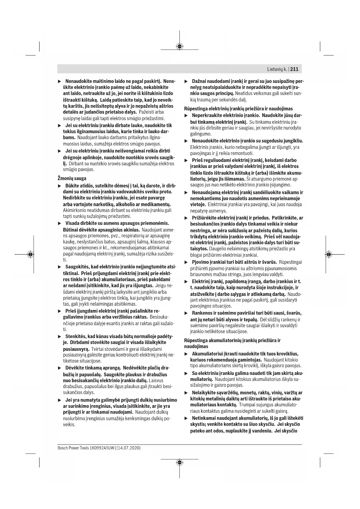 Šioje instrukcijoje pateiktas vibracijos lygis ir triukšmo emisi- ja buvo išmatuoti pagal standartizuotą matavimo metodą, ir juos galima naudoti elektriniams įrankiams palyginti. Jie taip pat skirti vibracijos ir triukšmo emisijai iš anksto įvertinti. Nurodytas vibracijos lygis ir triukšmo emisijos vertė atspindi pagrindinius elektrinio įrankio naudojimo atvejus. Tačiau jei- gu elektrinis įrankis naudojamas kitokiai paskirčiai, su kito- kiais darbo įrankiais arba jeigu jis nepakankamai techniškai prižiūrimas, vibracijos lygis ir triukšmo emisijos vertė gali ki- sti. Tokiu atveju vibracijos ir triukšmo emisija per visą darbo laikotarpį gali žymiai padidėti. Norint tiksliai įvertinti vibracijos ir triukšmo emisiją per tam tikrą darbo laiką, reikia atsižvelgti ir į laiką, per kurį elektrinis įrankis buvo išjungtas arba, nors ir veikė, bet nebuvo naudo- jamas. Tai įvertinus, vibracijos ir triukšmo emisija per visą darbo laiką žymiai sumažės. Dirbančiajam nuo vibracijos poveikio apsaugoti paskirkite papildomas apsaugos priemones, pvz.: elektrinių ir darbo įrankių techninę priežiūrą, rankų šildymą, darbo eigos orga- nizavimą. Montavimas u Prieš atliekant bet kokius elektrinio įrankio priežiūros darbus (atliekant techninę priežiūrą ar keičiant įrankį ir t. t.), o taip pat elektrinį įrankį transportuojant ir sandėliuojant, būtina iš jo išimti akumuliatorių. Priešingu atveju galite susižeisti, netyčia nuspaudę įjun- gimo-išjungimo jungiklį. Akumuliatoriaus įkrovimas u Naudokite tik techninių duomenų skyriuje nurodytus kroviklius. Tik šie krovikliai yra priderinti prie Jūsų elekt- riniame įrankyje naudojamo ličio jonų akumuliatoriaus. Nuoroda: akumuliatorius pristatomas iš dalies įkrautas. Kad akumuliatorius veiktų visa galia, prieš pirmąjį naudojimą aku- muliatorių kroviklyje visiškai įkraukite. Ličio jonų akumuliatorių galima įkrauti bet kada, eksploatavi- mo trukmė dėl to nesutrumpėja. Krovimo proceso nutrauki- mas akumuliatoriui nekenkia. Celių apsaugos sistema „Electronic Cell Protection (ECP)“ saugo ličio jonų akumuliatorių nuo visiškos iškrovos. Kai aku- muliatorius išsikrauna, apsauginis išjungiklis išjungia elektri- nį įrankį, ir darbo įrankis nebesisuka. u Jeigu elektrinis įrankis išsijungė automatiškai, neban- dykite vėl spausti įjungimo-išjungimo jungiklio. Taip galite sugadinti ličio jonų akumuliatorių. Laikykitės pateiktų šalinimo nurodymų. Akumuliatoriaus išėmimas Akumuliatoriuje (6) yra dvi fiksavimo pakopos, kurios saugo, kad netikėtai paspaudus akumuliatoriaus fiksavimo klavišą (7), akumuliatorius neiškristų. Į elektrinį prietaisą įstatytą akumuliatorių tinkamoje padėtyje palaiko spyruoklė. Norėdami išimti akumuliatorių(6), paspauskite atblokavimo klavišą(7)ir išimkite akumuliatorių iš elektrinio įrankio. Traukdami nenaudokite jėgos. Akumuliatoriaus įkrovos būklės indikatorius Žali akumuliatoriaus įkrovos būklės indikatoriairodo akumu- liatoriausįkrovos būklę. Dėl saugumo, įkrovos būklę galima pažiūrėti tik tada, kai elektrinis įrankis neveikia. Jei norite, kad būtų parodyta įkrovos būklė, paspauskite įkrovos būklės mygtuką arba . Tai galima ir tada, kai akumuliatorius yra išimtas. Jei paspaudus mygtuką nešviečia nei vienas šviesadiodis in- dikatorius, vadinasi akumuliatorius yra pažeistas ir jį reikia pakeisti. Nuoroda: akumuliatoriaus įkrovos būklė taip pat rodoma naudotojo sąsajoje Nuoroda: akumuliatoriaus įkrovos būklė taip pat rodoma naudotojo sąsajoje Būsenos indikatoriai. 160992A5UW | (14.07.2020) Bosch Power ToolsLietuvių k. | 215 Akumuliatoriaus tipas GBA 18V... LEDs Talpa Šviečia nuolat 3× žalias 60−100% Šviečia nuolat 2× žalias 30−60% Šviečia nuolat 1× žalias 5−30% Mirksi 1× žalias 0−5% Akumuliatoriaus tipas ProCORE18V... LEDs Talpa Šviečia nuolat 5× žalias 80−100% Šviečia nuolat 4× žalias 60−80% Šviečia nuolat 3× žalias 40−60 % Šviečia nuolat 2× žalias 20−40 % Šviečia nuolat 1× žalias 5−20 % Mirksi 1× žalias 0−5 % Įrankių keitimas u Prieš atliekant bet kokius elektrinio įrankio priežiūros darbus (atliekant techninę priežiūrą ar keičiant įrankį ir t. t.), o taip pat elektrinį įrankį transportuojant ir sandėliuojant, būtina iš jo išimti akumuliatorių. Priešingu atveju galite susižeisti, netyčia nuspaudę įjun- gimo-išjungimo jungiklį. u Reguliariai valykite elektrinio įrankio ventiliacines an- gas. Variklio ventiliatorius gali įtraukti dulkes į korpusą ir susikaupęs didelis kiekis metalo miltelių gali sukelti elekt- ros smūgio pavojų. Darbo įrankio įstatymas: GDR/GDX 18V-200 C (žr. A – B pav.) Patraukite užraktinę movą (2) į priekį, stumkite darbo įrankį iki atramos į įrankio laikiklį (1) ir vėl atleiskite užraktinę movą (2), kad darbo įrankis užsifiksuotų. Smūgiams atsparius suktuvo antgalius (17)galite įstatyti, naudodami universalų antgalių laikiklį su rutuliniu fiksatoriu- mi (16). Darbo įrankio įstatymas: GDX/GDS 18V-200 C (žr. B – C pav.) u Įstatydami darbo įrankį stebėkite, kad jis tvirtai įsi- statytų į įrankių įtvarą. Jei darbo įrankis nėra tvirtai įstatytas į įrankių įtvarą, sukimo operacijos metu jis gali atsilaisvinti. Užstumkite darbo įrankį (18) ant įrankių įtvaro (1) ketur- briaunio. Dėl sistemos ypatumų įrankių įtvare (1) įstatytas darbo įra- nkis (18) yra šiek tiek laisvas; tai nedaro jokios neigiamos įtakos veikimui ir saugumui. Kai kurių darbo įrankių (pvz., dvigubų antgalių) negalima saugiai įtvirtinti įrankių įtvare. Darbo įrankio išėmimas Patraukite užraktinę movą (2) į priekį ir išimkite darbo įrankį. Naudojimas Veikimo principas Į įrankių įtvarą (1) įstatytam darbo įrankiui sukamasis ir smūginis judesiai perduodami iš elektros variklio per pavarą ir smūgin