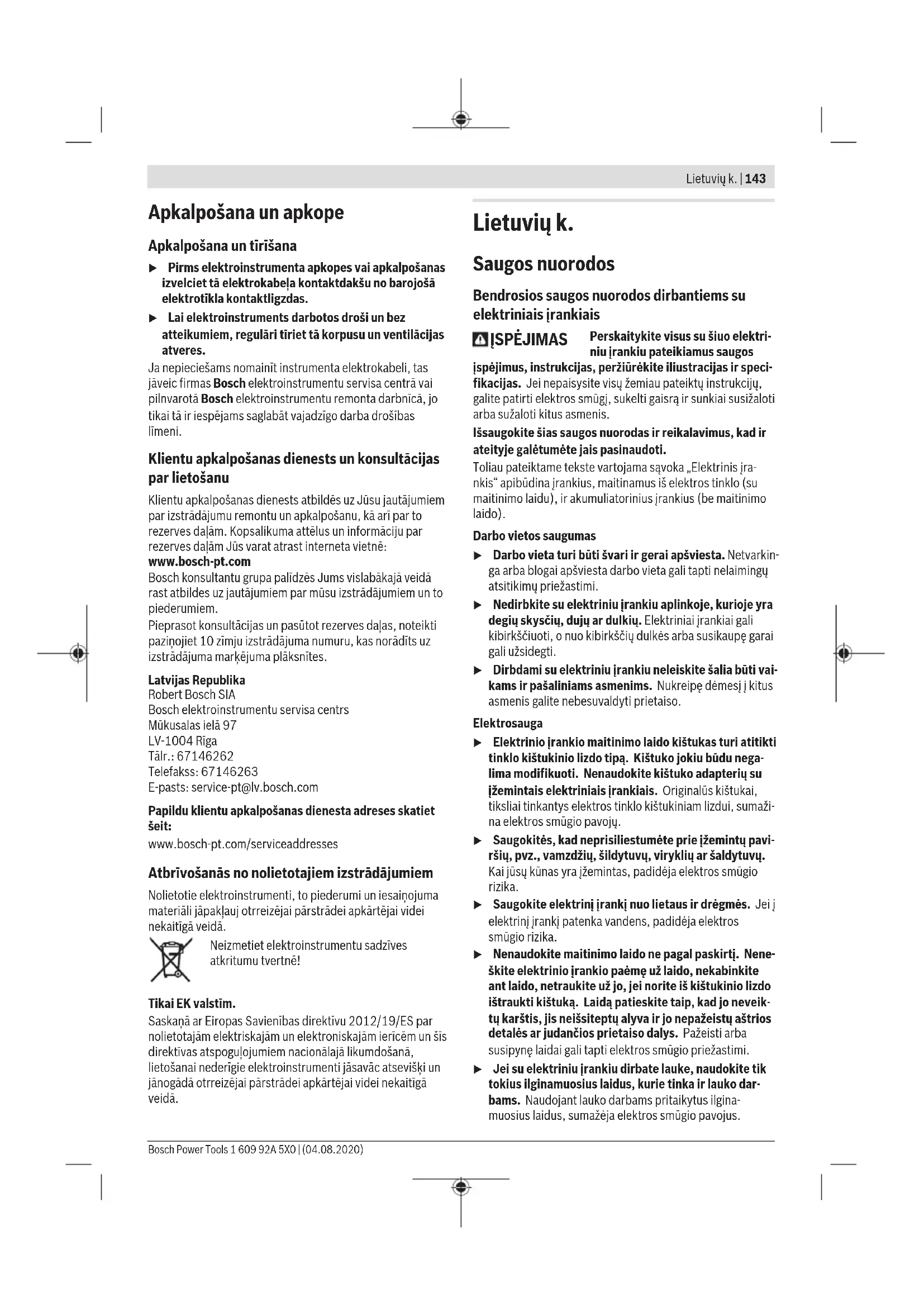 ES atitikties deklaracija Atsakingai pareiškiame, kad išvardyti gaminiai atitinka visus privalomus že- miau nurodytų direktyvų ir reglamentų reikalavimus ir šiuos standartus. Techninė dokumentacija saugoma: * Šlifavimo-galan- dimo mašina su dviem diskais Gaminio numeris GBG60-20 3601B7A4. 2006/42/EC 2014/30/EU 2011/65/EU EN 62841-1:2015 EN 62841-3-4:2016+A11:2017 +A1:2020+A12:2020 EN 55014-1:2017+A11:2020 EN 55014-2:2015