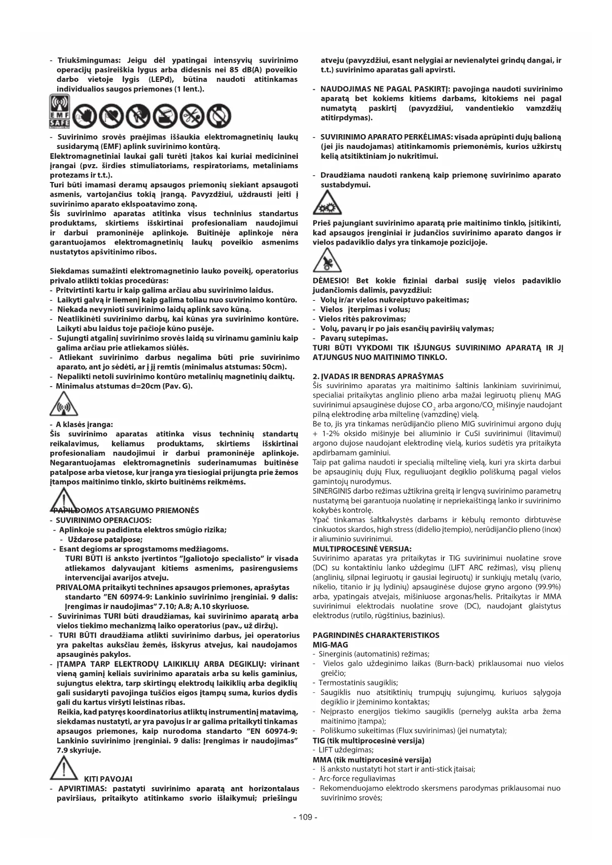 Operatorius turi būti pakankamai susipažinęs su saugiu suvirinimo aparato naudojimu ir informuotas apie riziką, susijusią su lankinio suvirinimo darbais, taip pat apie atitinkamas apsaugos priemones ir veiksmus avarinių situacijų atveju. (Remtis ir standartu ”EN 60974-9: Lankinio suvirinimo įrenginiai. 9 dalis: Įrengimas ir naudojimas”). - Vengti tiesioginio kontakto su suvirinimo kontūru; generatoriaus tiekiama tuščios eigos įtampa tam tikromis sąlygomis gali būti pavojinga. - Suvirinimo laidų sujungimas, patikrinimo ir remonto darbai turi būti atliekami išjungus suvirinimo aparatą ir jį atjungus nuo maitinimo tinklo. - Išjungti suvirinimo aparatą ir atjungti nuo maitinimo tinklo prieš keičiant nusidėvėjusias degiklio dalis. - Elektros instaliacija turi būti atliekama laikantis galiojančių darbo saugos reikalavimų ir įstatymų. - Suvirinimo aparatas turi būti prijungtas prie maitinimo sistemos tik neutraliu laidu su įžeminimu. - Įsitikinti, kad kištukas yra taisyklingai įkištas į įžemintą lizdą. - Nenaudoti suvirinimo aparato drėgnose arba šlapiose vietose ar lyjant lietui. - Nenaudoti laidų su pažeista izoliacija arba blogu kontaktu sujungimo vietose. - Nevirinti ant taros, indų arba vamzdžių, kuriuose yra, arba buvo laikomi degūs skysčiai arba dujos. - Vengti atlikti darbus ant medžiagų, kurios buvo valytos chloruotais tirpikliais, taip pat nedirbti netoliese minėtų medžiagų. - Neatlikinėti suvirinimo darbų ant indų, kuriuose yra aukštas slėgis. - Pašalinti iš darbo vietos visas degias medžiagas (pavyzdžiui, medieną, popierių, skudurus, ir t. t.). - Užtikrinti tinkamą ventiliaciją arba naudoti įrangą, skirtą suvirinimo metu šalia lanko susidarantiems dūmams pašalinti; būtina sistemingai vertinti suvirinimo dūmų kiekio limitus, priklausomai nuo dūmų sudėties, koncentracijos ir jų išsilaikymo trukmės. - Laikyti balioną atokiau nuo šilumos šaltinių, tame tarpe ir saulės spindulių (jei naudojama). - Pritaikyti tinkamą elektros izoliaciją degiklio, apdirbamo gaminio bei kitų galimų įžemintų metalinių detalių, esančių darbo prieigose (pasiekiamų), atžvilgiu. Tai paprastai pasiekiama dėvint šiam darbui skirtas apsaugines pirštines, avalynę, galvos apdangalą ir kitą darbinę aprangą, bei naudojant izoliacines plokštes ar specialius paklotus. - Visada apsaugoti akis specialiais ltrais, atitinkančiais UNI EN 169 arba UNI EN 379 standartus, jie turi būti įmontuoti UNI EN 175 standartą atitinkančiose kaukėse arba šalmuose. Dėvėti specialią nedegią apsauginę aprangą (atitinkančią standarto UNI EN 11611 reikalavimus) bei suvirintojo pirštines (atitinkančias standarto UNI EN 12477 reikalavimus), tokiu būdu bus išvengiama ultravioletinių ir infraraudonųjų spindulių, kuriuos sąlygoja lankas, poveikio epidermiui; apsauga turi būti išplėsta neatspindinčių ekranų arba užuolaidų pagalba ir kitiems asmenims, kurie yra lanko prieigose.- 109 - - Triukšmingumas: Jeigu dėl ypatingai intensyvių suvirinimo operacijų pasireiškia lygus arba didesnis nei 85 dB(A) poveikio darbo vietoje lygis (LEPd), būtina naudoti atitinkamas individualios saugos priemones (1 lent.). - Suvirinimo srovės praėjimas iššaukia elektromagnetinių laukų susidarymą (EMF) aplink suvirinimo kontūrą. Elektromagnetiniai laukai gali turėti įtakos kai kuriai medicininei įrangai (pvz. širdies stimuliatoriams, respiratoriams, metaliniams protezams ir t.t.). Turi būti imamasi deramų apsaugos priemonių siekiant apsaugoti asmenis, vartojančius tokią įrangą. Pavyzdžiui, uždrausti įeiti į suvirinimo aparato eklspoatavimo zoną. Šis suvirinimo aparatas atitinka visus techninius standartus produktams, skirtiems išskirtinai profesionaliam naudojimui ir darbui pramoninėje aplinkoje. Buitinėje aplinkoje nėra garantuojamos elektromagnetinių laukų poveikio asmenims nustatytos apšvitinimo ribos. Siekdamas sumažinti elektromagnetinio lauko poveikį, operatorius privalo atlikti tokias procedūras: - Pritvirtinti kartu ir kaip galima arčiau abu suvirinimo laidus. - Laikyti galvą ir liemenį kaip galima toliau nuo suvirinimo kontūro. - Niekada nevynioti suvirinimo laidų aplink savo kūną. - Neatlikinėti suvirinimo darbų, kai kūnas yra suvirinimo kontūre. Laikyti abu laidus toje pačioje kūno pusėje. - Sujungti atgalinį suvirinimo srovės laidą su virinamu gaminiu kaip galima arčiau prie atliekamos siūlės. - Atliekant suvirinimo darbus negalima būti prie suvirinimo aparato, ant jo sėdėti, ar į jį remtis (minimalus atstumas: 50cm). - Nepalikti netoli suvirinimo kontūro metalinių magnetinių daiktų. - Minimalus atstumas d=20cm (Pav. G). - A klasės įranga: Šis suvirinimo aparatas atitinka visus techninių standartų reikalavimus, keliamus produktams, skirtiems išskirtinai profesionaliam naudojimui ir darbui pramoninėje aplinkoje. Negarantuojamas elektromagnetinis suderinamumas buitinėse patalpose arba vietose, kur įranga yra tiesiogiai prijungta prie žemos įtampos maitinimo tinklo, skirto buitinėms reikmėms.