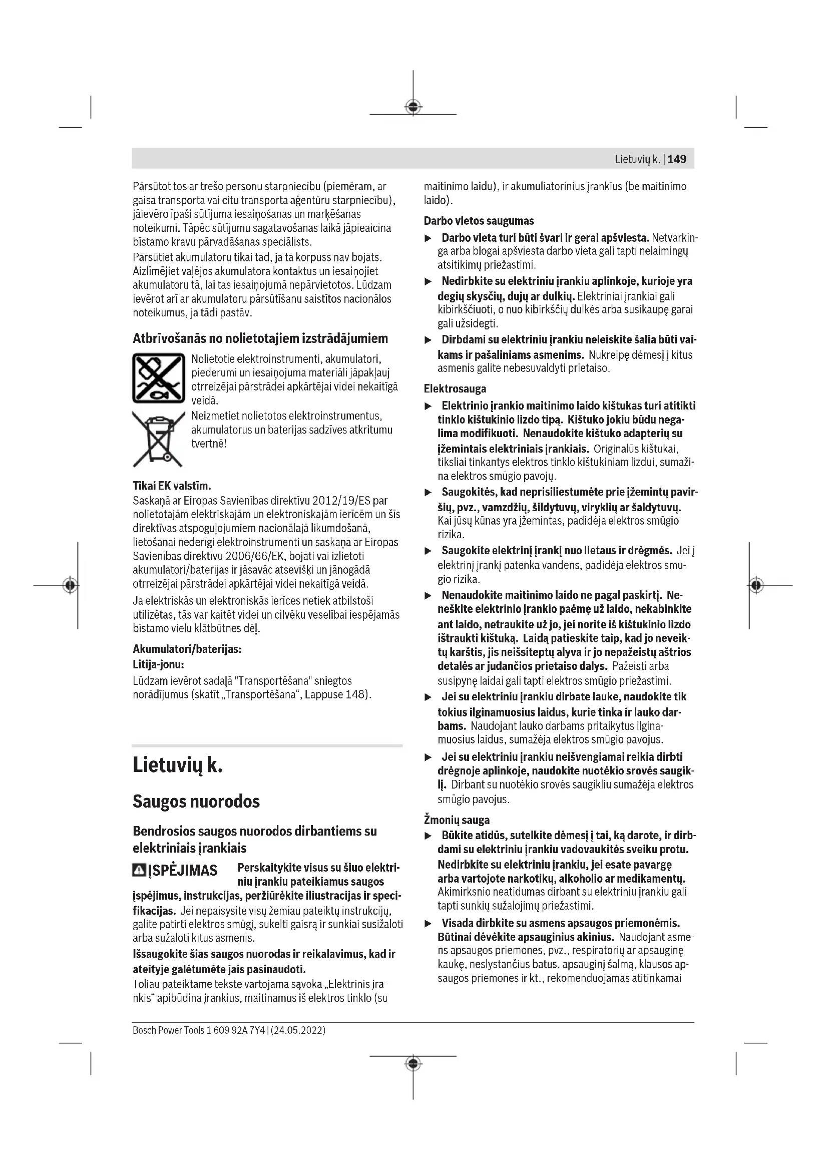 Šioje instrukcijoje pateiktas vibracijos lygis ir triukšmo emisi- ja buvo išmatuoti pagal standartizuotą matavimo metodą, ir juos galima naudoti elektriniams įrankiams palyginti. Jie taip pat skirti vibracijos ir triukšmo emisijai iš anksto įvertinti. Nurodytas vibracijos lygis ir triukšmo emisijos vertė atspindi pagrindinius elektrinio įrankio naudojimo atvejus. Tačiau jei- gu elektrinis įrankis naudojamas kitokiai paskirčiai, su kito- kiais darbo įrankiais arba jeigu jis nepakankamai techniškai prižiūrimas, vibracijos lygis ir triukšmo emisijos vertė gali ki- sti. Tokiu atveju vibracijos ir triukšmo emisija per visą darbo laikotarpį gali žymiai padidėti. Norint tiksliai įvertinti vibracijos ir triukšmo emisiją per tam tikrą darbo laiką, reikia atsižvelgti ir į laiką, per kurį elektrinis įrankis buvo išjungtas arba, nors ir veikė, bet nebuvo naudo- jamas. Tai įvertinus, vibracijos ir triukšmo emisija per visą darbo laiką žymiai sumažės. Dirbančiajam nuo vibracijos poveikio apsaugoti paskirkite papildomas apsaugos priemones, pvz.: elektrinių ir darbo įrankių techninę priežiūrą, rankų šildymą, darbo eigos orga- nizavimą. Montavimas u Prieš atliekant bet kokius elektrinio įrankio priežiūros darbus (atliekant techninę priežiūrą ar keičiant įrankį ir t. t.), o taip pat elektrinį įrankį transportuojant ir sandėliuojant, būtina iš jo išimti akumuliatorių. Prie- šingu atveju galite susižeisti, netyčia nuspaudę įjungimo- išjungimo jungiklį. Akumuliatoriaus įkrovimas u Naudokite tik techninių duomenų skyriuje nurodytus kroviklius. Tik šie krovikliai yra priderinti prie Jūsų elekt- riniame įrankyje naudojamo ličio jonų akumuliatoriaus. Nuoroda: akumuliatorius pristatomas iš dalies įkrautas. Kad akumuliatorius veiktų visa galia, prieš pirmąjį naudojimą aku- muliatorių kroviklyje visiškai įkraukite. Ličio jonų akumuliatorių galima įkrauti bet kada, eksploatavi- mo trukmė dėl to nesutrumpėja. Krovimo proceso nutrauki- mas akumuliatoriui nekenkia. Celių apsaugos sistema „Electronic Cell Protection (ECP)“ saugo ličio jonų akumuliatorių nuo visiškos iškrovos. Kai aku- muliatorius išsikrauna, apsauginis išjungiklis išjungia elektri- nį įrankį. u Išsijungus automatiškai, įjungimo-išjungimo jungiklio nebespauskite. Taip galite sugadinti ličio jonų akumulia- torių. Akumuliatoriaus įkrovos būklės indikatorius Žali akumuliatoriaus įkrovos būklės indikatoriairodo akumu- liatoriausįkrovos būklę. Dėl saugumo, įkrovos būklę galima pažiūrėti tik tada, kai elektrinis įrankis neveikia. Jei norite, kad būtų parodyta įkrovos būklė, paspauskite įkrovos būklės mygtuką arba . Tai galima ir tada, kai akumuliatorius yra išimtas. Jei paspaudus mygtuką nešviečia nei vienas šviesadiodis in- dikatorius, vadinasi akumuliatorius yra pažeistas ir jį reikia pakeisti. Akumuliatoriaus tipas GBA 18V... LEDs Talpa Šviečia nuolat 3× žalias 60−100% Šviečia nuolat 2× žalias 30−60% Šviečia nuolat 1× žalias 5−30% Mirksi 1× žalias 0−5% Akumuliatoriaus tipas ProCORE18V... LEDs Talpa Šviečia nuolat 5× žalias 80−100% Šviečia nuolat 4× žalias 60−80% Šviečia nuolat 3× žalias 40−60 % Šviečia nuolat 2× žalias 20−40 % Šviečia nuolat 1× žalias 5−20 % Mirksi 1× žalias 0−5 % Akumuliatoriaus išėmimas (žr.A1–A2pav.) Akumuliatoriuje(3)yra dvi fiksavimo pakopos, kurios saugo, kad netikėtai paspaudus akumuliatoriaus atblokavimo klavišą(7), akumuliatorius neiškristų. Į elektrinį prietaisą įstatytą akumuliatorių tinkamoje padėtyje palaiko spyruoklė. – Norėdami išimti akumuliatorių(3), paspauskite atblokavi- mo klavišą(7) ir išimkite akumuliatorių iš elektrinio įra- nkio traukdami jį aukštyn. Traukdami nenaudokite jė- gos. Laikykitės pateiktų šalinimo nurodymų. 1 609 92A 7Y4 | (24.05.2022) Bosch Power ToolsLietuvių k. | 153 Pūstuvo papildomos įrangos montavimas (žr.B1–B3pav.) u Prieš pradėdami elektrinio įrankio techninės priežiū- ros, valymo ar reguliavimo darbus, keisdami papildo- mą įrangą arba norėdami elektrinį įrankį sandėliuoti, išimkite akumuliatorių. Ši atsargumo priemonė apsau- gos jus nuo netikėto elektrinio įrankio įsijungimo. Įvairios pūstuvo papildomos įrangos dalių derinimo galimy- bės pateiktos paveikslėlyje. – Papildomos įrangos suduriamąjį užraktą(12) tvirtai įstatykite į variklio korpuso išpjovas(8) arba į ilginamojo vamzdžio(9) išpjovas(8). – Suduriamąjį užraktą ketvirtį sūkio pasukite pagal laik- rodžio rodyklę. Dulkių surinkimo vamzdžio montavimas Išpučiant gręžimo kiaurymes, gręžimo likučiai išpučiami dir- bančiojo kryptimi. Todėl ant gręžimo kiaurymių antgalio(10) rekomenduojama uždėti dulkių surinkimo vamzdį(11). – Dulkių surinkimo vamzdžio(11) išpjovas(13) įstatykite į gręžimo kiaurymių antgalio(10) suduriamąjį užraktą(12). – Dulkių surinkimo vamzdį(11) ketvirtį sūkio pasukite laik- rodžio rodyklės kryptimi. Naudojimas u Prieš pradėdami elektrinio įrankio techninės priežiū- ros, valymo ar reguliavimo darbus, keisdami papildo- mą įrangą arba norėdami elektrinį įrankį sandėliuoti, išimkite akumuliatorių. Ši atsargumo priemonė apsau- gos jus nuo netikėto elektrinio įrankio įsijungimo. Paruošimas naudoti Įjungimas ir išjungimas – Norėdami elektrinį įrankį įjungti, įjungimo-išjungimo jungiklį(1) pasukite į padėtįI arbaII. Padėtis I: lengvų medžiagų pūtimas į norimą vietą. Padėtis II: sunkių medžiagų pūtimas į norimą vietą. – Norėdamiišjungti, įjungimo-išjungimo jungiklį(1) stum- kite iki atramos į padėtį„0“. Darbo patarimai Niekada nepūskite nešvarumų netoli esančių asmenų krypti- mi. Dirbdami elektrinį įrankį visada laikykite apie 3cm virš že- mės. Nepūskite į vieną vietą karštų, degių ir sprogių medži
